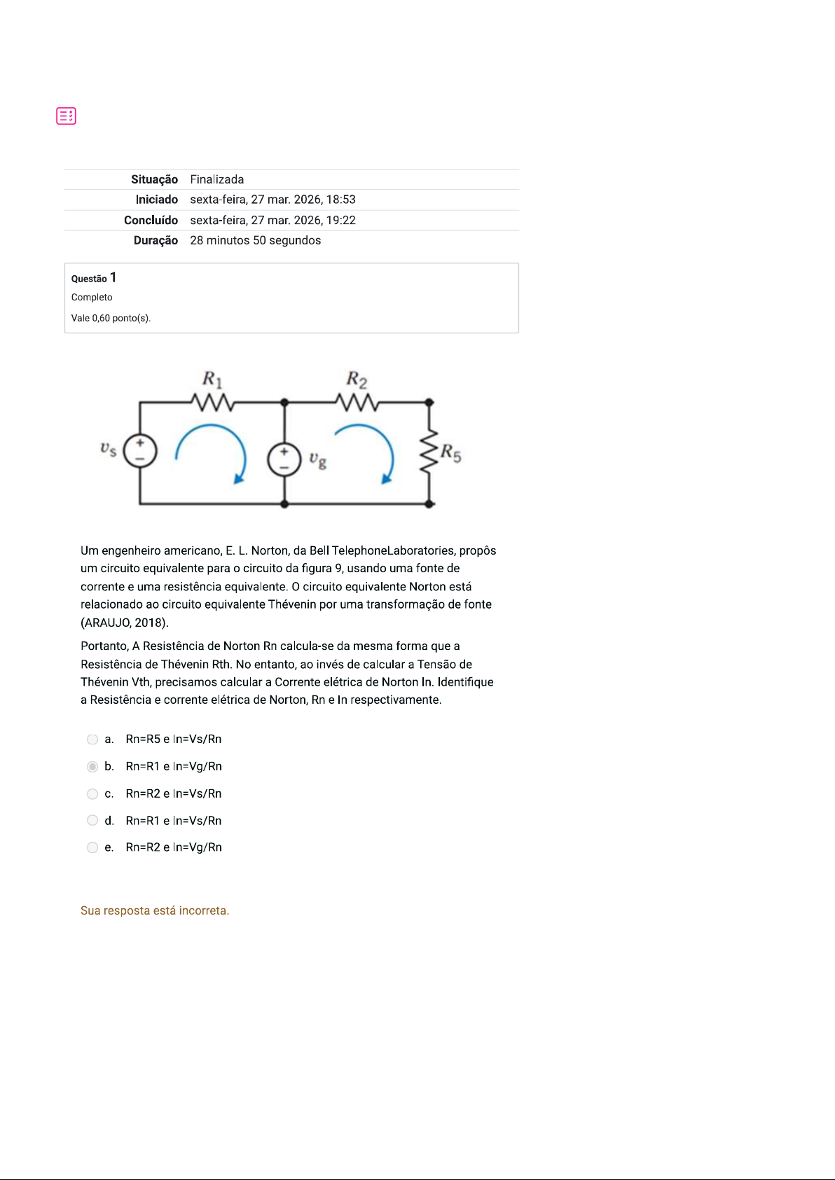 Situação Finalizada Iniciado sexta-feira, 27 mar. 2026, 18:53 Concluído sexta-feira, 27 mar. 2026, 19:22 Duração 28 minutos 50 segundos Questão 1 Completo Vale 0,60 ponto(s). R₁ R₂ + + R₅ Um engenheiro americano, E.L. Norton, da Bell TelephoneLaboratories, propôs um circuito equivalente para o circuito da figura 9, usando uma fonte de corrente e uma resistência equivalente. circuito equivalente Norton está relacionado ao circuito equivalente Thévenin por uma transformação de fonte (ARAUJO, 2018). Portanto, A Resistência de Norton Rn calcula-se da mesma forma que a Resistência de Thévenin Rth. No entanto, ao invés de calcular a Tensão de Thévenin Vth, precisamos calcular a Corrente elétrica de Norton In. Identifique a Resistência e corrente elétrica de Norton, Rn e In respectivamente. a. Rn=R5 e In=Vs/Rn b. Rn=R1 e In=Vg/Rn C. Rn=R2 e In=Vs/Rn d. Rn=R1 e In=Vs/Rn e. Rn=R2 e In=Vg/Rn Sua resposta está incorreta.Questão 2 Completo Vale 0,60 ponto(s). A tensão elétrica, também conhecida como ddp (diferença de potencial), realiza um trabalho sobre a carga, direcionando-a para seguir em um único sentido, até que ocorra a inversão dos terminais. Seu papel da tensão é muito importante e totalmente necessário para que qualquer dispositivo elétrico funcione e cumpra sua tarefa, até mesmo os geradores de energia elétrica necessitam prioritariamente gerar tensão elétrica antes de alimentar qualquer sistema elétrico. Portanto, encontre a definição correta para tensão elétrica nas afirmativas a seguir. a. Deslocamento de cargas elétricas por um meio (superfície). b. A tensão V sobre um resistor é diretamente proporcional à corrente I que flui através do resistor. Quantidade de energia elétrica absorvida ou consumida d. Um trabalho é realizado sobre as cargas para mover uma unidade de carga (1 C) através do elemento, de um terminal ao outro. e. Qualquer dispositivo que apresenta resistência. Sua resposta está incorreta.Questão 3 Completo Vale 0,60 ponto(s). R=9Ω i(t) V 10 mH Podemos analisar um circuito CA (corrente alternada) escrevendo e resolvendo um conjunto de equações simultâneas. Antes de escrever as equações do nó e das malhas, vamos representar o circuito CA no domínio da frequência usando fasores e impedâncias. Portanto, é preciso: 1. Expressar os elementos do circuito em impedâncias no domínio da frequência. 2. Aplicar as leis de Kirchhoff e a lei de Ohm no circuito em corrente alternada com as impedâncias. A Figura ilustra o circuito em corrente alternada com tensão, resistor, indutor e capacitor. Calcule a impedância do capacitor C=1mF e assinale a alternativa correta. a. -100 b. 100 100 -j100 d. -10 e. 10 Sua resposta está correta.Questão 4 Completo Vale 0,60 ponto(s). A corrente contínua (cc) é uma corrente de valor constante. Quando há variação dos valores de corrente elétrica com o tempo, i(t), em diferentes formas, como de uma rampa, uma senoide ou uma exponencial, por exemplo (Figura 1), não temos corrente continua. Nisto, uma corrente elétrica com forma senoidal é chamada de corrente alternada (ca). Todas as correntes e tensões de um circuito de CA (corrente alternada) são senoides de mesma frequência, mas que podem ter diferentes amplitudes e constantes de fase. Um fasor é um número complexo usado para representar a amplitude e o ângulo de fase de uma senoide. 0 fasor é um número complexo na forma polar. Finalmente, o módulo do fasor é igual à amplitude da senoide e o ângulo de fase do fasor é igual ao ângulo de fase da senoide (ALEXANDER et al, 2013). Portanto, faça a conversão do número complexo na forma polar de V=-4+j3 V para a forma retangular, e selecione a alternativa correta. a. 143°V b. 37°V 143°V d. 37°V e. 180°V Sua resposta está correta. Questão 5 Completo Vale 0,60 ponto(s). Uma forma de facilitar a análise de circuitos complexos é transformar as equações que descrevem o circuito do domínio do tempo para o domínio da frequência, realizar a análise e transformar a solução de volta para o domínio do tempo. A representação no domínio do tempo é de acordo com o formato f(t) abaixo, de um sinal de tensão ou de corrente (IRWIN, 2013). Se sabemos que = F(s), também sabemos que = f(t). Nesse caso, dizemos que f(t) e F(s) formam um par de transformadas de Laplace (DORF et al, 2016). Toda a função que sofre uma transição abrupta de 0 para tida como função pulso. Calcule a transformada de Laplace da função g(t)= 3(t-15)u(t-15) e assinale a alternativa correta. a. b. G(s)= d. G(s)= e. G(s)= Sua resposta está correta.Questão 6 Completo Vale 0,60 ponto(s). A potência absorvida ou fornecida por um elemento é o produto da tensão pela corrente que o percorre. Se a potência tem um sinal positivo, ela está sendo fornecida ao elemento ou sendo consumida por ele. Se, por outro lado, a potência tem sinal negativo, a potência está sendo fornecida pelo elemento. A direção da corrente e a polaridade da tensão têm um papel importante na determinação do sinal da potência. Portanto, marque a alternativa correta sobre a Potência Elétrica. a. É qualquer dispositivo que apresenta resistência. b. É a quantidade de energia elétrica absorvida ou consumida. É o trabalho é realizado sobre as cargas para mover uma unidade de carga (1 C) através do elemento, de um terminal ao outro. d. É o deslocamento de cargas elétricas por um meio (superfície). e. É a habilidade do elemento em resistir ao fluxo de corrente elétrica Sua resposta está correta. Questão 7 Completo Vale 0,60 ponto(s). Uma forma de facilitar a análise de circuitos complexos é transformar as equações que descrevem o circuito do domínio do tempo para o domínio da frequência, realizar a análise e transformar a solução de volta para o domínio do tempo. A representação no domínio do tempo é de acordo com o formato f(t) abaixo, de um sinal de tensão ou de corrente 