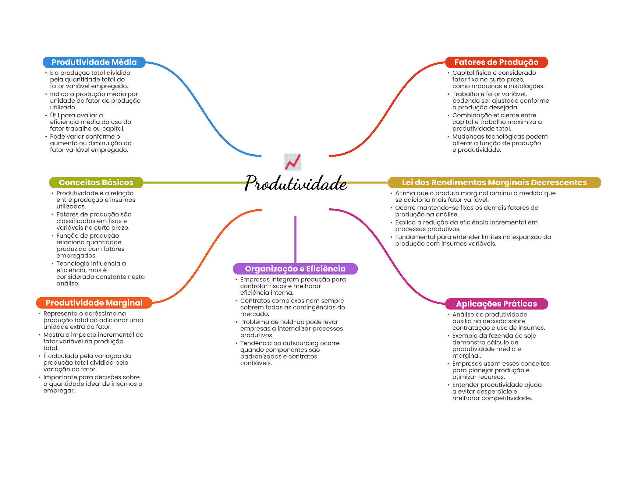 Produtividade Média Fatores de Produção É a produção total dividida Capital físico é considerado pela quantidade total do fator fixo no curto prazo, fator variável empregado. como máquinas e instalações. Indica a produção média por Trabalho é fator variável, unidade do fator de produção podendo ser ajustado conforme utilizado. a produção desejada. Útil para avaliar a Combinação eficiente entre eficiência média do uso do capital e trabalho maximiza a fator trabalho ou capital. produtividade total. Pode variar conforme Mudanças tecnológicas podem aumento ou diminuição do alterar a função de produção fator variável empregado. e produtividade. Conceitos Básicos Produtividade Lei dos Rendimentos Marginais Decrescentes Produtividade é a relação Afirma que produto marginal diminui à medida que entre produção e insumos se adiciona mais fator variável. utilizados. Ocorre mantendo-se fixos demais fatores de Fatores de produção são produção na análise. classificados em fixos e Explica a redução da eficiência incremental em variáveis no curto prazo. processos produtivos. Função de produção Fundamental para entender limites na expansão da relaciona quantidade produção com insumos variáveis. produzida com fatores empregados. Tecnologia influencia a eficiência, mas é Organização e Eficiência considerada constante nesta Empresas integram produção para análise. controlar riscos e melhorar eficiência interna. Produtividade Marginal Contratos complexos nem sempre cobrem todas as contingências do Aplicações Práticas Representa acréscimo na mercado. Análise de produtividade produção total ao adicionar uma Problema de hold-up pode levar auxilia na decisão sobre unidade extra do fator. empresas a internalizar processos contratação e uso de insumos. Mostra impacto incremental do produtivos. Exemplo da fazenda de soja fator variável na produção Tendência ao outsourcing ocorre demonstra cálculo de total. quando componentes são produtividade média e É calculada pela variação da padronizados e contratos marginal. produção total dividida pela confiáveis. Empresas usam esses conceitos variação do fator. para planejar produção e Importante para decisões sobre otimizar recursos. a quantidade ideal de insumos a Entender produtividade ajuda empregar. a evitar desperdício e melhorar competitividade.
