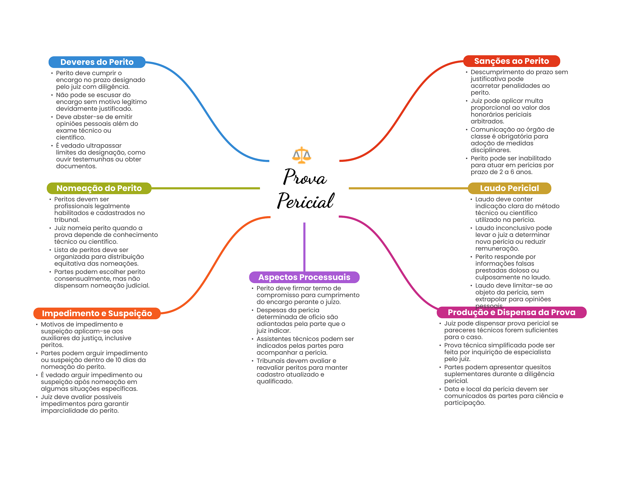 Deveres do Perito Sanções ao Perito Perito deve cumprir Descumprimento do prazo sem encargo no prazo designado justificativa pode pelo juiz com diligência. acarretar penalidades ao Não pode se escusar do perito. encargo sem motivo legítimo Juiz pode aplicar multa devidamente justificado. proporcional ao valor dos Deve abster-se de emitir honorários periciais opiniões pessoais além do arbitrados. exame técnico ou Comunicação ao órgão de científico. classe é obrigatória para É vedado ultrapassar adoção de medidas limites da designação, como disciplinares. ouvir testemunhas ou obter Perito pode ser inabilitado documentos. para atuar em perícias por Prova prazo de 2 a 6 anos. Nomeação do Perito Laudo Pericial Peritos devem ser Pericial Laudo deve conter profissionais legalmente indicação clara do método habilitados e cadastrados no técnico ou científico tribunal. utilizado na perícia. Juiz nomeia perito quando a Laudo inconclusivo pode prova depende de conhecimento levar juiz a determinar técnico ou científico. nova perícia ou reduzir Lista de peritos deve ser remuneração. organizada para distribuição Perito responde por equitativa das nomeações. informações falsas Partes podem escolher perito prestadas dolosa ou consensualmente, mas não Aspectos Processuais culposamente no laudo. dispensam nomeação judicial. Perito deve firmar termo de Laudo deve limitar-se ao compromisso para cumprimento objeto da perícia, sem do encargo perante juízo. extrapolar para opiniões pessoais Impedimento e Suspeição Despesas da perícia determinada de ofício são Produção e Dispensa da Prova Motivos de impedimento e adiantadas pela parte que Juiz pode dispensar prova pericial se suspeição aplicam-se aos juiz indicar. pareceres técnicos forem suficientes auxiliares da justiça, inclusive Assistentes técnicos podem ser para caso. peritos. indicados pelas partes para Prova técnica simplificada pode ser Partes podem arguir impedimento acompanhar a perícia. feita por inquirição de especialista ou suspeição dentro de 10 dias da Tribunais devem avaliar e pelo juiz. nomeação do perito. reavaliar peritos para manter Partes podem apresentar quesitos É vedado arguir impedimento ou cadastro atualizado e suplementares durante a diligência suspeição após nomeação em qualificado. pericial. algumas situações específicas. Data e local da perícia devem ser Juiz deve avaliar possíveis comunicados às partes para ciência e impedimentos para garantir participação. imparcialidade do perito.