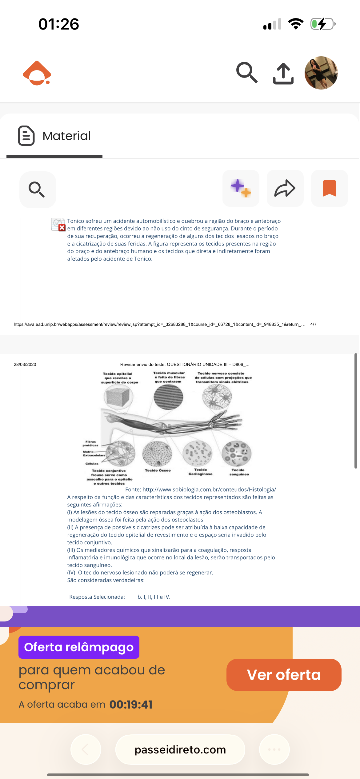 01:26 Material Tonico sofreu um acidente automobilístico e quebrou a região do braço e antebraço em diferentes regiões devido ao não uso do cinto de segurança. Durante período de sua recuperação, ocorreu a regeneração de alguns dos tecidos lesados no braço e a cicatrização de suas feridas. A figura representa os tecidos presentes na região do braço e do antebraço humano e os tecidos que direta e indiretamente foram afetados pelo acidente de Tonico. 28/03/2020 Revisar envio do teste: QUESTIONÁRIO UNIDADE III - D806 Tecido epitelial Tecido muscular Tecido nervoso consiste que recobre feito de fibras de células com projeções que superficie do corpo que contraem transmitem elétricos Fibras protéicas Matrix Extracelulars Tecido conjuntivo Tecido Osseo Tecido Tecido frouxo serve como Carilaginoso sanguineo assoalho para epitelio e outros tecidos Fonte: http://www.sobiologia.com.br/conteudos/Histologia/ A respeito da função e das características dos tecidos representados são feitas as seguintes afirmações: (I) As lesões do tecido ósseo são reparadas graças à ação dos osteoblastos. A modelagem óssea foi feita pela ação dos osteoclastos. (II) A presença de possíveis cicatrizes pode ser atribuída à baixa capacidade de regeneração do tecido epitelial de revestimento e espaço seria invadido pelo tecido conjuntivo. (III) Os mediadores químicos que sinalizarão para a coagulação, resposta inflamatória e imunológica que ocorre no local da lesão, serão transportados pelo tecido sanguíneo. (IV) tecido nervoso lesionado não poderá se regenerar. São consideradas verdadeiras: Resposta Selecionada: b. I, II, III e IV. Oferta relâmpago para quem acabou de Ver oferta comprar A oferta acaba em 00:19:41 passeidireto.com