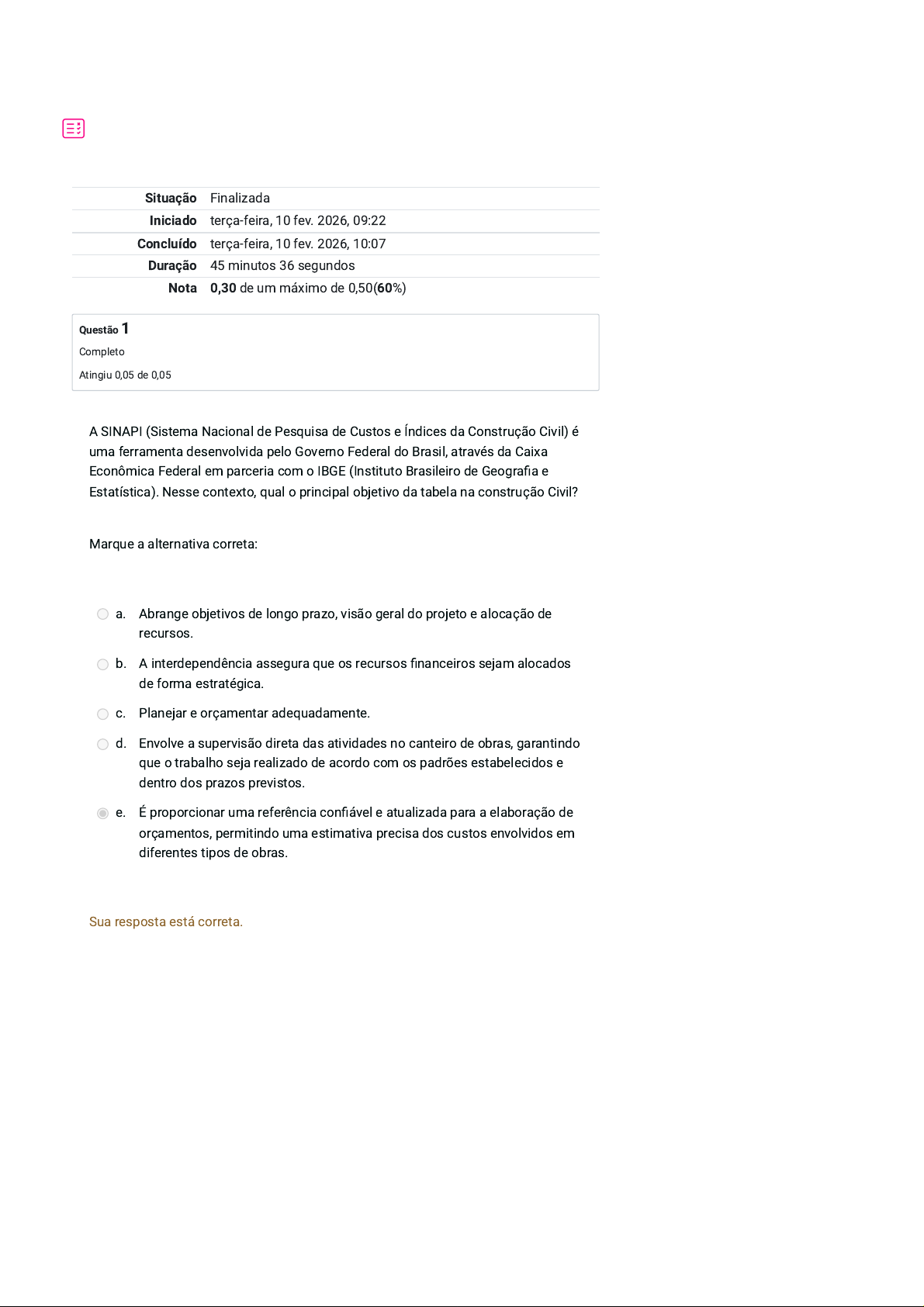 Situação Finalizada Iniciado terça-feira, 10 fev. 2026, 09:22 Concluído terça-feira, 10 fev. 2026, 10:07 Duração 45 minutos 36 segundos Nota 0,30 de um máximo de 0,50(60%) Questão 1 Completo Atingiu 0,05 de 0,05 A SINAPI (Sistema Nacional de Pesquisa de Custos e Índices da Construção Civil) é uma ferramenta desenvolvida pelo Governo Federal do Brasil, através da Caixa Econômica Federal em parceria com o IBGE (Instituto Brasileiro de Geografia e Estatística). Nesse contexto, qual o principal objetivo da tabela na construção Civil? Marque a alternativa correta: a. Abrange objetivos de longo prazo, visão geral do projeto e alocação de recursos. b. A interdependência assegura que os recursos financeiros sejam alocados de forma estratégica. c. Planejar e orçamentar adequadamente. d. Envolve a supervisão direta das atividades no canteiro de obras, garantindo que o trabalho seja realizado de acordo com os padrões estabelecidos e dentro dos prazos previstos. e. É proporcionar uma referência confiável e atualizada para a elaboração de orçamentos, permitindo uma estimativa precisa dos custos envolvidos em diferentes tipos de obras. Sua resposta está correta. Questão 2 Completo Atingiu 0,05 de 0,05 A análise de orçamento de obras é primordial para o sucesso no empreendimento, desse modo temos etapas essenciais no processo de planejamento e execução de projetos de construção. Isso consiste na avaliação minuciosa dos custos associados a cada aspecto do empreendimento, desde a aquisição de materiais até a contratação de mão de obra e serviços especializados. A respeito disso, quais são essas etapas para iniciar uma análise com qualidade? I. Coleta de Informações Iniciais. II. Análise de Custos Diretos e Indiretos. III. Não prever custos adicionais. IV. Análise de Projeto. Assinale a alternativa correta: a. Apenas II e IV estão corretas. b. Apenas III e IV estão corretas. c. Apenas I e II estão corretas. d. Apenas IV está correta. e. Apenas I, II e IV estão corretas. Sua resposta está correta. Questão 3 Completo Atingiu 0,05 de 0,05 Uma abordagem estratégica para a gestão de custos diretos e indiretos envolve a implementação de sistemas de controle financeiro eficazes. Isso inclui a cooperação regular entre os custos reais e os orçados, identificando desvios e tomando medidas corretivas conforme necessário. Além disso, investir em tecnologias e práticas de construção mais eficientes pode ajudar a reduzir os custos diretos com mão de obra e materiais, ao mesmo tempo, em que minimiza os custos indiretos associados a atrasos e retrabalhos. A respeito disso, analise as afirmativas abaixo: I. Os custos unitários são aplicados a uma ampla variedade de itens, desde materiais de construção até mão de obra e equipamentos. II. O custo unitário por metro quadrado de alvenaria representa o valor médio gasto para construir uma área específica de parede, levando em consideração materiais, mão de obra e equipamentos necessários. III. Custos unitários desempenham um papel fundamental na gestão de custos em obras da construção civil. IV. Um dos custos indiretos mais evidentes em qualquer obra são os materiais de construção. V. Custos de aluguel, manutenção e seguro de equipamentos e ferramentas utilizados na obra, como guindastes, betoneiras, andaimes, estão relacionados aos custos diretos. Marque a alternativa correta: a. Apenas I, II e III estão corretas. b. Apenas II e III estão corretas. c. Apenas III e IV estão corretas. d. Apenas IV está correta. e. Apenas I, II, IV e V estão corretas. Sua resposta está correta. Questão 4 Completo Atingiu 0,05 de 0,05 Durante a fase de orçamentação, os custos unitários são utilizados para estimar o custo total do projeto, fornecendo uma base sólida para a tomada de decisões e o planejamento financeiro. Durante a execução do projeto, eles são fundamentais para monitorar e controlar os gastos, garantindo que o projeto permaneça dentro do orçamento estabelecido. A respeito disso, analise as afirmativas abaixo: I. O custo total de produção ou execução de um tipo de serviço é dividido pelo número total de unidades produzidas, ou serviços prestados. II. O custo total de produção ou execução de um tipo de serviço é multiplicado pelo número total de unidades produzidas, ou serviços prestados. III. É importante realizar esses cálculos com precisão, pois eles ajudam as empresas a entenderem seus custos de produção, definir preços de venda, tomar decisões de investimento e avaliar a eficiência operacional. IV. Os custos indiretos, como despesas administrativas e equipamentos, constituem uma parte oculta, porém essencial, do panorama financeiro. V. O custo total de produção ou execução de um tipo de serviço é dividido pelo número total de funcionários. Marque a alternativa correta: a. Apenas III e IV estão corretas. b. Apenas I, III e IV estão corretas. c. Apenas II e III estão corretas. d. Apenas II, III, IV e V está correta. e. As alternativas I, II, III, IV e V estão corretas. Sua resposta está correta. Questão 5 Completo Atingiu 0,05 de 0,05 Uma gestão eficaz de custos em obras envolve não apenas a identificação e controle dos custos diretos, mas também a análise e alocação adequada dos custos indiretos. Somente assim é possível garantir uma visão abrangente e precisa dos custos totais do projeto, garantindo sua viabilidade financeira e sucesso na entrega. A respeito disso, analise as afirmativas abaixo: I. Custos diretos são aqueles que podem ser atribuídos diretamente a um item específico do projeto. II. Custos indiretos englobam despesas gerais do empreendimento, como aluguel de equipamentos e taxas de licenciamento. III. Custos indiretos diretos são aqueles que podem ser atribuídos diretamente a um item específico do projeto. IV. Dentro do custo direto temos mão de obras e materiais. V. Custo Indiretos garant