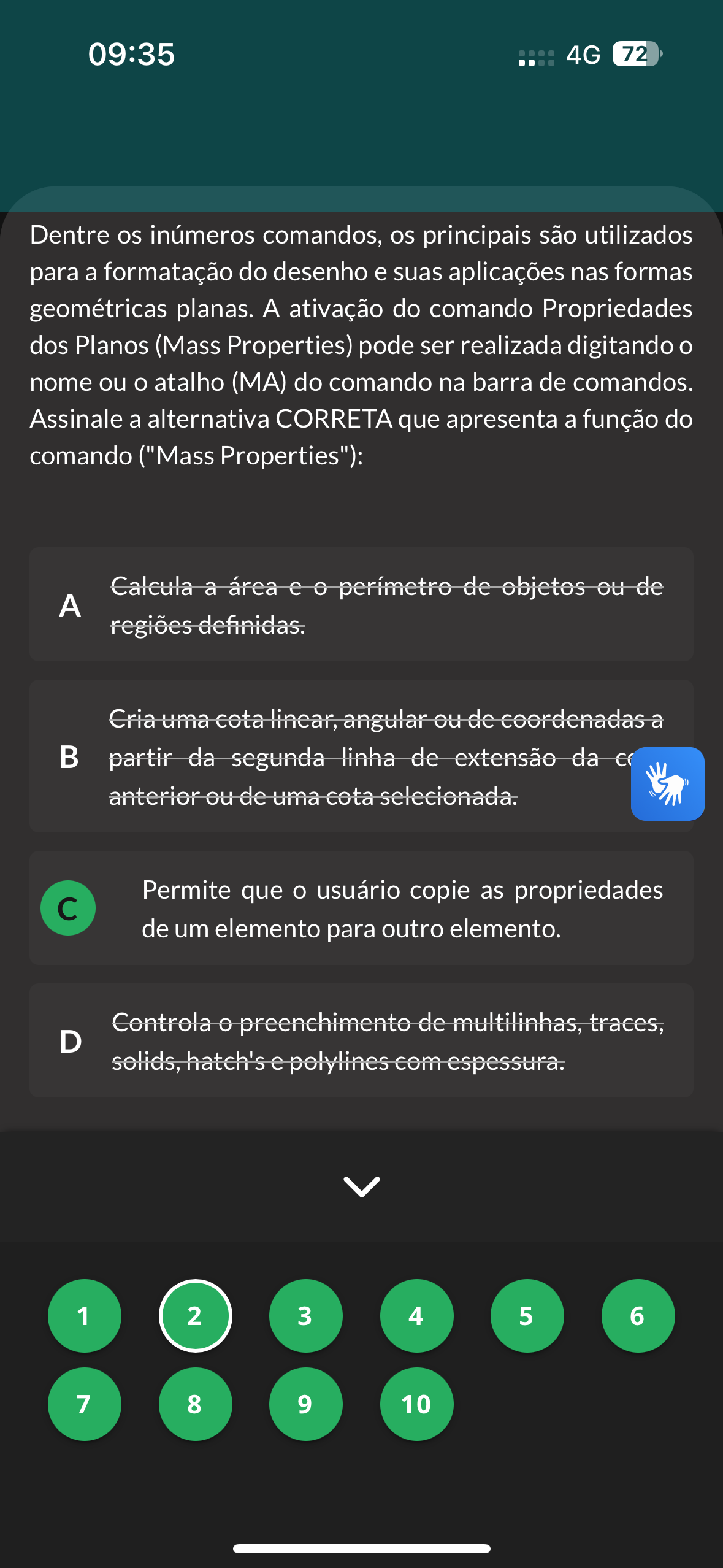 09:35 4G 72 Dentre os inúmeros comandos, os principais são utilizados para a formatação do desenho e suas aplicações nas formas geométricas planas. A ativação do comando Propriedades dos Planos (Mass Properties) pode ser realizada digitando nome ou atalho (MA) do comando na barra de comandos. Assinale a alternativa CORRETA que apresenta a função do comando ("Mass Properties"): Calcula a área perímetro de objetos ou de A regiões definidas. Cria uma cota linear, angular ou de coordenadas a partir da segunda linha de extensão da anterior ou de uma cota selecionada. Permite que usuário copie as propriedades de um elemento para outro elemento. Controla preenchimento de multilinhas, traces, D solids, hatch's e polylines com espessura. 1 2 3 4 5 6 7 8 9 10