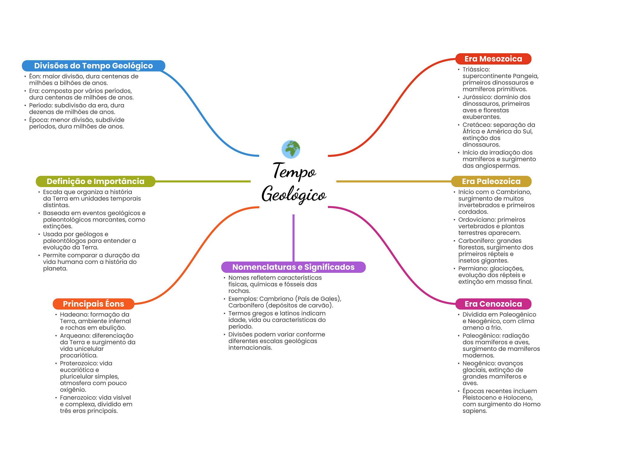 Era Mesozoica Divisões do Tempo Geológico Triássico: Éon: maior divisão, dura centenas de supercontinente Pangeia, milhões a bilhões de anos. primeiros dinossauros e Era: composta por vários períodos, mamíferos primitivos. dura centenas de milhões de anos. Jurássico: domínio dos Período: subdivisão da era, dura dinossauros, primeiras dezenas de milhões de anos. aves e florestas Época: menor divisão, subdivide exuberantes. períodos, dura milhões de anos. Cretáceo: separação da África e América do Sul, extinção dos dinossauros. Início da irradiação dos mamíferos e surgimento Tempo das angiospermas. Definição e Importância Era Paleozoica Escala que organiza a história da Terra em unidades temporais Geológico Início com Cambriano, surgimento de muitos distintas. invertebrados e primeiros Baseada em eventos geológicos e cordados. paleontológicos marcantes, como Ordoviciano: primeiros extinções. vertebrados e plantas Usada por geólogos e terrestres aparecem. paleontólogos para entender a Carbonífero: grandes evolução da Terra. florestas, surgimento dos Permite comparar a duração da primeiros répteis e vida humana com a história do insetos gigantes. planeta. Nomenclaturas e Significados Permiano: glaciações, Nomes refletem características evolução dos répteis e físicas, químicas e fósseis das extinção em massa final. rochas. Exemplos: Cambriano (País de Gales), Principais Éons Carbonífero (depósitos de carvão). Era Cenozoica Hadeano: formação da Termos gregos e latinos indicam Dividida em Paleogênico Terra, ambiente infernal idade, vida ou características do e Neogênico, com clima e rochas em ebulição. período. ameno a frio. Arqueano: diferenciação Divisões podem variar conforme Paleogênico: radiação da Terra e surgimento da diferentes escalas geológicas dos mamíferos e aves, vida unicelular internacionais. surgimento de mamíferos procariótica. modernos. Proterozoico: vida Neogênico: avanços eucariótica e glaciais, extinção de pluricelular simples, grandes mamíferos e atmosfera com pouco aves. oxigênio. Épocas recentes incluem Fanerozoico: vida visível Pleistoceno e Holoceno, e complexa, dividido em com surgimento do Homo três eras principais. sapiens.