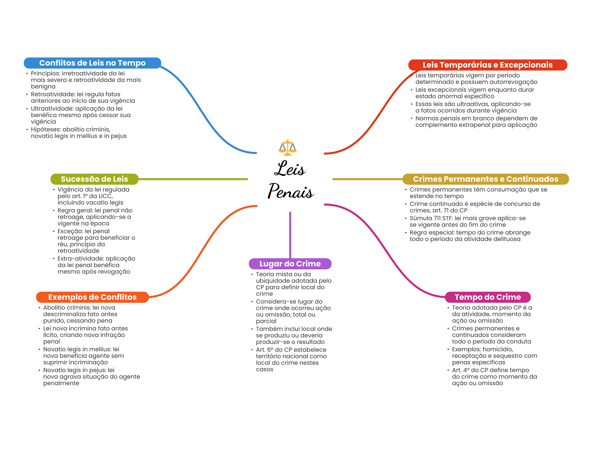 Conflitos de Leis no Tempo Leis Temporárias e Excepcionais Princípios: irretroatividade da lei Leis temporárias vigem por período mais severa e retroatividade da mais determinado e possuem autorrevogação benigna Leis excepcionais vigem enquanto durar Retroatividade: lei regula fatos estado anormal específico anteriores ao início de sua vigência Essas leis são ultraativas, aplicando-se Ultraatividade: aplicação da lei a fatos ocorridos durante vigência benéfica mesmo após cessar sua vigência Normas penais em branco dependem de complemento extrapenal para aplicação Hipóteses: abolitio criminis, novatio legis in mellius e in pejus Leis Sucessão de Leis Crimes Permanentes e Continuados Vigência da lei regulada Penais Crimes permanentes têm consumação que se pelo art. 1° da LICC, estende no tempo incluindo vacatio legis Crime continuado é espécie de concurso de Regra geral: lei penal não crimes, art. 71 do CP retroage, aplicando-se a Súmula 711 STF: lei mais grave aplica-se vigente na época se vigente antes do fim do crime Exceção: lei penal Regra especial: tempo do crime abrange retroage para beneficiar O todo período da atividade delituosa réu, princípio da retroatividade Extra-atividade: aplicação da lei penal benéfica Lugar do Crime mesmo após revogação Teoria mista ou da ubiquidade adotada pelo CP para definir local do crime Exemplos de Conflitos Considera-se lugar do Tempo do Crime Abolitio criminis: lei nova crime onde ocorreu ação Teoria adotada pelo CP é a descriminaliza fato antes ou omissão, total ou da atividade, momento da punido, cessando pena parcial ação ou omissão Lei nova incrimina fato antes Também inclui local onde Crimes permanentes e lícito, criando nova infração se produziu ou deveria continuados consideram penal produzir-se resultado todo período da conduta Novatio legis in mellius: lei Art. 6° do CP estabelece Exemplos: homicídio, nova beneficia agente sem território nacional como receptação e sequestro com suprimir incriminação local do crime nestes penas específicas Novatio legis in pejus: lei casos Art. 4° do CP define tempo nova agrava situação do agente do crime como momento da penalmente ação ou omissão