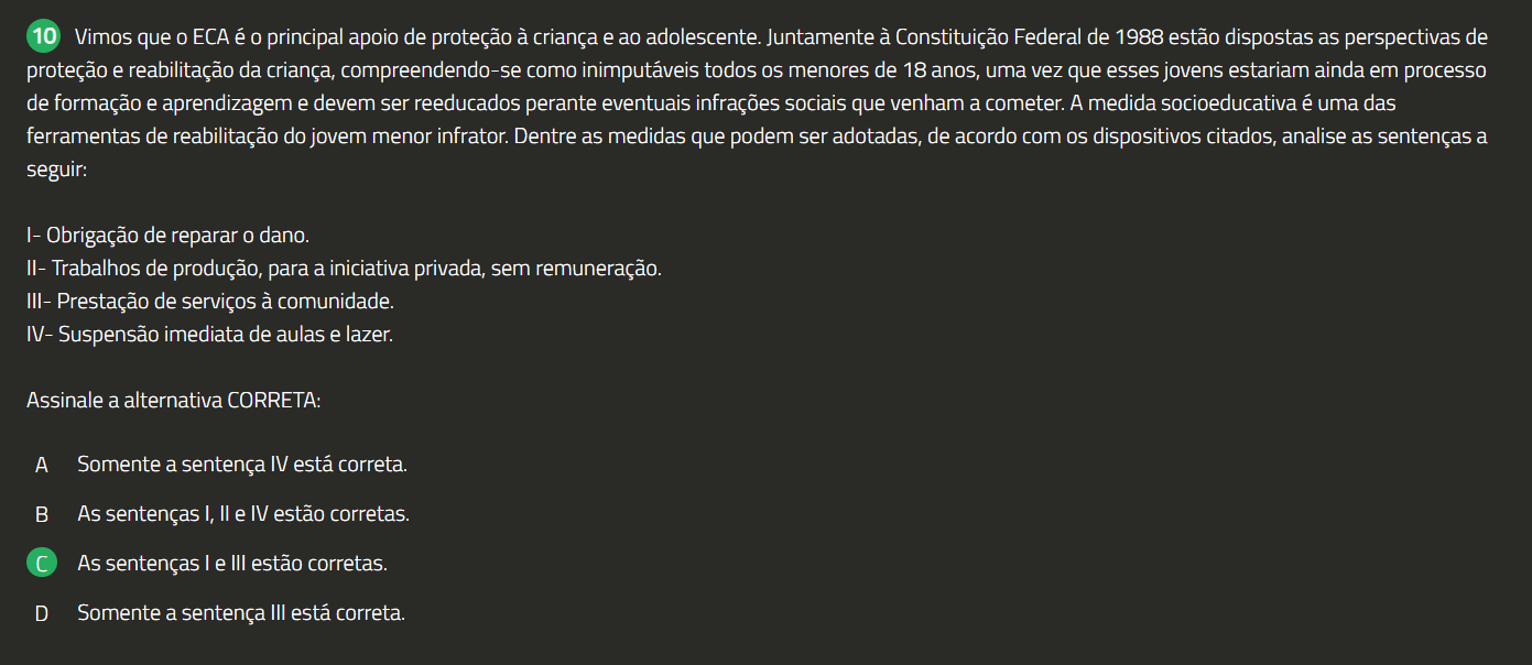 10 Vimos que 0 ECA é 0 principal apoio de proteção à criança e ao adolescente. Juntamente à Constituição Federal de 1988 estão dispostas as perspectivas de proteção e reabilitação da criança, compreendendo-se como inimputáveis todos menores de 18 anos, uma vez que esses jovens estariam ainda em processo de formação e aprendizagem e devem ser reeducados perante eventuais infrações sociais que venham a cometer. A medida socioeducativa é uma das ferramentas de reabilitação do jovem menor infrator. Dentre as medidas que podem ser adotadas, de acordo com dispositivos citados, analise as sentenças a seguir: Obrigação de reparar dano. II- Trabalhos de produção, para a iniciativa privada, sem remuneração. III- Prestação de serviços à comunidade. IV- Suspensão imediata de aulas e lazer. Assinale a alternativa CORRETA: A Somente a sentença IV está correta. B As sentenças I, II e IV estão corretas. As sentenças I e III estão corretas. D Somente a sentença III está correta.