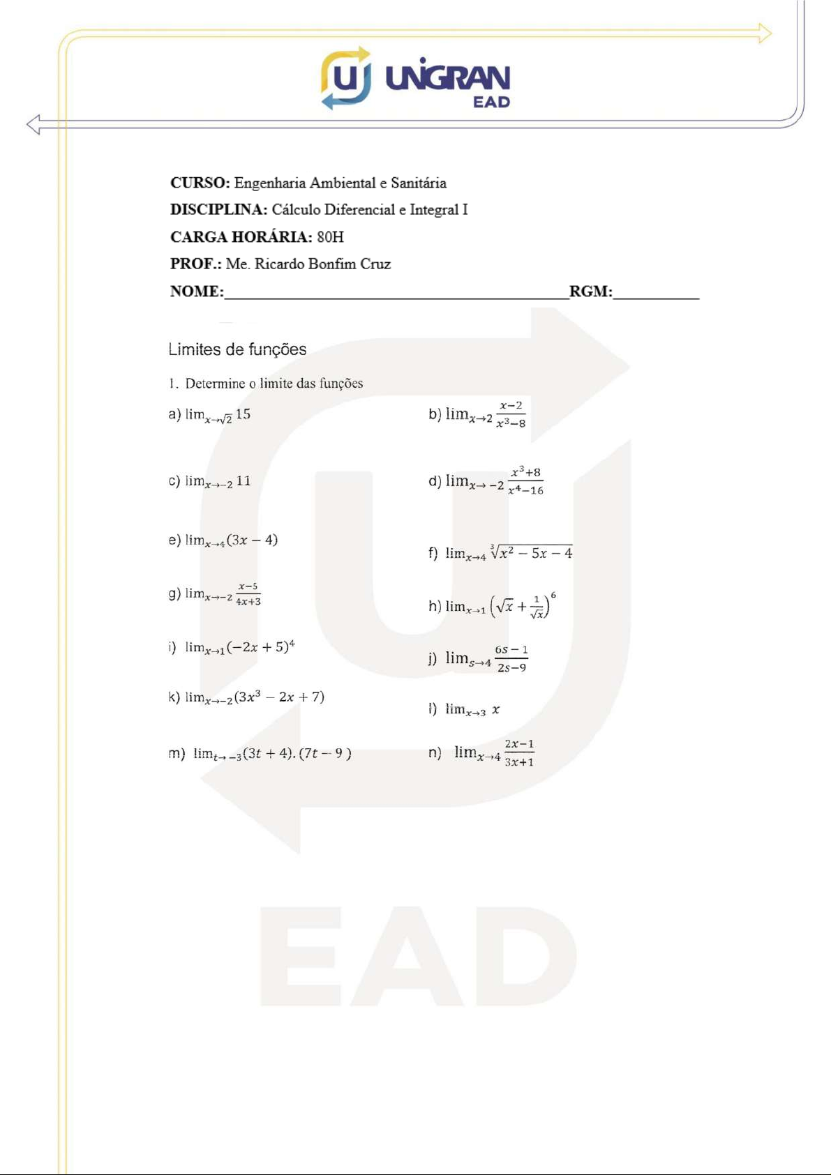 EAD CURSO: Engenharia Ambiental e Sanitária DISCIPLINA: Cálculo Diferencial e Integral I CARGA HORÁRIA: 80H PROF.: Me. Ricardo Bonfim Cruz NOME: RGM: Limites de funções 1. Determine o limite das funções a) b) x-2 c) d) e) f) i) 2s-9 k) I) n) EADu UNGRAN EAD Limites no infinito 2. Seja = |x|, conforme a Figura 1. a) Determinar e b) Conforme teorema, existe f(x)? Figura 1: Gráfico f(x) = y 0 Fonte: elaborado pelo autor x² +1. para x 2 Figura 2: Gráfico de f(x) AY 5 -2- 2 Fonte: Flemming, 2006, p. 79.u EAD Determinar, se existirem, f(x) e 4. Seja Calcule. a) c) e) b) d) f) 5. Determine limite no infinito, caso exista. a) e) i) b) f) j) c) g) k) d) h) 1) EAD