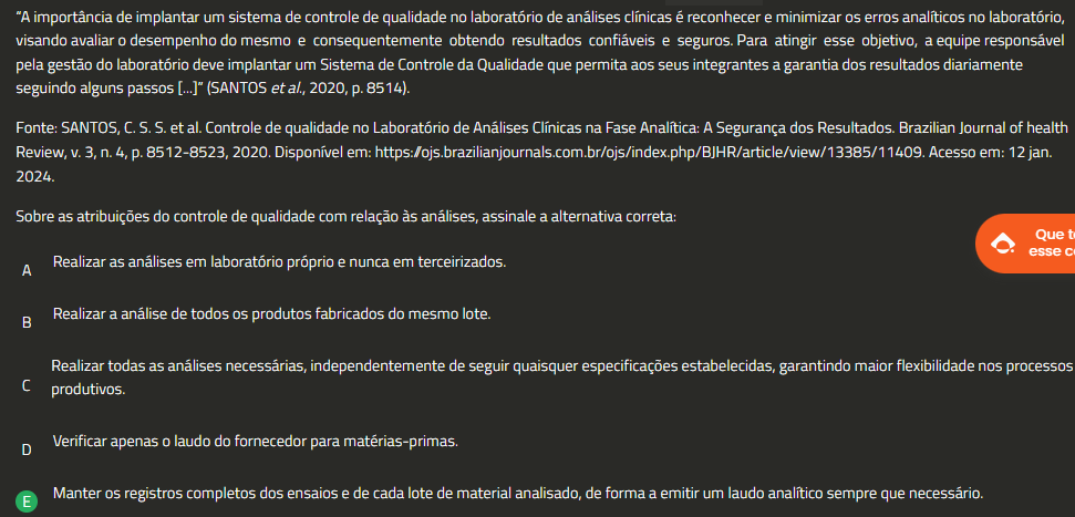 "A importância de implantar um sistema de controle de qualidade no laboratório de análises clínicas é reconhecer e minimizar erros analíticos no laboratório, visando avaliar 0 desempenho do mesmo e consequentemente obtendo resultados confiáveis e seguros. Para atingir esse objetivo, a equipe responsável pela gestão do laboratório deve implantar um Sistema de Controle da Qualidade que permita aos seus integrantes a garantia dos resultados diariamente seguindo alguns passos [...]" (SANTOS et al., 2020, 8514). Fonte: SANTOS, C.S.S. et al. Controle de qualidade no Laboratório de Análises Clínicas na Fase Analítica: A Segurança dos Resultados. Brazilian Journal of health Review, V. 3, n. 4, 8512-8523, 2020. Disponível em: https:/ojs.brazilianjournals.com.br/ojs/index.php/BJHR/article/view/13385/1140 Acesso em: 12 jan. 2024. Sobre as atribuições do controle de qualidade com relação às análises, assinale a alternativa correta: Que esse A Realizar as análises em laboratório próprio e nunca em terceirizados. B Realizar a análise de todos produtos fabricados do mesmo lote. Realizar todas as análises necessárias, independentemente de seguir quaisquer especificações estabelecidas, garantindo maior flexibilidade nos processos produtivos. D Verificar apenas 0 laudo do fornecedor para matérias-primas. E Manter registros completos dos ensaios e de cada lote de material analisado, de forma a emitir um laudo analítico sempre que necessário.