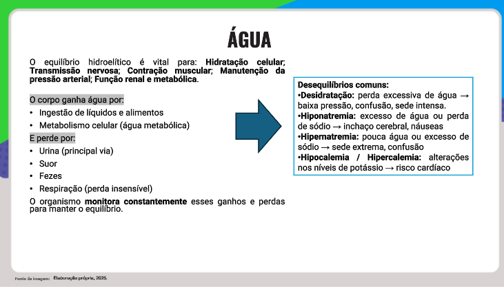 ÁGUA equilibrio hidroelítico é vital para: Hidratação celular; Transmissão nervosa; Contração muscular; Manutenção da pressão arterial; Função renal e Desequilibrios comuns: O corpo ganha por: Desidratação: perda excessiva de agua baixa pressão, confusão, sede intensa. Ingestão de líquidos e alimentos Hiponatremia: excesso de agua ou perda Metabolismo celular de sodio inchaço cerebral, nauseas E perde por: Hipernatremia: pouca ou excesso de Urina (principal via) sodio sede extrema, confusão Hipocalemia / Hipercalemia: alterações Suor nos de potássio risco Fezes Respiração (perda insensivel) 0 organismo monitora constantemente esses ganhos e perdas para manter equilibrio.