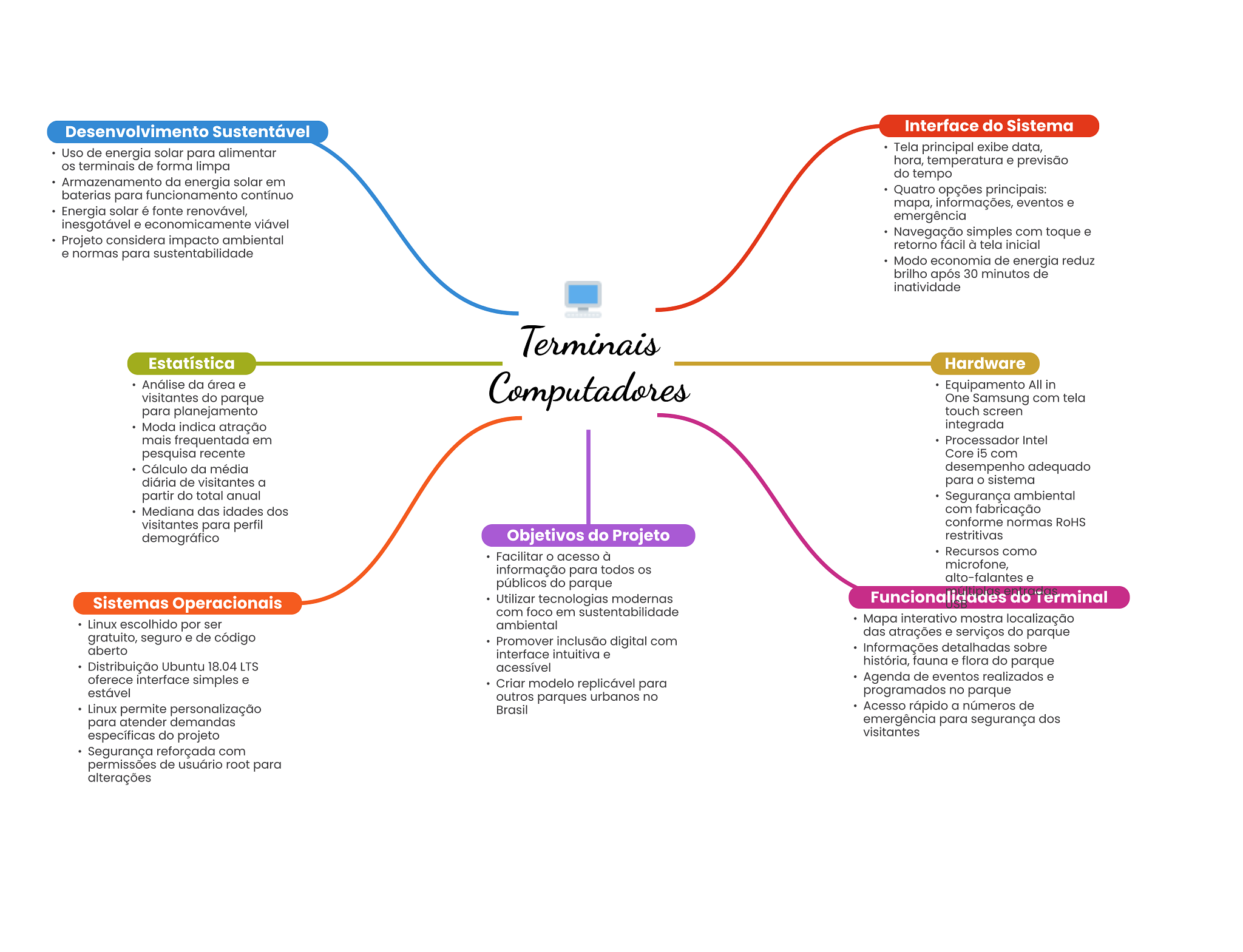 Desenvolvimento Sustentável Interface do Sistema Uso de energia solar para alimentar Tela principal exibe data, terminais de forma limpa hora, temperatura e previsão do tempo da energia solar em baterias para funcionamento contínuo Quatro opções principais: informações, eventos e Energia solar é fonte renovável, emergência inesgotável e economicamente viável Navegação simples com toque e Projeto considera impacto ambiental retorno fácil à tela inicial e normas para sustentabilidade Modo economia de energia reduz brilho após 30 minutos de inatividade Terminais Estatística Hardware Análise da área e Computadores Equipamento All in visitantes do parque One Samsung com tela para planejamento touch screen Moda indica atração integrada mais frequentada em Processador Intel pesquisa recente Core i5 com Cálculo da média desempenho adequado diária de visitantes a para sistema partir do total anual Segurança ambiental Mediana das idades dos com fabricação visitantes para perfil conforme normas RoHS demográfico Objetivos do Projeto restritivas Facilitar acesso à Recursos como informação para todos OS microfone, públicos do parque alto-falantes e Sistemas Operacionais Utilizar tecnologias modernas Funcionalidades do Terminal com foco em sustentabilidade Linux escolhido por ser ambiental interativo mostra localização gratuito, seguro e de código das atrações e serviços do parque Promover inclusão digital com aberto interface intuitiva e Informações detalhadas sobre Distribuição Ubuntu 18.04 LTS acessível história, fauna e flora do parque oferece interface simples e Criar modelo replicável para Agenda de eventos realizados e estável outros parques urbanos no programados no parque Linux permite personalização Brasil Acesso rápido a números de para atender demandas emergência para segurança dos específicas do projeto visitantes Segurança reforçada com permissões de usuário root para alterações