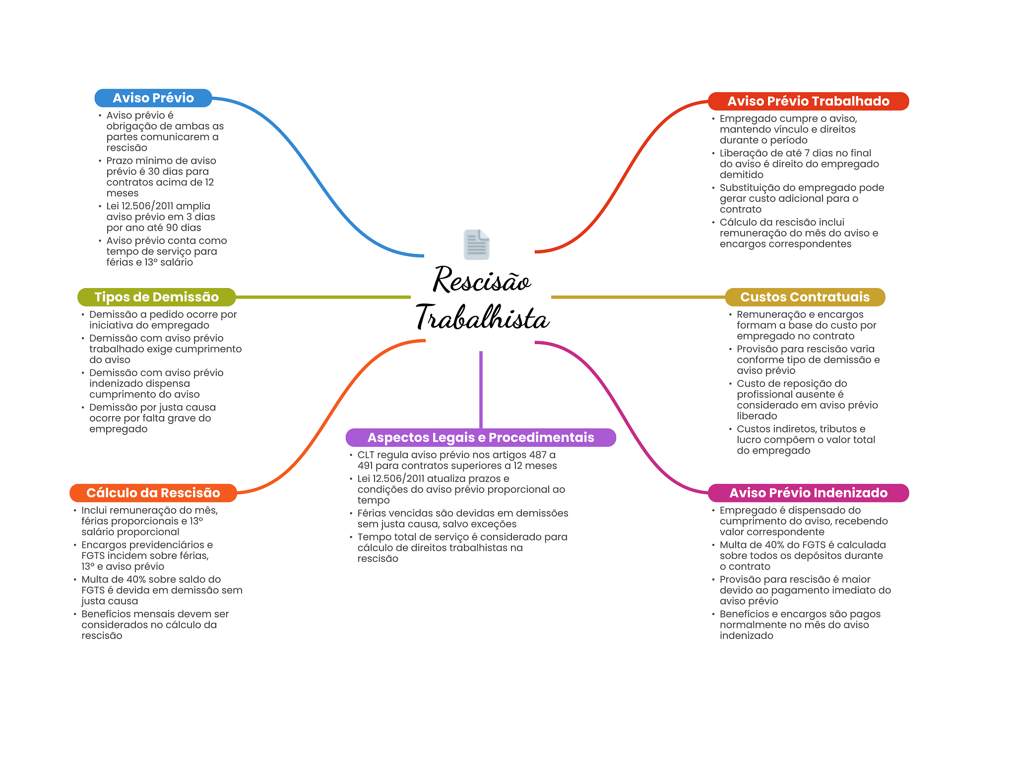 Aviso Prévio Aviso Prévio Trabalhado Aviso prévio é Empregado cumpre aviso, obrigação de ambas as mantendo vínculo e direitos partes comunicarem a durante O período rescisão Liberação de até 7 dias no final Prazo mínimo de aviso do aviso é direito do empregado prévio é 30 dias para demitido contratos acima de 12 Substituição do empregado pode meses gerar custo adicional para Lei 12.506/2011 amplia contrato aviso prévio em 3 dias Cálculo da rescisão inclui por ano até 90 dias remuneração do mês do aviso e Aviso prévio conta como encargos correspondentes tempo de serviço para férias e 13° salário Rescisão Tipos de Demissão Custos Contratuais Demissão a pedido ocorre por iniciativa do empregado Trabalhista Remuneração e encargos formam a base do custo por Demissão com aviso prévio empregado no contrato trabalhado exige cumprimento Provisão para rescisão varia do aviso conforme tipo de demissão e Demissão com aviso prévio aviso prévio indenizado dispensa Custo de reposição do cumprimento do aviso profissional ausente é Demissão por justa causa considerado em aviso prévio ocorre por falta grave do liberado empregado Custos indiretos, tributos e Aspectos Legais e Procedimentais lucro compõem O valor total CLT regula aviso prévio nos artigos 487 a do empregado 491 para contratos superiores a 12 meses Lei 12.506/2011 atualiza prazos e Cálculo da Rescisão condições do aviso prévio proporcional ao Aviso Prévio Indenizado tempo Inclui remuneração do mês, Férias vencidas são devidas em demissões Empregado é dispensado do férias proporcionais e 13° sem justa causa, salvo exceções cumprimento do aviso, recebendo salário proporcional Tempo total de serviço é considerado para valor correspondente Encargos previdenciários e cálculo de direitos trabalhistas na Multa de 40% do FGTS é calculada FGTS incidem sobre férias, rescisão sobre todos os depósitos durante 13° e aviso prévio contrato Multa de 40% sobre saldo do Provisão para rescisão é maior FGTS é devida em demissão sem devido ao pagamento imediato do justa causa aviso prévio Benefícios mensais devem ser Benefícios e encargos são pagos considerados no cálculo da normalmente no mês do aviso rescisão indenizado