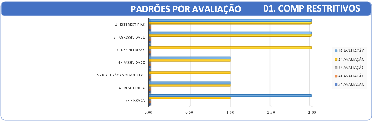 PADRÕES POR AVALIAÇÃO 01. COMP RESTRITIVOS 1 ESTEREOTIPIAS 2 AGRESSIVIDADE 3 DESINTERESSE AVALIAÇÃO AVALIAÇÃO 4 PASSIVIDADE AVALIAÇÃO 5 RECLUSÃO (IS OLAMENT O) AVALIAÇÃO AVALIAÇÃO 6 7 PIRRAÇA 0,00 0,50 1,00 1,50 2,00