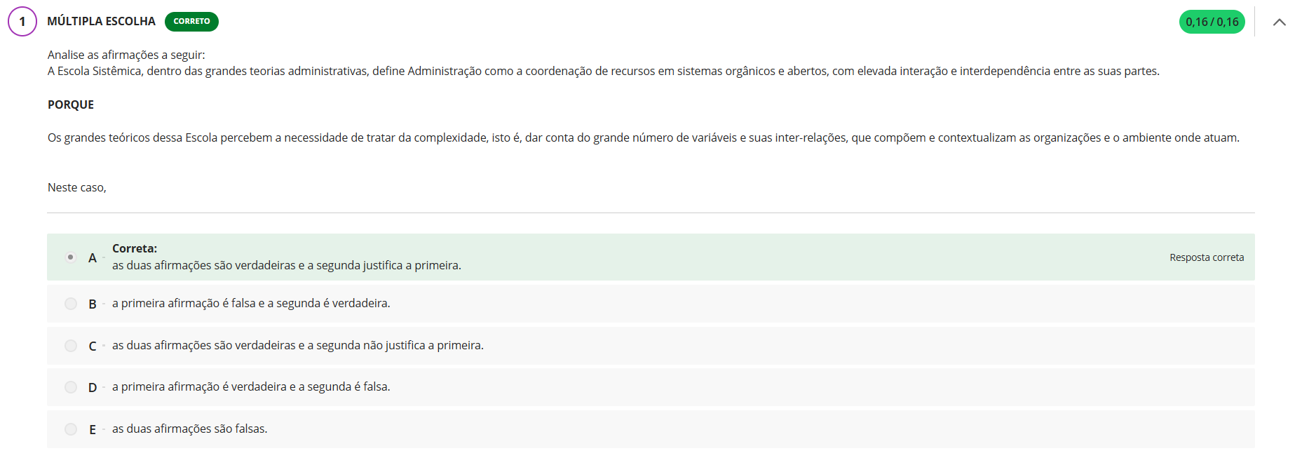 1 MÚLTIPLA ESCOLHA CORRETO 0,16/0,16 Analise as afirmações a seguir: A Escola Sistêmica, dentro das grandes teorias administrativas, define Administração como a coordenação de recursos em sistemas orgânicos e abertos, com elevada interação e interdependência entre as suas partes. PORQUE Os grandes teóricos dessa Escola percebem a necessidade de tratar da complexidade, isto é, dar conta do grande número de variáveis e suas inter-relações, que compõem e contextualizam as organizações e O ambiente onde atuam. Neste caso, Correta: A Resposta correta as duas afirmações são verdadeiras e a segunda justifica a primeira. B a primeira afirmação é falsa e a segunda é verdadeira. as duas afirmações são verdadeiras e a segunda não justifica a primeira. D a primeira afirmação é verdadeira ea segunda é falsa. E as duas afirmações são falsas.
