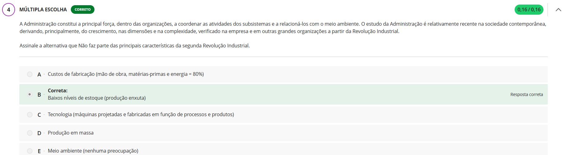4 MÚLTIPLA ESCOLHA CORRETO 0,16/0,16 A Administração constitui a principal força, dentro das organizações, a coordenar as atividades dos subsistemas e a relacioná-los com 0 meio ambiente. 0 estudo da Administração é relativamente recente na sociedade contemporânea, derivando, principalmente, do crescimento, nas dimensões e na complexidade, verificado na empresa e em outras grandes organizações a partir da Revolução Industrial. Assinale a alternativa que Não faz parte das principais características da segunda Revolução Industrial. A Custos de fabricação (mão de obra, matérias-primas e energia = 80%) Correta: B Resposta correta Baixos níveis de estoque (produção enxuta) Tecnologia (máquinas projetadas e fabricadas em função de processos e produtos) D Produção em massa E Meio ambiente (nenhuma preocupação)