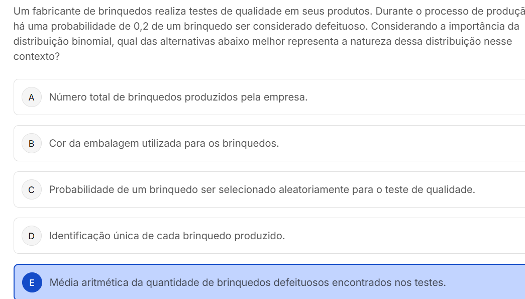 Um fabricante de brinquedos realiza testes de qualidade em seus produtos. Durante processo de produçã há uma probabilidade de 0,2 de um brinquedo ser considerado defeituoso. Considerando a importância da distribuição binomial, qual das alternativas abaixo melhor representa a natureza dessa distribuição nesse contexto? A Número total de brinquedos produzidos pela empresa. B Cor da embalagem utilizada para os brinquedos. C Probabilidade de um brinquedo ser selecionado aleatoriamente para teste de qualidade. D Identificação única de cada brinquedo produzido. E Média aritmética da quantidade de brinquedos defeituosos encontrados nos testes.