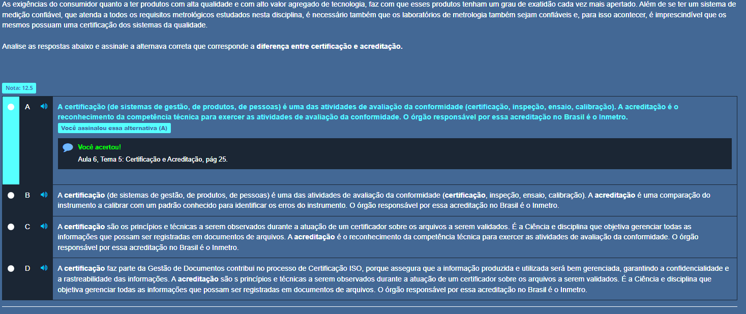 As exigências do consumidor quanto a ter produtos com alta qualidade e com alto valor agregado de tecnologia, faz com que esses produtos tenham um grau de exatidão cada vez mais apertado. Além de se ter um sistema de medição confiável, que atenda a todos requisitos metrológicos estudados nesta disciplina, é necessário também que laboratórios de metrologia também sejam confiáveis e, para isso acontecer, é imprescindível que os mesmos possuam uma certificação dos sistemas da qualidade. Analise as respostas abaixo e assinale a alternava correta que corresponde a diferença entre certificação e acreditação. Nota: 12.5 A A certificação (de sistemas de gestão, de produtos, de pessoas) é uma das atividades de avaliação da conformidade (certificação, inspeção, ensaio, calibração). A acreditação é reconhecimento da competência técnica para exercer as atividades de avaliação da conformidade. órgão responsável por essa acreditação no Brasil é Inmetro. Você assinalou essa alternativa (A) Você acertou! Aula 6, Tema 5: Certificação e Acreditação, pág 25. B A certificação (de sistemas de gestão, de produtos, de pessoas) é uma das atividades de avaliação da conformidade (certificação, inspeção, ensaio, calibração). A acreditação é uma comparação do instrumento a calibrar com um padrão conhecido para identificar os erros do instrumento. órgão responsável por essa acreditação no Brasil é 0 Inmetro. C A certificação são os princípios e técnicas a serem observados durante a atuação de um certificador sobre arquivos a serem validados. É a Ciência e disciplina que objetiva gerenciar todas as informações que possam ser registradas em documentos de arquivos. A acreditação é 0 reconhecimento da competência técnica para exercer as atividades de avaliação da conformidade. órgão responsável por essa acreditação no Brasil é Inmetro. D A certificação faz parte da Gestão de Documentos contribui no processo de Certificação ISO, porque assegura que a informação produzida e utilizada será bem gerenciada, garantindo a confidencialidade e a rastreabilidade das informações. A acreditação são S princípios e técnicas a serem observados durante a atuação de um certificador sobre os arquivos a serem validados. É a Ciência e disciplina que objetiva gerenciar todas as informações que possam ser registradas em documentos de arquivos. órgão responsável por essa acreditação no Brasil é Inmetro.