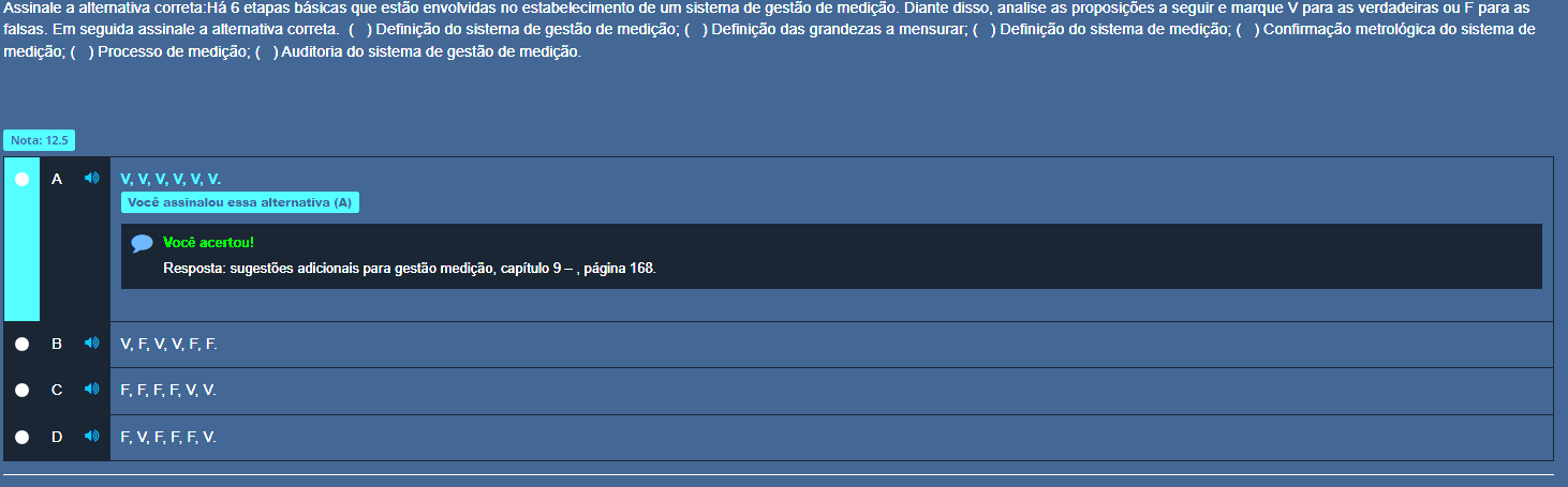Assinale a alternativa correta:Há 6 etapas básicas que estão envolvidas no estabelecimento de um sistema de gestão de medição. Diante disso, analise as proposições a seguir e marque V para as verdadeiras ou F para as falsas. Em seguida assinale a alternativa correta. Definição do sistema de gestão de medição; Definição das grandezas a mensurar; Definição do sistema de medição; Confirmação metrológica do sistema de medição; Processo de medição; Auditoria do sistema de gestão de medição. Nota: 12.5 A V,V,V,V,V,V. Você assinalou essa alternativa (A) Você acertou! Resposta: sugestões adicionais para gestão medição, capítulo 9 . página 168. B V,F,V,V,F,F. C F,F,F,F,V,V. D F,V,F,F,F,V.