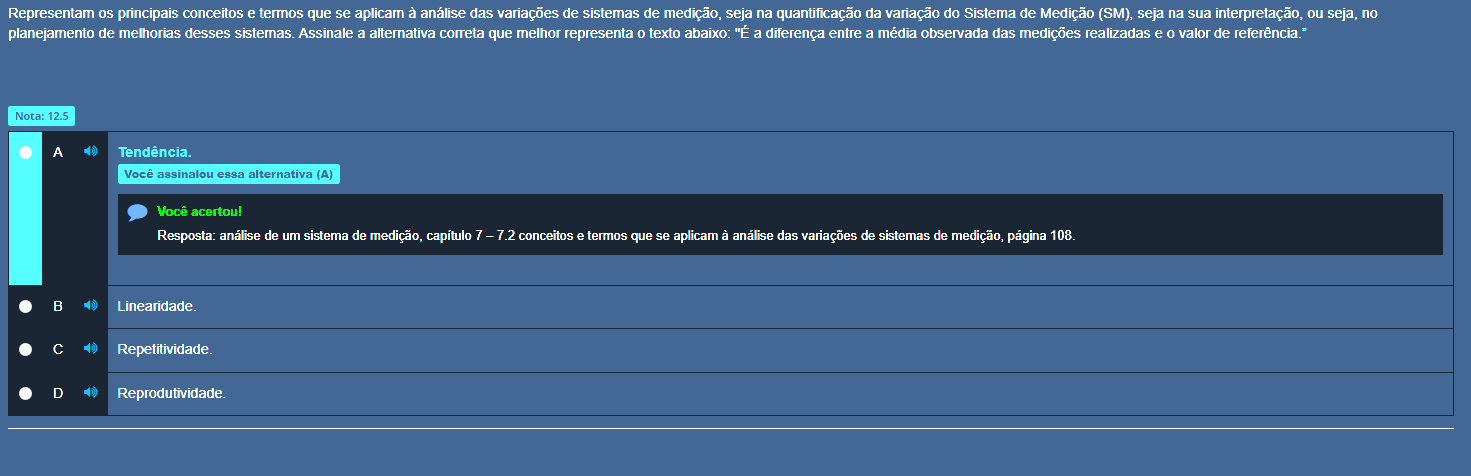 Representam os principais conceitos e termos que se aplicam à análise das variações de sistemas de medição, seja na quantificação da variação do Sistema de Medição (SM), seja na sua interpretação, ou seja, no planejamento de melhorias desses sistemas. Assinale a alternativa correta que melhor representa 0 texto abaixo: "É a diferença entre a média observada das medições realizadas e 0 valor de referência." Nota: 12.5 A Tendência. Você assinalou essa alternativa (A) Você acertou! Resposta: análise de um sistema de medição, capítulo 7 - 7.2 conceitos e termos que se aplicam à análise das variações de sistemas de medição, página 108. B Linearidade. C Repetitividade. D Reprodutividade.