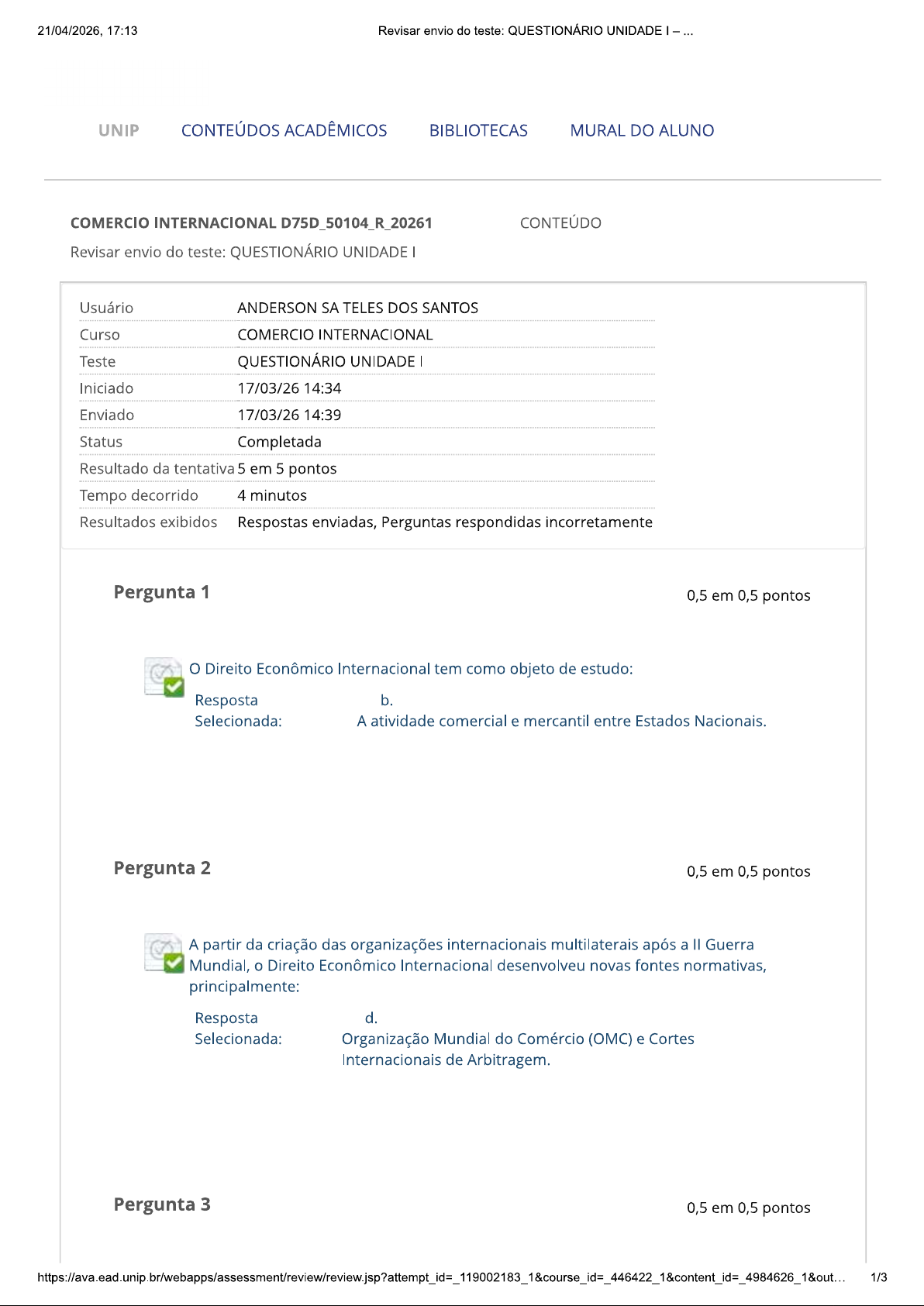 21/04/2026, 17:13 Revisar envio do teste: QUESTIONÁRIO UNIDADE UNIP CONTEÚDOS ACADÊMICOS BIBLIOTECAS MURAL DO ALUNO COMERCIO INTERNACIONAL D75D_50104_R_20261 CONTEÚDO Revisar envio do teste: QUESTIONÁRIO UNIDADE Usuário ANDERSON SA TELES DOS SANTOS Curso COMERCIO INTERNACIONAL Teste QUESTIONÁRIO UNIDADE I Iniciado 17/03/26 14:34 Enviado 17/03/26 14:39 Status Completada Resultado da tentativa 5 em 5 pontos Tempo decorrido 4 minutos Resultados exibidos Respostas enviadas, Perguntas respondidas incorretamente Pergunta 1 0,5 em 0,5 pontos Direito Econômico Internacional tem como objeto de estudo: Resposta b. Selecionada: A atividade comercial e mercantil entre Estados Nacionais. Pergunta 2 0,5 em 0,5 pontos A partir da criação das organizações internacionais multilaterais após a Guerra Mundial, Direito Econômico Internacional desenvolveu novas fontes normativas, principalmente: Resposta d. Selecionada: Organização Mundial do Comércio (OMC) e Cortes Internacionais de Arbitragem. Pergunta 3 0,5 em 0,5 pontos 1/321/04/2026, 17:13 Revisar envio do teste: QUESTIONÁRIO UNIDADE A natureza jurídica predominante na Lex Mercatoria são: Resposta Selecionada: Costumes comerciais. a. Pergunta 4 0,5 em 0,5 pontos A internacionalização empresarial está condicionada as características dos mercados externos, a existência de riscos e a capacidade de investimentos disponível e método de expansão definido. Entre os métodos de expansão possíveis, que envolve o maior nível de risco e comprometimento no exterior denomina-se: Resposta Selecionada: b. Greenfield. Pergunta 5 0,5 em 0,5 pontos Brasil possui poucos acordos comerciais, notadamente, com países com mercados pequenos e reduzida capacidade de trocas comerciais e o maior acordo regional é MERCOSUL. Assinado em Assunção, em 1991, com Argentina, Paraguai e Uruguai e pode ser classificado como: Resposta Selecionada: União Aduaneira. a. Pergunta 6 0,5 em 0,5 pontos Existem várias teorias sobre os fundamentos do comércio internacional e internacionalização empresarial que se desenvolveram com decorrer da evolução comercial. Assinale a opção incorreta. Resposta C. Selecionada: As teorias se baseiam nas perdas trazidas pela economia de escala e pela diferenciação dos produtos. Pergunta 7 0,5 em 0,5 pontos 2/321/04/2026, 17:13 Revisar envio do teste: QUESTIONÁRIO UNIDADE A nova Lex Mercatoria enquanto difusão de um novo modelo de ordenação jurídica e comercial entre as nações permitiu a evolução das trocas comercias entre as nações porque, exceto: Resposta b. Selecionada: Permitiu aumento das barreiras alfandegárias entre os países dificultando intercâmbio. Pergunta 8 0,5 em 0,5 pontos Entre as consequências e efeitos do processo de integração comercial mundial no nível de desenvolvimento social e econômico das nações podemos destacar várias, exceto: Resposta Selecionada: e. Redução da concorrência empresarial. Pergunta 9 0,5 em 0,5 pontos Os acordos regionais de comércio evoluíram com decorrer dos anos em termos de pauta e abrangência geográfica e desenvolveram-se por todo mundo no pós- guerra. Os acordos comerciais iniciais foram: Resposta Selecionada: Acordos Bilaterais. Pergunta 10 0,5 em 0,5 pontos A partir da evolução do Direito Econômico Internacional, as legislações nacionais precisaram adaptar-se às decisões definidas nas esferas multilaterais com a necessidade de recepção de diversos ordenamentos jurídicos nacionais, exceto: Resposta Selecionada: d. Direito Natural. Terça-feira, 21 de Abril de 2026 17h13min36s GMT-03:00 OK 3/3