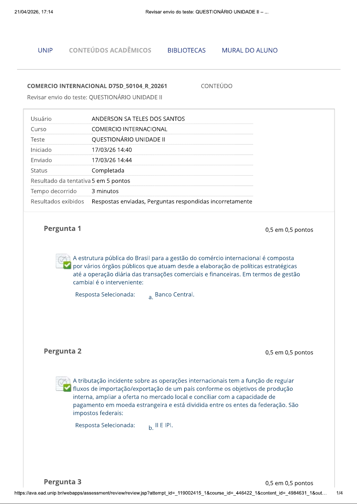 21/04/2026, 17:14 Revisar envio do teste: QUESTIONÁRIO UNIDADE UNIP CONTEÚDOS ACADÊMICOS BIBLIOTECAS MURAL DO ALUNO COMERCIO INTERNACIONAL D75D_50104_R_20261 CONTEÚDO Revisar envio do teste: QUESTIONÁRIO UNIDADE Usuário ANDERSON SA TELES DOS SANTOS Curso COMERCIO INTERNACIONAL Teste QUESTIONÁRIO UNIDADE Iniciado 17/03/26 14:40 Enviado 17/03/26 14:44 Status Completada Resultado da tentativa 5 em 5 pontos Tempo decorrido 3 minutos Resultados exibidos Respostas enviadas, Perguntas respondidas incorretamente Pergunta 1 0,5 em 0,5 pontos A estrutura pública do Brasil para a gestão do comércio internacional é composta por vários órgãos públicos que atuam desde a elaboração de políticas estratégicas até a operação diária das transações comerciais e financeiras. Em termos de gestão cambial é o interveniente: Resposta Selecionada: Banco Central. a. Pergunta 2 0,5 em 0,5 pontos A tributação incidente sobre as operações internacionais tem a função de regular fluxos de importação/exportação de um país conforme os objetivos de produção interna, ampliar a oferta no mercado local e conciliar com a capacidade de pagamento em moeda estrangeira e está dividida entre os entes da federação. São impostos federais: Resposta Selecionada: b. E IPI. Pergunta 3 0,5 em 0,5 pontos 1/421/04/2026, 17:14 Revisar envio do teste: QUESTIONÁRIO UNIDADE Além das ações do setor privado, a internacionalização das empresas e promoção das exportações exige ação do setor público em várias frentes e uma destas refere- se à promoção de feiras e eventos no exterior para divulgação dos produtos nacionais. Esta função é coordenada pelo órgão: Resposta Selecionada: Pergunta 4 0,5 em 0,5 pontos Em relação às consequências para Brasil das práticas criminais ilegais que ocorrem nas importações nas regiões de fronteira como contrabando e descaminho, avalie as alternativas e assinale a opção incorreta. Resposta Selecionada: Aumenta a arrecadação de impostos e tributos. C. Pergunta 5 0,5 em 0,5 pontos Conforme a legislação aduaneira vigente, a destinação final das mercadorias importadas apreendidas por práticas ilegais como contrabando e descaminho é função da Secretaria da Receita Federal e prevê três destinações possíveis: Resposta Selecionada: b. Doação, destruição e leilão. Pergunta 6 0,5 em 0,5 pontos desenvolvimento social do pós-guerra foi desigual entre países desenvolvidos e não desenvolvidos promovendo reações às novas políticas comerciais prescritas e surgem ações de protecionismo comercial, entre as quais citamos, exceto: Resposta d. Selecionada: Redução das tarifas de importação de produtos produzidos no país. 2/421/04/2026, 17:14 Revisar envio do teste: QUESTIONÁRIO UNIDADE Pergunta 7 0,5 em 0,5 pontos Sistema Geral de Preferências (SGP) criado na Organização das Nações Unidas (1971) concede vantagens tarifárias para os países em desenvolvimento na forma de redução e isenção de impostos de agrícolas e industriais com os objetivos, exceto: Resposta Selecionada: Promover desemprego nos países centrais com a transferência de tecnologia. Pergunta 8 0,5 em 0,5 pontos Com a evolução do comércio internacional surgem práticas empresariais e governamentais prejudiciais à justa e livre concorrência comercial entre as nações. Entre as práticas ilegais, a que avalia a prática privada comercial de discriminação de preços entre mercados em que preço de exportação é inferior ao preço no mercado local: Resposta Selecionada: b. Dumping. Pergunta 9 0,5 em 0,5 pontos Na OMC, existe mecanismo de solução de controvérsias comerciais em que as nações devem instruir procedimentos de verificação para apuração de prejuízos às empresas e nações. No caso em que um país avalia que outro país está violando normas solicita consultas na Entre as etapas que compõem a instrução do painel de discussão, aponte a etapa incorreta. Resposta C. Selecionada: pedido de instalação de Painel poderá ser feito sem comprovação de danos ao país. Pergunta 10 0,5 em 0,5 pontos Em relação à redação dos contratos internacionais de exportação e importação que devem ser elaborados com cláusulas específicas para este instrumento jurídico e 3/421/04/2026, 17:14 Revisar envio do teste: QUESTIONÁRIO UNIDADE comercial, avalie as alternativas e assinale a que não está prescrita na legislação internacional contratual: Resposta d. Selecionada: Não é necessário formalizar as necessidades de cuidados no manuseio e na embalagem. Terça-feira, 21 de Abril de 2026 17h14min12s GMT-03:00 OK 4/4