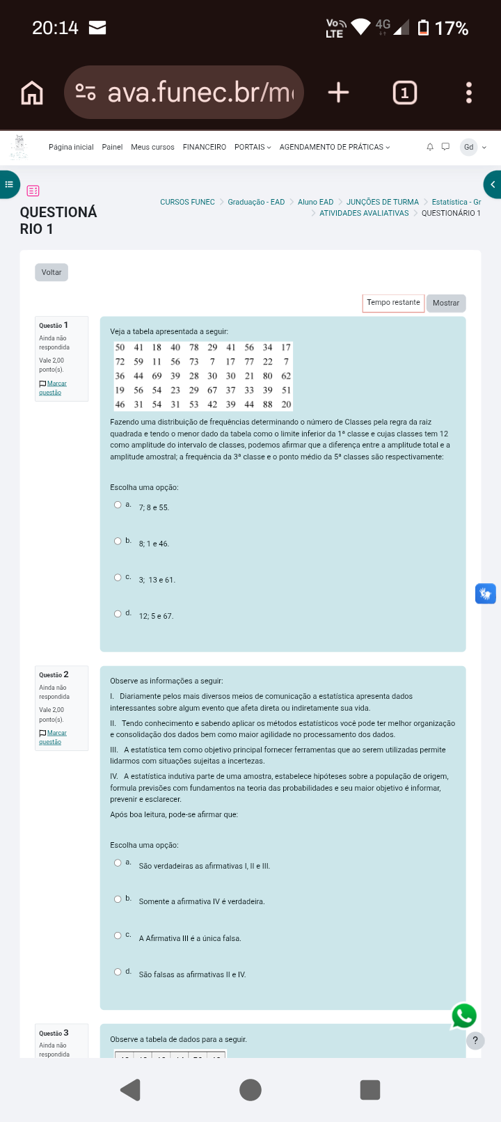20:14 4G LTE 17% ava.funec.br/m + 1 Página inicial Painel Meus cursos FINANCEIRO PORTAIS AGENDAMENTO DE PRÁTICAS Gd iii CURSOS FUNEC Graduação EAD Aluno EAD JUNÇÕES DE TURMA Estatística Gr QUESTIONÁ ATIVIDADES AVALIATIVAS 1 RIO 1 Voltar Tempo restante Mostrar Questão 1 Veja a tabela apresentada a seguir: Ainda não respondida 50 41 18 40 78 29 41 56 34 17 Vale 2.00 72 59 11 56 73 7 17 77 22 7 ponto(s). 36 44 69 39 28 30 30 21 80 62 Marcar questão 19 56 54 23 29 67 37 33 39 51 46 31 54 31 53 42 39 44 88 20 Fazendo uma distribuição de frequências determinando de Classes pela regra da raiz quadrada e tendo 0 menor dado da tabela como 0 limite inferior da classe e cujas classes tem 12 como amplitude do intervalo de classes, podemos afirmar que a diferença entre a amplitude total e a amplitude amostral; a da classe e 0 ponto médio da classes são respectivamente: Escolha uma opção: a. 7; 55. b. 8; 46. C. 13 e 61. d. 67. Questão 2 Observe as informações a seguir: Ainda não respondida Diariamente pelos mais diversos meios de comunicação a estatistica apresenta dados Vale 2.00 interessantes sobre algum evento que afeta direta ou indiretamente sua vida. ponto(s) II. Tendo conhecimento e sabendo aplicar os métodos estatisticos voce pode ter melhor organização Marcar e consolidação dos dados bem como maior agilidade no processamento dos dados. questão III. A estatistica tem como objetivo principal fornecer ferramentas que ao serem utilizadas permite lidarmos com situações sujeitas a incertezas. IV. A indutiva parte de uma amostra, estabelece sobre a população de origem, formula previsões com fundamentos na teoria das probabilidades e seu maior objetivo e informar, prevenir e esclarecer. Apos boa leitura, pode-se afirmar que: Escolha uma opção: a. Sao verdadeiras as afirmativas I, II e III. b. Somente a afirmativa IV verdadeira. C. A Afirmativa III a falsa. d. falsas as afirmativas e IV. Questão 3 Observe a tabela de dados para a seguir. ? Ainda não respondida