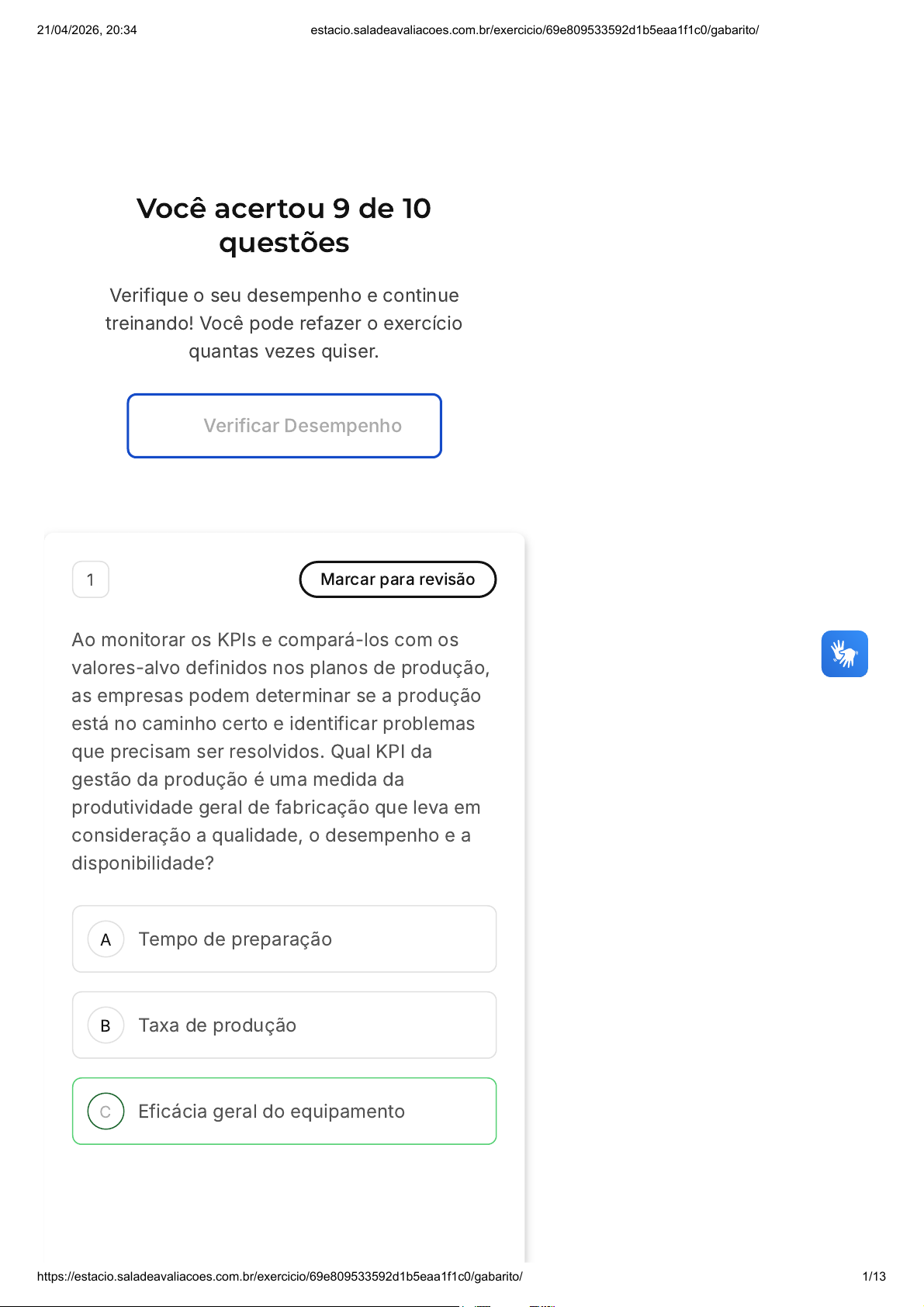 Você acertou 9 de 10 questões Verifique o seu desempenho e continue treinando! Você pode refazer o exercício quantas vezes quiser. Verificar Desempenho A B C 1 Marcar para revisão Ao monitorar os KPIs e compará-los com os valores-alvo definidos nos planos de produção, as empresas podem determinar se a produção está no caminho certo e identificar problemas que precisam ser resolvidos. Qual KPI da gestão da produção é uma medida da produtividade geral de fabricação que leva em consideração a qualidade, o desempenho e a disponibilidade? Tempo de preparação Taxa de produção Eficácia geral do equipamento 21/04/2026, 20:34 estacio.saladeavaliacoes.com.br/exercicio/69e809533592d1b5eaa1f1c0/gabarito/ https://estacio.saladeavaliacoes.com.br/exercicio/69e809533592d1b5eaa1f1c0/gabarito/ 1/13 D E Taxa de rejeição Tempo de inatividade Resposta correta Parabéns, você selecionou a alternativa correta. Confira o gabarito comentado! Gabarito Comentado A alternativa correta é a "Eficácia geral do equipamento". Este KPI, também conhecido pela sigla OEE (Overall Equipment Effectiveness), é uma medida amplamente utilizada na gestão da produção para avaliar a eficiência de um sistema de produção. Ele considera três fatores principais: qualidade (quantos produtos saem do processo sem defeitos), desempenho (se a produção está sendo realizada na velocidade máxima possível) e disponibilidade (quanto tempo o equipamento está realmente disponível para produzir). Portanto, o OEE é uma medida abrangente que ajuda as empresas a identificar áreas de melhoria e a tomar decisões informadas para otimizar a produção. 2 Marcar para revisão A automação industrial por meio de um sistema de controle industrial tem uma série de vantagens para as indústrias, como eficiência aprimorada, custos reduzidos, redução de erros 21/04/2026, 20:34 estacio.saladeavaliacoes.com.br/exercicio/69e809533592d1b5eaa1f1c0/gabarito/ https://estacio.saladeavaliacoes.com.br/exercicio/69e809533592d1b5eaa1f1c0/gabarito/ 2/13 A B C D E e desperdícios, entre outros. Qual sistema de controle industrial possui a vantagem de usar um circuito de controle de supervisão centralizado para gerenciar os dispositivos como parte de um processo de produção geral? Sistema de Controle de Supervisão e Aquisição de Dados - SCADA Sistema de Controle Distribuído - DCS Controladores Lógicos Programáveis - PLC Sistema de manutenção remota - RMS Unidade de terminal mestre - MTU Resposta correta Parabéns, você selecionou a alternativa correta. Confira o gabarito comentado! Gabarito Comentado O Sistema de Controle Distribuído - DCS é a resposta correta. Este sistema é caracterizado por permitir um controle centralizado, o que significa que ele pode gerenciar vários dispositivos como parte de um processo de produção geral. Além disso, o DCS oferece aos usuários a capacidade de acessar rapidamente os dados necessários, além de controlar, monitorar e organizar vários dispositivos usados em uma fábrica. Portanto, é uma ferramenta essencial para a automação 21/04/2026, 20:34 estacio.saladeavaliacoes.com.br/exercicio/69e809533592d1b5eaa1f1c0/gabarito/ https://estacio.saladeavaliacoes.com.br/exercicio/69e809533592d1b5eaa1f1c0/gabarito/ 3/13 A B C D E industrial, contribuindo para a eficiência aprimorada, redução de custos e minimização de erros e desperdícios. 3 Marcar para revisão Assinale a opção que completa corretamente a lacuna da sentença abaixo. O processo de tomada de decisão começa a partir da confirmação do objetivo organizacional e da definição do problema. O próximo passo é _______________________________ para o problema. Avaliar cursos de ação Estabelecer a solução Definir a decisão a ser tomada Identificar possíveis soluções Implementar a decisão Resposta correta Parabéns, você selecionou a alternativa correta. Confira o gabarito comentado! Gabarito Comentado 21/04/2026, 20:34 estacio.saladeavaliacoes.com.br/exercicio/69e809533592d1b5eaa1f1c0/gabarito/ https://estacio.saladeavaliacoes.com.br/exercicio/69e809533592d1b5eaa1f1c0/gabarito/ 4/13 A B C D E Uma vez definido o problema, o próximo passo é identificar possíveis soluções para o problema. 4 Marcar para revisão O planejamento de produção em massa é uma técnica altamente benéfica ao produzir um grande número dos mesmos itens em um curto período. Esse tipo de produção geralmente é automatizada, o que reduz os custos de mão de obra necessários para a produção. Mas nem sempre esse tipo de produção é possível, pois existem produtos onde a especificidade dos requisitos de cada cliente dificulta a produção em massa. Neste caso, qual tipo de planejamento de produção é aconselhável ser implantado? Planejamento de produção em lote Planejamento de produção por tarefa Planejamento de produção em fluxo Planejamento de produção em massa Planejamento de produção por processo 21/04/2026, 20:34 estacio.saladeavaliacoes.com.br/exercicio/69e809533592d1b5eaa1f1c0/gabarito/ https://estacio.saladeavaliacoes.com.br/exercicio/69e809533592d1b5eaa1f1c0/gabarito/ 5/13 A B Resposta correta Parabéns, você selecionou a alternativa correta. Confira o gabarito comentado! Gabarito Comentado O planejamento de produção por tarefa é a melhor opção para situações em que a produção em massa não é viável devido à especificidade dos requisitos de cada cliente. Este tipo de planejamento é comumente utilizado por empresas de pequeno e médio porte e se concentra na criação de um único item por uma pessoa ou equipe. Isso permite uma maior flexibilidade e personalização do produto, atendendo às necessidades específicas de cada cliente. 5 Marcar para revisão As tomadas de decisão em uma organização costumam obedecer a uma hierarquia de responsabilidades. Normalmente são divididas entre responsabilidades ligadas às estratégias organizacionais e responsabilidades que envolvem a 