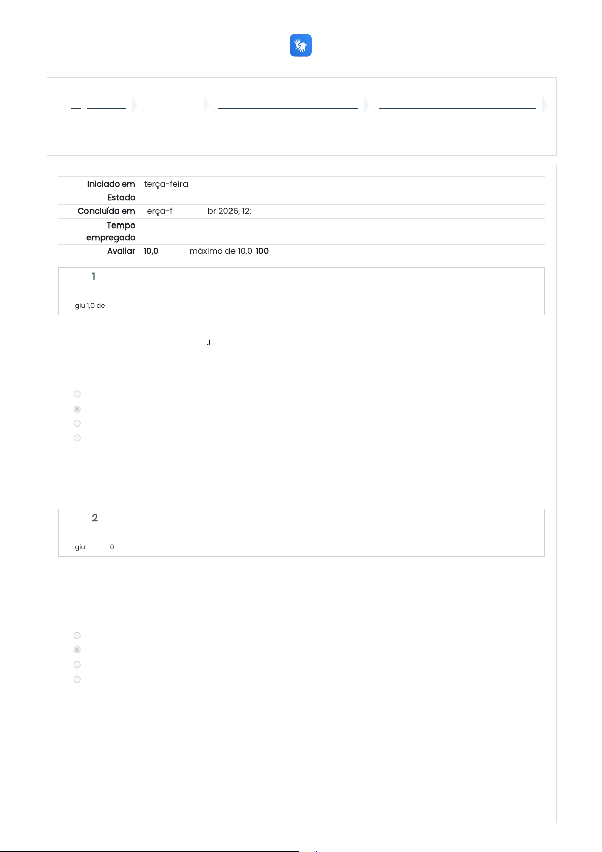 Página inicial Meus cursos Informática Básica - Turma 2026.1 Conhecimentos Básicos em Hardware Exercícios de Fixação I Iniciado em terça-feira, 14 abr 2026, 12:25 Estado Finalizada Concluída em terça-feira, 14 abr 2026, 12:44 Tempo empregado 18 minutos 25 segundos Avaliar 10,0 de um máximo de 10,0(100%) Questão 1 Correto Atingiu 1,0 de 1,0 Questão 2 Correto Atingiu 1,0 de 1,0 Em um projeto de design gráfico, Júlia precisa garantir que o computador que utiliza tenha capacidade de renderizar imagens tridimensionais com alta qualidade. Qual componente do computador é mais relevante para atender essa demanda? a. Processador (CPU). b. Placa de vídeo (GPU). c. Disco rígido (HD). d. Fonte de alimentação. A resposta correta é: Placa de vídeo (GPU). Um técnico foi chamado para avaliar o problema de um computador que não exibe imagens na tela. Após verificar os componentes, ele suspeita que um dos componentes de hardware está com defeito. Qual componente é responsável por transmitir imagens ao monitor? a. Disco rígido (HD). b. Placa de vídeo. c. Placa de rede. d. Fonte de alimentação. A resposta correta é: Placa de vídeo. https://cursoslivres.ifms.edu.br/ https://cursoslivres.ifms.edu.br/course/view.php?id=500 https://cursoslivres.ifms.edu.br/course/view.php?id=500§ion=4 https://cursoslivres.ifms.edu.br/mod/quiz/view.php?id=17498 Questão 3 Correto Atingiu 1,0 de 1,0 Questão 4 Correto Atingiu 1,0 de 1,0 Questão 5 Correto Atingiu 1,0 de 1,0 Clara está configurando uma rede em sua casa e deseja utilizar uma tecnologia sem fios para conectar seu computador à internet. Qual tecnologia de rede Clara deve configurar para permitir essa conexão? a. Ethernet. b. VGA. c. USB. d. Wi-Fi. A resposta correta é: Wi-Fi. Ao abrir seu notebook, Carlos percebe que alguns dos componentes internos são soldados diretamente à placa-mãe, como a placa de vídeo. Ele consulta um técnico, que explica que o notebook possui uma placa-mãe do tipo onboard. Qual é a característica principal desse tipo de placa? a. Facilita a troca de componentes internos como a placa de vídeo. b. Exige que todos os componentes sejam conectados externamente. c. Possui a maioria dos componentes integrados, otimizando o espaço. d. Oferece a melhor capacidade de personalização do hardware. A resposta correta é: Possui a maioria dos componentes integrados, otimizando o espaço. João comprou um novo computador e percebeu que ele vinha sem sistema instalado. Para utilizar o computador, ele precisará instalar um sistema que permita a comunicação entre o hardware e os programas. Qual tipo de software João deve instalar? a. Um antivírus para proteger o computador. b. Um aplicativo de edição de texto. c. Um jogo de entretenimento. d. Um sistema operacional como Windows ou Linux. A resposta correta é: Um sistema operacional como Windows ou Linux. Questão 6 Correto Atingiu 1,0 de 1,0 Questão 7 Correto Atingiu 1,0 de 1,0 Questão 8 Correto Atingiu 1,0 de 1,0 Lucas está configurando um servidor para a empresa e precisa garantir que ele possa lidar com várias conexões simultâneas de alta velocidade, além de armazenamento em massa. Qual tecnologia de armazenamento seria a mais indicada para esse tipo de aplicação? a. SAS. b. PATA. c. USB 2.0. d. IDE. A resposta correta é: SAS. Marta está preocupada com a quantidade de calor que seu computador gera durante o uso intenso. Ela lê que pode usar um sistema de refrigeração mais eficiente, além do cooler. Qual alternativa de refrigeração Marta poderia considerar para reduzir a temperatura de seu processador? a. Refrigeração líquida. b. Substituir o processador por um modelo mais antigo. c. Utilizar um disco rígido externo. d. Instalar mais memória RAM. A resposta correta é: Refrigeração líquida. Paulo está conectando um novo periférico ao seu computador e observou que o dispositivo é capaz de enviar e receber dados. Qual dos dispositivos abaixo tem essa característica de ser um periférico híbrido? a. Teclado. b. Caixa de som. c. Impressora multifuncional. d. Monitor. A resposta correta é: Impressora multifuncional. Questão 9 Correto Atingiu 1,0 de 1,0 Questão 10 Correto Atingiu 1,0 de 1,0 Marcos decidiu substituir o disco rígido mecânico de seu computador por um SSD, buscando maior velocidade no carregamento de programas e no acesso a arquivos. Qual é uma característica dos SSDs que oferece essa vantagem em comparação com os HDDs? a. Os SSDs dependem de mais energia elétrica para funcionar corretamente. b. Os SSDs têm maior capacidade de armazenamento do que os HDDs. c. Os SSDs utilizam memória flash e não possuem partes móveis. d. Os SSDs possuem discos giratórios mais rápidos. A resposta correta é: Os SSDs utilizam memória flash e não possuem partes móveis. Maria utiliza um computador para edição de vídeos em alta resolução, mas percebeu que o desempenho do sistema caiu drasticamente após abrir vários aplicativos ao mesmo tempo. Qual componente do hardware deve ser ampliado para melhorar essa situação? a. Placa de som. b. Disco rígido. c. Fonte de alimentação. d. Memória RAM. A resposta correta é: Memória RAM. Atividade anterior ◄ Aula 10 - Conectores, interfaces e controladores Seguir para... Próxima atividade Aula 01 - Introdução ► Manter contato IFMS http://ifms.edu.br cursoslivres@ifms.edu.br Resumo de retenção de dados https://cursoslivres.ifms.edu.br/mod/resource/view.php?id=17497&forceview=1 https://cursoslivres.ifms.edu.br/mod/resource/view.php?id=17499&forceview=1 http://ifms.edu.br/ mailto:cursoslivres@ifms.edu.br https://www.facebook.com/ifms.oficial/ https://www.youtube.com/IFMScomunica https://www.instagram.com/ifms.oficial/ https://cursoslivres.ifms.edu.br/admin/tool/dataprivacy/summary.php Baixar o aplicativo móvel. https://download.moodle.org/mobile?version=2021051711.03&lang=pt_br&iosappid=633359593&androidappid=com.moodle.moodlemobile