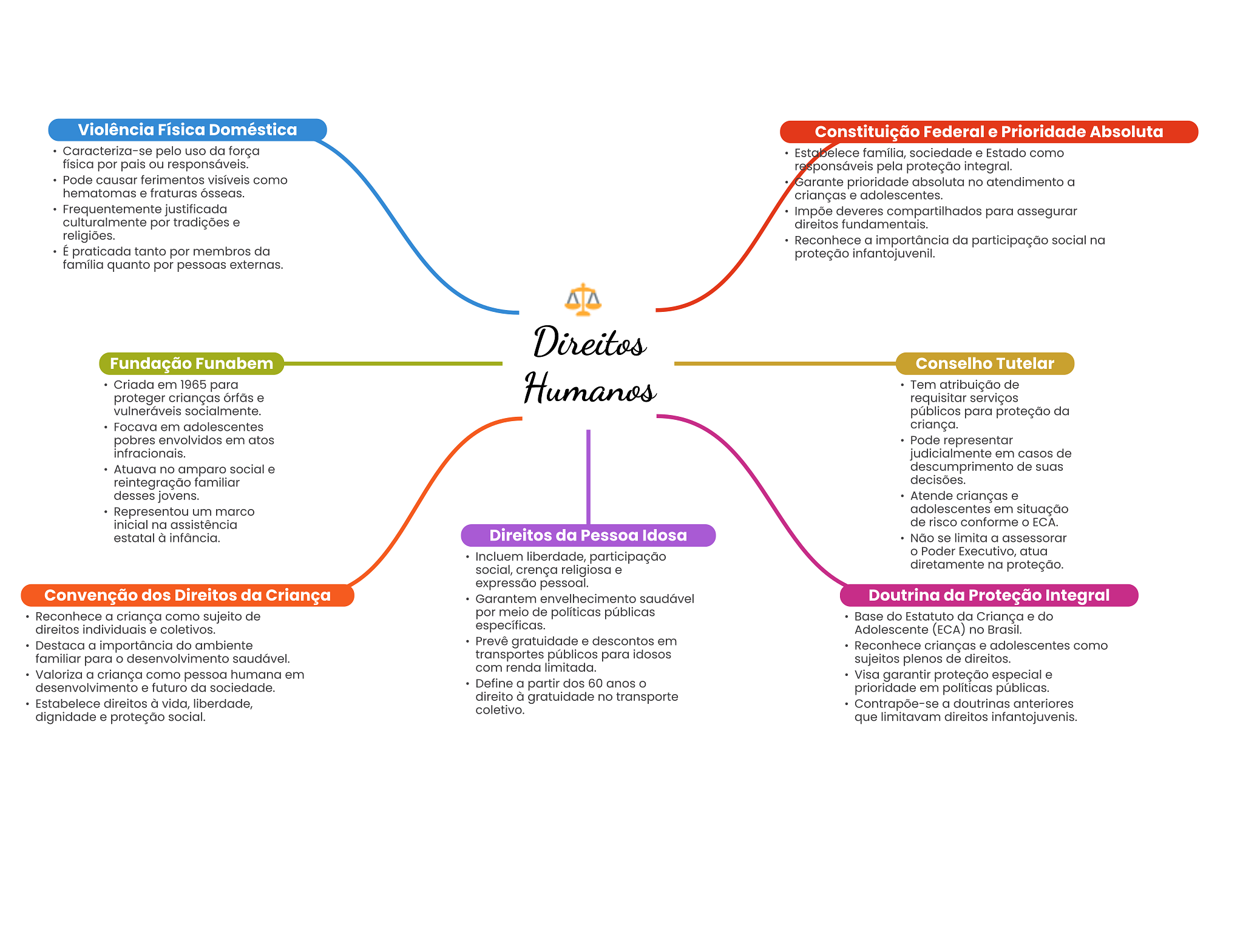 Violência Física Doméstica Constituição Federal e Prioridade Absoluta Caracteriza-se pelo uso da força Estabelece família, sociedade e Estado como física por pais ou responsáveis. responsáveis pela proteção integral. Pode causar ferimentos visíveis como Garante prioridade absoluta no atendimento a hematomas e fraturas ósseas. crianças e adolescentes. Frequentemente justificada Impõe deveres compartilhados para assegurar culturalmente por tradições e direitos fundamentais. religiões. Reconhece a importância da participação social na É praticada tanto por membros da proteção infantojuvenil. família quanto por pessoas externas. Direitos Fundação Funabem Conselho Tutelar Criada em 1965 para Humanos Tem atribuição de proteger crianças órfãs e requisitar serviços vulneráveis socialmente. públicos para proteção da Focava em adolescentes criança. pobres envolvidos em atos Pode representar infracionais. judicialmente em casos de Atuava no amparo social e descumprimento de suas reintegração familiar decisões. desses jovens. Atende crianças e Representou um marco adolescentes em situação inicial na assistência de risco conforme O ECA. estatal à infância. Direitos da Pessoa Idosa Não se limita a assessorar Incluem liberdade, participação Poder Executivo, atua social, crença religiosa e diretamente na proteção. expressão pessoal. Convenção dos Direitos da Criança Garantem envelhecimento saudável Doutrina da Proteção Integral Reconhece a criança como sujeito de por meio de políticas públicas Base do Estatuto da Criança e do direitos individuais e coletivos. específicas. Adolescente (ECA) no Brasil. Destaca a importância do ambiente Prevê gratuidade e descontos em Reconhece crianças e adolescentes como familiar para desenvolvimento saudável. transportes públicos para idosos sujeitos plenos de direitos. com renda limitada. Valoriza a criança como pessoa humana em Visa garantir proteção especial e desenvolvimento e futuro da sociedade. Define a partir dos 60 anos prioridade em políticas públicas. Estabelece direitos à vida, liberdade, direito à gratuidade no transporte coletivo. Contrapõe-se a doutrinas anteriores dignidade e proteção social. que limitavam direitos infantojuvenis.