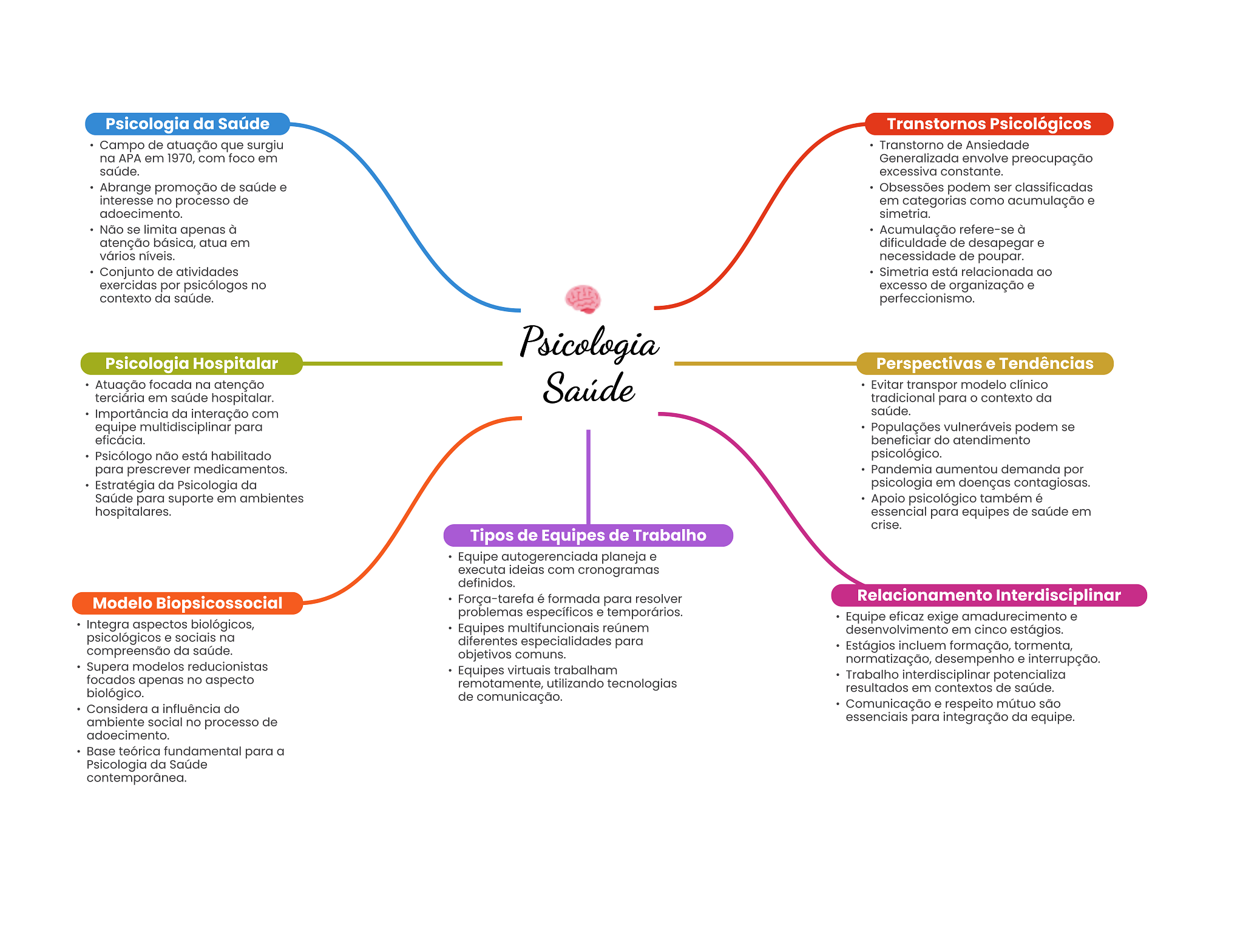 Psicologia da Saúde Transtornos Psicológicos Campo de atuação que surgiu Transtorno de Ansiedade na APA em 1970, com foco em Generalizada envolve preocupação saúde. excessiva constante. Abrange promoção de saúde e Obsessões podem ser classificadas interesse no processo de em categorias como acumulação e adoecimento. simetria. Não se limita apenas à Acumulação refere-se à atenção básica, atua em dificuldade de desapegar e vários níveis. necessidade de poupar. Conjunto de atividades Simetria está relacionada ao exercidas por psicólogos no excesso de organização e contexto da saúde. perfeccionismo. Psicologia Psicologia Hospitalar Perspectivas e Tendências Atuação focada na atenção Saúde Evitar transpor modelo clínico terciária em saúde hospitalar. tradicional para contexto da Importância da interação com saúde. equipe multidisciplinar para Populações vulneráveis podem se eficácia. beneficiar do atendimento Psicólogo não está habilitado psicológico. para prescrever medicamentos. Pandemia aumentou demanda por Estratégia da Psicologia da psicologia em doenças contagiosas. Saúde para suporte em ambientes Apoio psicológico também é hospitalares. essencial para equipes de saúde em crise. Tipos de Equipes de Trabalho Equipe autogerenciada planeja e executa ideias com cronogramas definidos. Modelo Biopsicossocial Força-tarefa é formada para resolver Relacionamento Interdisciplinar problemas específicos e temporários. Equipe eficaz exige amadurecimento e Integra aspectos biológicos, Equipes multifuncionais reúnem desenvolvimento em cinco estágios. psicológicos e sociais na diferentes especialidades para compreensão da saúde. Estágios incluem formação, tormenta, objetivos comuns. normatização, desempenho e interrupção. Supera modelos reducionistas Equipes virtuais trabalham focados apenas no aspecto Trabalho interdisciplinar potencializa remotamente, utilizando tecnologias biológico. resultados em contextos de saúde. de comunicação. Considera a influência do Comunicação e respeito mútuo são ambiente social no processo de essenciais para integração da equipe. adoecimento. Base teórica fundamental para a Psicologia da Saúde contemporânea.