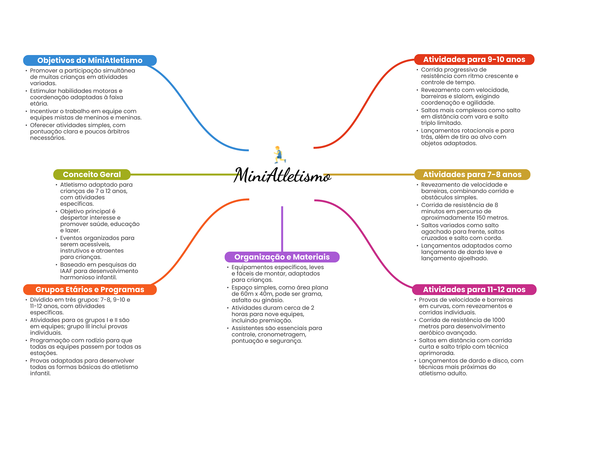Objetivos do MiniAtletismo Atividades para 9-10 anos Promover a participação simultânea Corrida progressiva de de muitas crianças em atividades resistência com ritmo crescente e variadas. controle de tempo. Estimular habilidades motoras e Revezamento com velocidade, coordenação adaptadas à faixa barreiras e slalom, exigindo etária. coordenação e agilidade. Incentivar trabalho em equipe com Saltos mais complexos como salto equipes mistas de meninos e meninas. em distância com vara e salto Oferecer atividades simples, com triplo limitado. pontuação clara e poucos árbitros Lançamentos rotacionais e para necessários. trás, além de tiro ao alvo com objetos adaptados. Conceito Geral MiniAtletismo Atividades para 7-8 anos Atletismo adaptado para Revezamento de velocidade e crianças de 7 a 12 anos, barreiras, combinando corrida e com atividades obstáculos simples. específicas. Corrida de resistência de 8 Objetivo principal é minutos em percurso de despertar interesse e aproximadamente 150 metros. promover saúde, educação Saltos variados como salto e lazer. agachado para frente, saltos Eventos organizados para cruzados e salto com corda. serem acessíveis, Lançamentos adaptados como instrutivos e atraentes lançamento de dardo leve e para crianças. Organização e Materiais lançamento ajoelhado. Baseado em pesquisas da Equipamentos específicos, leves IAAF para desenvolvimento e fáceis de montar, adaptados harmonioso infantil. para crianças. Grupos Etários e Programas Espaço simples, como área plana Atividades para 11-12 anos de 60m X 40m, pode ser grama, Dividido em três grupos: 7-8, 9-10 e asfalto ou ginásio. Provas de velocidade e barreiras 11-12 anos, com atividades Atividades duram cerca de 2 em curvas, com revezamentos e específicas. horas para nove equipes, corridas individuais. Atividades para OS grupos e são incluindo premiação. Corrida de resistência de 1000 em equipes; grupo III inclui provas Assistentes são essenciais para metros para desenvolvimento individuais. controle, cronometragem, avançado. Programação com rodízio para que pontuação e segurança. Saltos em distância com corrida todas as equipes passem por todas as curta e salto triplo com técnica estações. aprimorada. Provas adaptadas para desenvolver Lançamentos de dardo e disco, com todas as formas básicas do atletismo técnicas mais próximas do infantil. atletismo adulto.