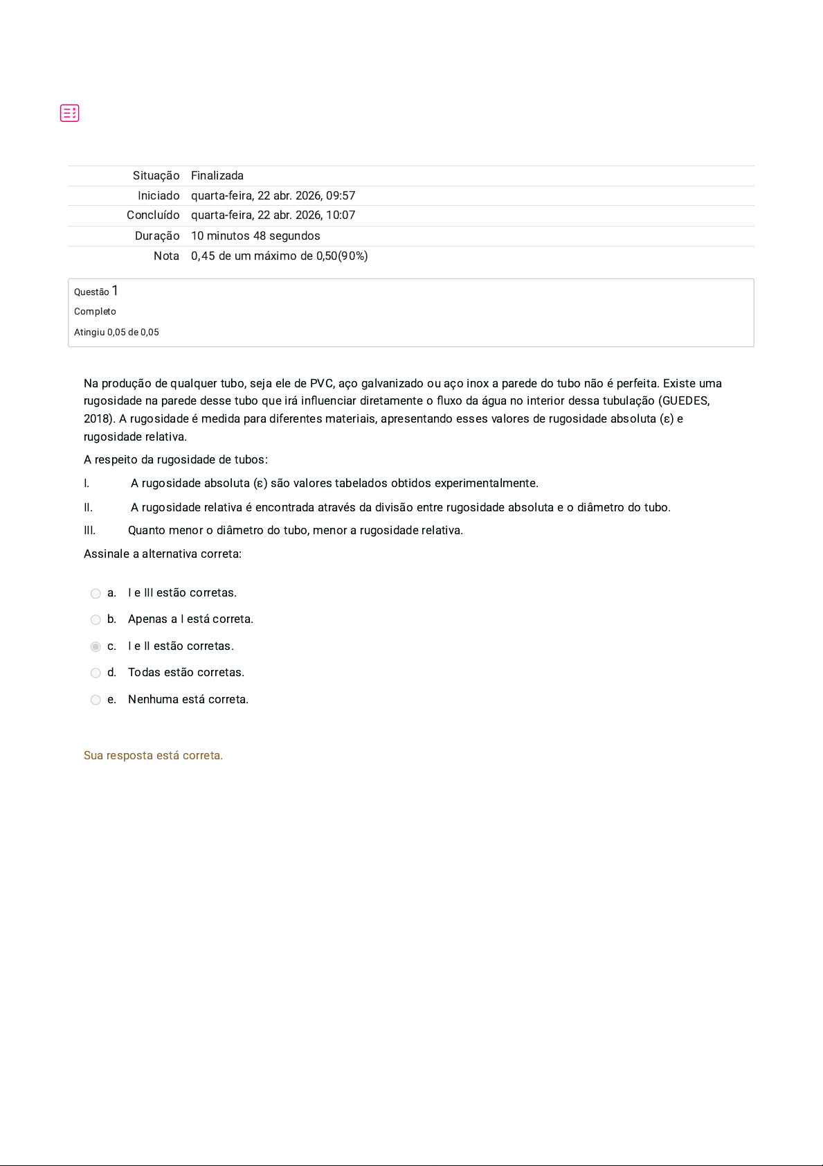 Situação Finalizada Iniciado quarta-feira, 22 abr. 2026, 09:57 Concluído quarta-feira, 22 abr. 2026, 10:07 Duração 10 minutos 48 segundos Nota 0,45 de um máximo de 0,50(90%) Questão 1 Completo Atingiu 0,05 de 0,05 Na produção de qualquer tubo, seja ele de PVC, aço galvanizado ou aço inox a parede do tubo não é perfeita. Existe uma rugosidade na parede desse tubo que irá in�uenciar diretamente o �uxo da água no interior dessa tubulação (GUEDES, 2018). A rugosidade é medida para diferentes materiais, apresentando esses valores de rugosidade absoluta (ε) e rugosidade relativa. A respeito da rugosidade de tubos: I. A rugosidade absoluta (ε) são valores tabelados obtidos experimentalmente. II. A rugosidade relativa é encontrada através da divisão entre rugosidade absoluta e o diâmetro do tubo. III. Quanto menor o diâmetro do tubo, menor a rugosidade relativa. Assinale a alternativa correta: a. I e III estão corretas. b. Apenas a I está correta. c. I e II estão corretas. d. Todas estão corretas. e. Nenhuma está correta. Sua resposta está correta. Questão 2 Completo Atingiu 0,05 de 0,05 Questão 3 Completo Atingiu 0,05 de 0,05 Alterando o diâmetro da tubulação é possível alterar a velocidade de escoamento e consequentemente alterar o regime de escoamento. É necessário obter um número de Reynolds abaixo de 2000 para que se tenha um regime de escoamento laminar e uma menor perda de carga. Qual diâmetro (em mm) posso utilizar para que o regime de escoamento seja laminar (N Reynolds = 2000) quando tenho uma velocidade de escoamento de 3 m s ? Dados: Viscosidade cinemática da água = 0,0001 m² s . a. 76,66 mm. b. 66,66 mm. c. 46,66 mm. d. 56,66 mm. e. 86,66 mm. -1 -1 Sua resposta está correta. A pressão pode ser de�nida como a relação entre força e área. Essa força pode ser a força peso que se encontra distribuída sobre determinada área, causando então uma pressão. Essa pressão pode ser expressa em diferentes unidades tais como m.c.a e kgf. Em relação ao conceito de pressão: I. Pressão é a força dividida pela área. II. A força peso é a massa de determinado objeto multiplicado pela aceleração da gravidade. III. A força peso é a mesma em diferentes condições de gravidade. Assinale a alternativa correta: a. Apenas a III está correta. b. I e III estão corretas. c. I e II estão corretas. d. Todas estão corretas. e. Apenas a I está correta. Sua resposta está correta. Questão 4 Completo Atingiu 0,05 de 0,05 Questão 5 Completo Atingiu 0,05 de 0,05 Massa especí�ca é a relação entre a massa do material e o volume ocupado por essa massa, também podendo ser chamada de densidade absoluta. É importante ressaltar que se trata de massa, ou seja, não é considerada a aceleração da gravidade. Portanto a massa especí�ca não irá sofrer alterações ao ser aferida em locais diferentes. Essa propriedade é alterada com a mudança de temperatura do líquido (CARVALHO, 2019). Sabendo que a massa especí�ca da água a 25 °C é 0,29% menor que a massa especí�ca da água a 4 °C. Determine a massa especí�ca da água a 25 °C. Dados: Massa especí�ca da água a 4 °C = 1.000 kg m . a. 997,1 kg m . b. 997,1 kgf m . c. 999,1 kgf m . d. 996,1 kgf m . e. 998,1 kgf m . -3 -3 -3 -3 -3 -3 Sua resposta está correta. Conhecer a perda de carga total que um sistema hidráulico pode apresentar é de extrema importância para o dimensionamento correto desse sistema. Caso o engenheiro venha a desconsiderar essa perda de carga, o sistema pode ser subdimensionado. Já caso o engenheiro considere uma perda de carga maior do que a real, o sistema poderá ser superdimensionado. Em relação a perda de carga: I. Está relacionada com a rugosidade do tubo. II. É causada devido ao atrito com a parede da tubulação. III. Peças como cotovelos, uniões e curvas não tem in�uência na perda de carga. Assinale a alternativa correta: a. I e III estão corretas. b. I e II estão corretas. c. Apenas I está correta. d. Todas estão corretas. e. Nenhuma está correta. Sua resposta está correta. Questão 6 Completo Atingiu 0,05 de 0,05 Questão 7 Completo Atingiu 0,05 de 0,05 Condutos podem ser de�nidos como caminhos ou vias no qual podem ser utilizados para conduzir líquidos, mais especi�camente no caso da hidráulica agrícola a água. Entretanto esses condutos podem ser divididos em forçados ou livres (ELGER et al., 2019). São exemplos de condutos forçados: I. Tubulação com pressão acima da pressão atmosférica. II. Tubulação com pressão igual a pressão atmosférica. III. Tubulação com pressão abaixo da pressão atmosférica. Assinale a alternativa correta: a. II e III estão corretas. b. I e III estão corretas. c. Nenhuma está correta. d. Todas estão corretas. e. I e II estão corretas. Sua resposta está correta. Ao conduzirmos água, seja por condutos livres ou forçados, a trajetória desse �uido ocorre de diferentes formas conforme as condições no qual está submetido. Esse regime de escoamento pode ser classi�cado conforme o número de Reynolds obtido, que depende do diâmetro da tubulação, velocidade de escoamento e a viscosidade cinemática da água. Em uma tubulação com 0,05 m de diâmetro a velocidade de escoamento do �uido foi determinada em 8,54 m s . Determine o número de Reynolds e indique o regime de escoamento segundo a classi�cação. Dados: Viscosidade cinemática da água = 0,0001 m² s . a. 4270 - regime de transição. b. 4270 - regime laminar. c. 1270 - regime laminar. d. 2270 - regime de transição. e. 4270 - regime turbulento. -1 -1 Sua resposta está correta. Questão 8 Completo Atingiu 0,05 de 0,05 Questão 9 Completo Atingiu 0,05 de 0,05 A lei de Stevin determina que a pressão exercida pela coluna de um �uido não depende da área na qual essa coluna se apoia, mas apenas da sua altura. Sendo assim, se mudar a área de contato dessa coluna de �uido a pressão exercida s