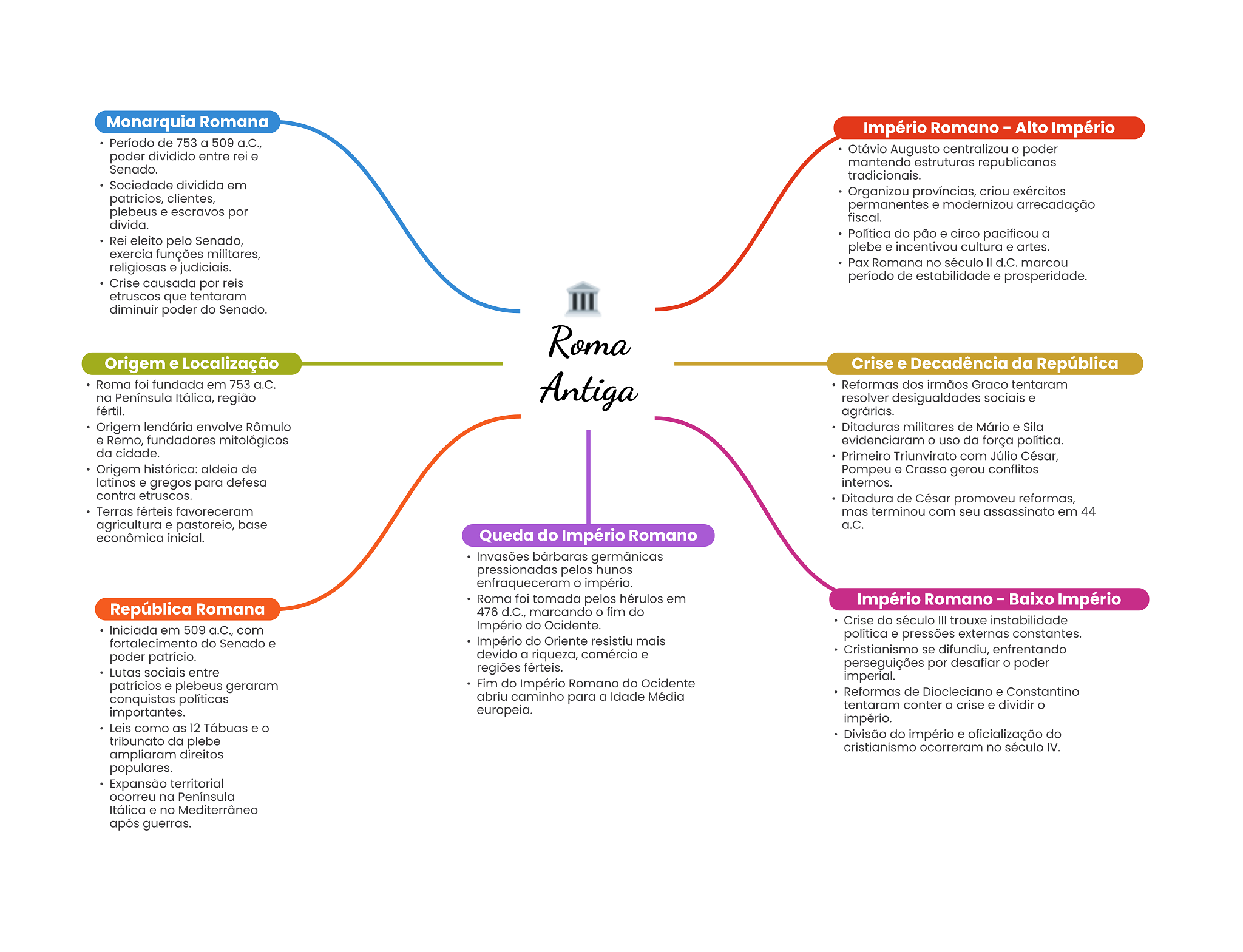Monarquia Romana Império Romano Alto Império Período de 753 a 509 a.C., Otávio Augusto centralizou poder poder dividido entre rei e Senado. mantendo estruturas republicanas tradicionais. Sociedade dividida em Organizou províncias, criou exércitos patrícios, clientes, permanentes e modernizou arrecadação plebeus e escravos por fiscal. dívida. Política do pão e circo pacificou a Rei eleito pelo Senado, exercia funções militares, plebe e incentivou cultura e artes. religiosas e judiciais. Pax Romana no século d.C. marcou Crise causada por reis período de estabilidade e prosperidade. etruscos que tentaram diminuir poder do Senado. Roma Origem e Localização Crise e Decadência da República Roma foi fundada em 753 a.C. na Península Itálica, região Antiga Reformas dos irmãos Graco tentaram resolver desigualdades sociais e fértil. agrárias. Origem lendária envolve Rômulo Ditaduras militares de Mário e Sila e Remo, fundadores mitológicos evidenciaram O uso da força política. da cidade. Primeiro Triunvirato com Júlio César, Origem histórica: aldeia de Pompeu e Crasso gerou conflitos latinos e gregos para defesa internos. contra etruscos. Ditadura de César promoveu reformas, Terras férteis favoreceram mas terminou com seu assassinato em 44 agricultura e pastoreio, base a.C. econômica inicial. Queda do Império Romano Invasões bárbaras germânicas pressionadas pelos hunos enfraqueceram império. Roma foi tomada pelos hérulos em Império Romano Baixo Império República Romana 476 d.C., marcando O fim do Iniciada em 509 a.C., com Império do Ocidente. Crise do século III trouxe instabilidade política e pressões externas constantes. fortalecimento do Senado e Império do Oriente resistiu mais poder patrício. devido a riqueza, comércio e Cristianismo se difundiu, enfrentando regiões férteis. perseguições por desafiar O poder Lutas sociais entre imperial. patrícios e plebeus geraram Fim do Império Romano do Ocidente conquistas políticas abriu caminho para a Idade Média Reformas de Diocleciano e Constantino importantes. europeia. tentaram conter a crise e dividir império. Leis como as 12 Tábuas e O Divisão do império e oficialização do tribunato da plebe cristianismo ocorreram no século IV. ampliaram direitos populares. Expansão territorial ocorreu na Península Itálica e no Mediterrâneo após guerras.