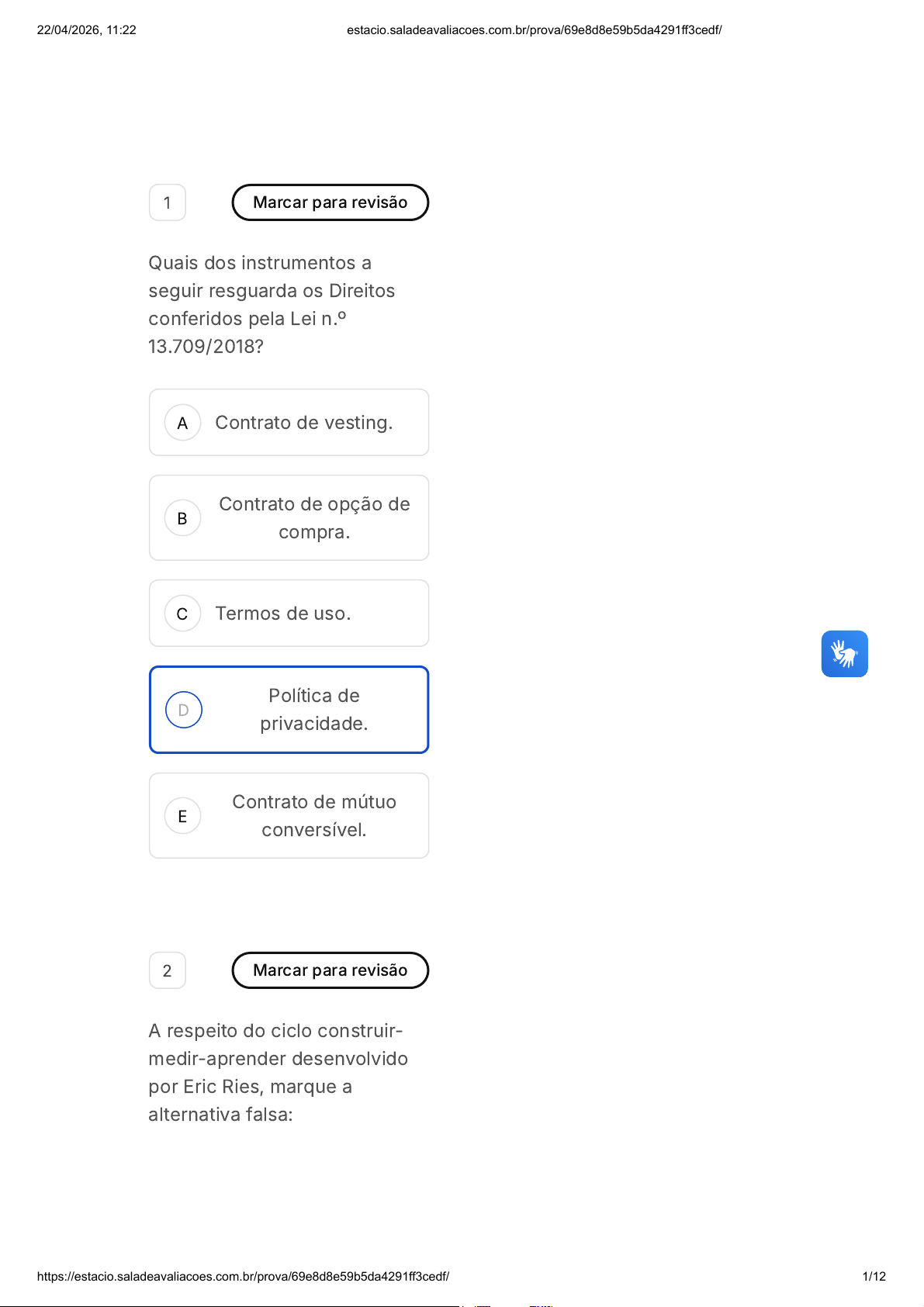 A B C D E 1 Marcar para revisão Quais dos instrumentos a seguir resguarda os Direitos conferidos pela Lei n.º 13.709/2018? Contrato de vesting. Contrato de opção de compra. Termos de uso. Política de privacidade. Contrato de mútuo conversível. 2 Marcar para revisão A respeito do ciclo construir- medir-aprender desenvolvido por Eric Ries, marque a alternativa falsa: 22/04/2026, 11:22 estacio.saladeavaliacoes.com.br/prova/69e8d8e59b5da4291ff3cedf/ https://estacio.saladeavaliacoes.com.br/prova/69e8d8e59b5da4291ff3cedf/ 1/12 A B C D E A B O MVP é parte fundamental nesse processo. A coleta de dados para fins de melhoria de produto é muito importante nesse processo. O feedback de clientes faz parte desse processo. É uma modalidade contratual extremamente importante. O processo pode ser repetido até que se encontre o produto final. 3 Marcar para revisão Das alternativas abaixo, não é uma modalidade de startup jurídica a: Civic tech. Taxtech. 22/04/2026, 11:22 estacio.saladeavaliacoes.com.br/prova/69e8d8e59b5da4291ff3cedf/ https://estacio.saladeavaliacoes.com.br/prova/69e8d8e59b5da4291ff3cedf/ 2/12 C D E A B C Startup com foco em jurimetria. Insurtech. Regtech. 4 Marcar para revisão Quanto à proteção da propriedade intelectual em uma startup, marque a alternativa verdadeira: A proteção à propriedade intelectual não é aplicável para startups. A propriedade intelectual diz respeito, exclusivamente, à proteção de patentes. É extremamente importante registrar a marca de uma startup no INPI. 22/04/2026, 11:22 estacio.saladeavaliacoes.com.br/prova/69e8d8e59b5da4291ff3cedf/ https://estacio.saladeavaliacoes.com.br/prova/69e8d8e59b5da4291ff3cedf/ 3/12 D E A B C A Lei n.º 9.279 de 1996 não é relevante para a proteção de marcas. Não abrange a proteção do software. 5 Marcar para revisão Em geral, a publicação de um pedido de patente se dá: Após a realização da busca e conclusão do exame técnico. Após 60 dias contados do depósito do pedido de patente no Brasil ou de sua prioridade, se houver. Após 18 meses contados do depósito do pedido de patente no Brasil ou de sua prioridade, se houver. 22/04/2026, 11:22 estacio.saladeavaliacoes.com.br/prova/69e8d8e59b5da4291ff3cedf/ https://estacio.saladeavaliacoes.com.br/prova/69e8d8e59b5da4291ff3cedf/ 4/12 D E A B C Apenas após o depositante requerer a publicação do pedido de patente, mediante pagamento de retribuição específica. Imediatamente após o depósito do pedido de patente no Brasil. 6 Marcar para revisão Um registro de marca vigora por 10 (dez) anos a contar: Da data de depósito. Da data do deferimento. Da data da publicação da decisão do recurso interposto contra o indeferimento, através da qual foi reformada a decisão de indeferimento. 22/04/2026, 11:22 estacio.saladeavaliacoes.com.br/prova/69e8d8e59b5da4291ff3cedf/ https://estacio.saladeavaliacoes.com.br/prova/69e8d8e59b5da4291ff3cedf/ 5/12 D E A B C Da data da concessão do registro. Da data da decisão que nega provimento ao processo administrativo de nulidade iniciado por terceiro. 7 Marcar para revisão O novo campo de estudo que tem como objetivo tornar mais acessível o acesso à justiça, e comumente faz uso de recursos visuais, para passar a mensagem pretendida de forma simplificada e direta, buscando melhor traduzir textos complexos e captar a atenção daquele a quem a mensagem é direcionada, é comumente chamado de: Trade dress. Visual law. Direito da concorrência. 22/04/2026, 11:22 estacio.saladeavaliacoes.com.br/prova/69e8d8e59b5da4291ff3cedf/ https://estacio.saladeavaliacoes.com.br/prova/69e8d8e59b5da4291ff3cedf/ 6/12 D E A B Marca mista. Fashion law. 8 Marcar para revisão Acerca da conceito que pode ser empregado para a Análise Econômica do Direito, escolha a alternativa correta: As premissas ou pressupostos básicos da Análise Econômica do Direito são: infinitude de elementos, irracionalidade e maximização da utilidade. A Análise Econômica não serve para o sopesamento de decisões pessoais, individuais, como se casar ou continuar namorando, trocar de carro ou comprar uma casa. 00 hora : 46 min : 37 seg Ocultar Questão 10 de 10 1 2 3 4 5 SM2 Direito, Tecnologia e Empreendimento 22/04/2026, 11:22 estacio.saladeavaliacoes.com.br/prova/69e8d8e59b5da4291ff3cedf/ https://estacio.saladeavaliacoes.com.br/prova/69e8d8e59b5da4291ff3cedf/ 7/12 C D E Um dos principais pressupostos da Análise Econômica do Direito é a inexistência de escassez, ou seja, parte-se do pressuposto de que todos os elementos da natureza são infinitos. A Análise Econômica do Direito parte de um único pressuposto: as pessoas são seres racionais e buscam maximizar suas decisões, isto é, extrair a maior utilidade possível. A escassez, uma das principais premissas da Análise Econômica do Direito, é empregada no sentido de que as coisas ou os elementos que nos cercam não são ilimitados e, por isso, as pessoas têm a necessidade de equacionar a alocação dos recursos para a tomada de decisão. Respondidas (10) Em branco (0) Finalizar prova 6 7 8 9 10 22/04/2026, 11:22 estacio.saladeavaliacoes.com.br/prova/69e8d8e59b5da4291ff3cedf/ https://estacio.saladeavaliacoes.com.br/prova/69e8d8e59b5da4291ff3cedf/ 8/12 A B 9 Marcar para revisão Em relação à Análise Econômica do Direito e à propositura de ações judiciais, assinale a alternativa correta: Três critérios podem ser utilizados na análise decisória sobre a propositura de ações judiciais: 1. probabilidade de êxito da demanda; 2. benefício esperado com a ação; e 3. custos e despesas totais relativas ao ajuizamento. A Análise Econômica do Direito não serve para o estudo da propositura de ações judiciais em contraposição à celebração de acordos. 22/04/2026, 11:22 estacio.saladeavaliacoes.com.br/prova/69e8d8e59b5da4291ff3cedf/ https://estacio.saladeavaliacoes.com.br/prova/69e8d8e59b5da4291ff3cedf/ 9/12 C D E Partindo do modelo da escolha racional, pode-se utilizar os se