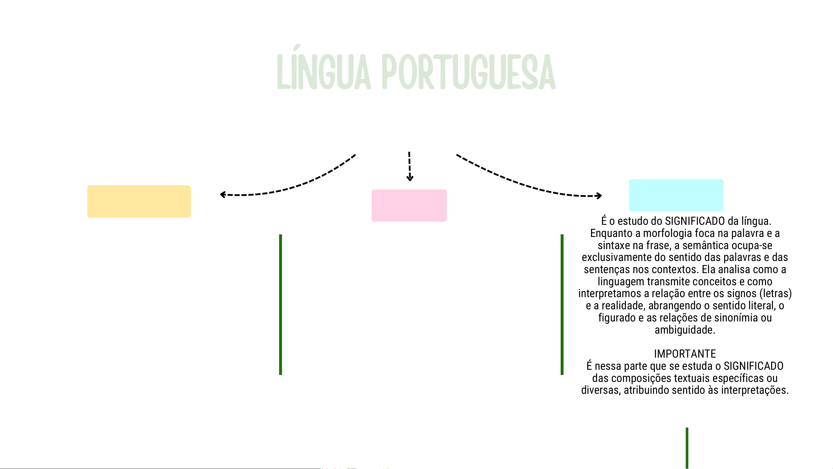 LÍNGUA PORTUGUESALÍNGUA PORTUGUESALÍNGUA PORTUGUESA SINTAXE É o campo da linguística que estuda a FRASE e as relações de dependência e a disposição das palavras dentro de uma frase, oração ou período. A sintaxe foca na função que dos vocábulos desempenham ao se conectar uns com outros, estabelecendo as regras de concordância, regência e ordem (sujeito, predicado, complementos e adjuntos). Em suma, é o estudo da estrutura combinatória que permite que as palavras se organizem para transmitir uma mensagem coerente e articulada. IMPORTANTE É nessa parte da língua portuguesa que o estudo foca, especificamente, na FRASE dando sentido através das funções que cada palavra vai exercer para dar sentido a mensagem. SEMÂNTICA É o estudo do SIGNIFICADO da língua. Enquanto a morfologia foca na palavra e a sintaxe na frase, a semântica ocupa-se exclusivamente do sentido das palavras e das sentenças nos contextos. Ela analisa como a linguagem transmite conceitos e como interpretamos a relação entre os signos (letras) e a realidade, abrangendo o sentido literal, o figurado e as relações de sinonímia ou ambiguidade. IMPORTANTE É nessa parte que se estuda o SIGNIFICADO das composições textuais específicas ou diversas, atribuindo sentido às interpretações. MORFOLOGIA É o campo da língua portuguesa dedicado ao estudo individual e específico da PALAVRA, analisando sua estrutura interna (morfemas como radicais e afixos), seus processos de formação (derivação e composição) e sua classificação dentro das dez categorias gramaticais. IMPORTANTE A morfologia foca, exatamente, na arquitetura isolada da PALAVRA (VOCÁBULO), compreendendo como ela é construída, como ele se flexiona para indicar gênero, número ou tempo, e a qual classe pertence conforme sua natureza fundamental. Para estudar a língua portuguesa, primeiro precisamos entender que ela se divide exatamente em três partes, como se fosse um armário com três portas. como iniciar um estudo sobre a Aprender a base estrutural da língua portuguesa com certeza facilitará muito o seu entendimento sobre o idioma! Bons estudos! como iniciar um estudo sobre a LÍNGUA PORTUGUESA Para estudar a língua portuguesa, primeiro precisamos entender que ela se divide exatamente em três partes, como se fosse um armário com três portas. SEMÂNTICA MORFOLOGIA SINTAXE Aprender a base estrutural da língua portuguesa com certeza facilitará muito o seu entendimento sobre o idioma! Bons estudos!