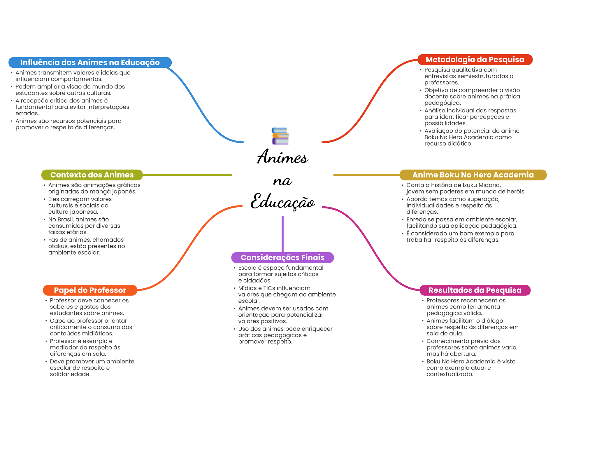Influência dos Animes na Educação Metodologia da Pesquisa Animes transmitem valores e ideias que Pesquisa qualitativa com entrevistas semiestruturadas a influenciam comportamentos. professores. Podem ampliar a visão de mundo dos estudantes sobre outras culturas. Objetivo de compreender a visão docente sobre animes na prática A recepção crítica dos animes é pedagógica. fundamental para evitar interpretações erradas. Análise individual das respostas para identificar percepções e Animes são recursos potenciais para possibilidades. promover respeito às diferenças. Avaliação do potencial do anime Boku No Hero Academia como recurso didático. Animes Contexto dos Animes Anime Boku No Hero Academia na Animes são animações gráficas Conta a história de Izuku Midoria, originadas do mangá japonês. jovem sem poderes em mundo de heróis. Eles carregam valores Educação Aborda temas como superação, culturais e sociais da individualidades e respeito às cultura japonesa. diferenças. No Brasil, animes são Enredo se passa em ambiente escolar, consumidos por diversas facilitando sua aplicação pedagógica. faixas etárias. É considerado um bom exemplo para de animes, chamados trabalhar respeito às diferenças. otakus, estão presentes no ambiente escolar. Considerações Finais Escola é espaço fundamental para formar sujeitos críticos e cidadãos. Papel do Professor Mídias e TICs influenciam Resultados da Pesquisa valores que chegam ao ambiente Professor deve conhecer escolar. Professores reconhecem saberes e gostos dos Animes devem ser usados com animes como ferramenta estudantes sobre animes. orientação para potencializar pedagógica válida. Cabe ao professor orientar valores positivos. Animes facilitam O diálogo criticamente consumo dos Uso dos animes pode enriquecer sobre respeito às diferenças em conteúdos midiáticos. práticas pedagógicas e sala de aula. Professor é exemplo e promover respeito. Conhecimento dos mediador do respeito às professores sobre animes varia, diferenças em sala. mas há abertura. Deve promover um ambiente Boku No Hero Academia é visto escolar de respeito e como exemplo atual e solidariedade. contextualizado.