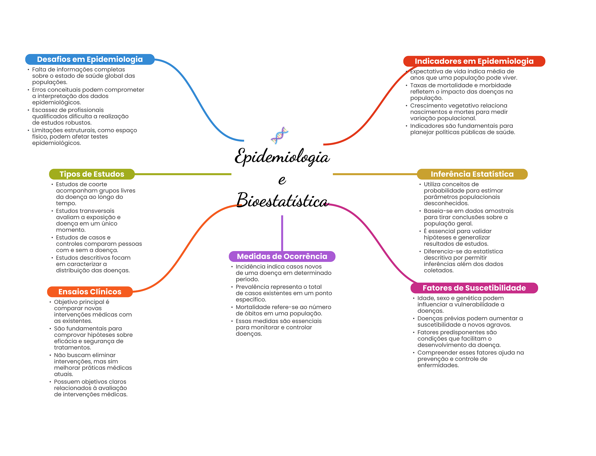 Desafios em Epidemiologia Indicadores em Epidemiologia Falta de informações completas Expectativa de vida indica média de sobre estado de saúde global das anos que uma população pode viver. populações. Taxas de mortalidade e morbidade Erros conceituais podem comprometer refletem impacto das doenças na a interpretação dos dados população. epidemiológicos. Crescimento vegetativo relaciona Escassez de profissionais nascimentos e mortes para medir qualificados dificulta a realização variação populacional. de estudos robustos. Indicadores são fundamentais para Limitações estruturais, como espaço planejar políticas públicas de saúde. físico, podem afetar testes epidemiológicos. Epidemiologia Tipos de Estudos Inferência Estatística Estudos de coorte e Utiliza conceitos de acompanham grupos livres probabilidade para estimar da doença ao longo do Bioestatística parâmetros populacionais tempo. desconhecidos. Estudos transversais Baseia-se em dados amostrais avaliam a exposição e para tirar conclusões sobre a doença em um único população geral. momento. É essencial para validar Estudos de casos e hipóteses e generalizar controles comparam pessoas resultados de estudos. com e sem a doença. Diferencia-se da estatística Estudos descritivos focam Medidas de Ocorrência descritiva por permitir em caracterizar a Incidência indica casos novos inferências além dos dados distribuição das doenças. coletados. de uma doença em determinado período. Prevalência representa O total Ensaios Clínicos Fatores de Suscetibilidade de casos existentes em um ponto Objetivo principal é específico. Idade, sexo e genética podem comparar novas Mortalidade refere-se ao número influenciar a vulnerabilidade a de óbitos em uma população. doenças. intervenções médicas com as existentes. Essas medidas são essenciais Doenças prévias podem aumentar a para monitorar e controlar suscetibilidade a novos agravos. São fundamentais para comprovar hipóteses sobre doenças. Fatores predisponentes são eficácia e segurança de condições que facilitam tratamentos. desenvolvimento da doença. Não buscam eliminar Compreender esses fatores ajuda na intervenções, mas sim prevenção e controle de enfermidades. melhorar práticas médicas atuais. Possuem objetivos claros relacionados à avaliação de intervenções médicas.
