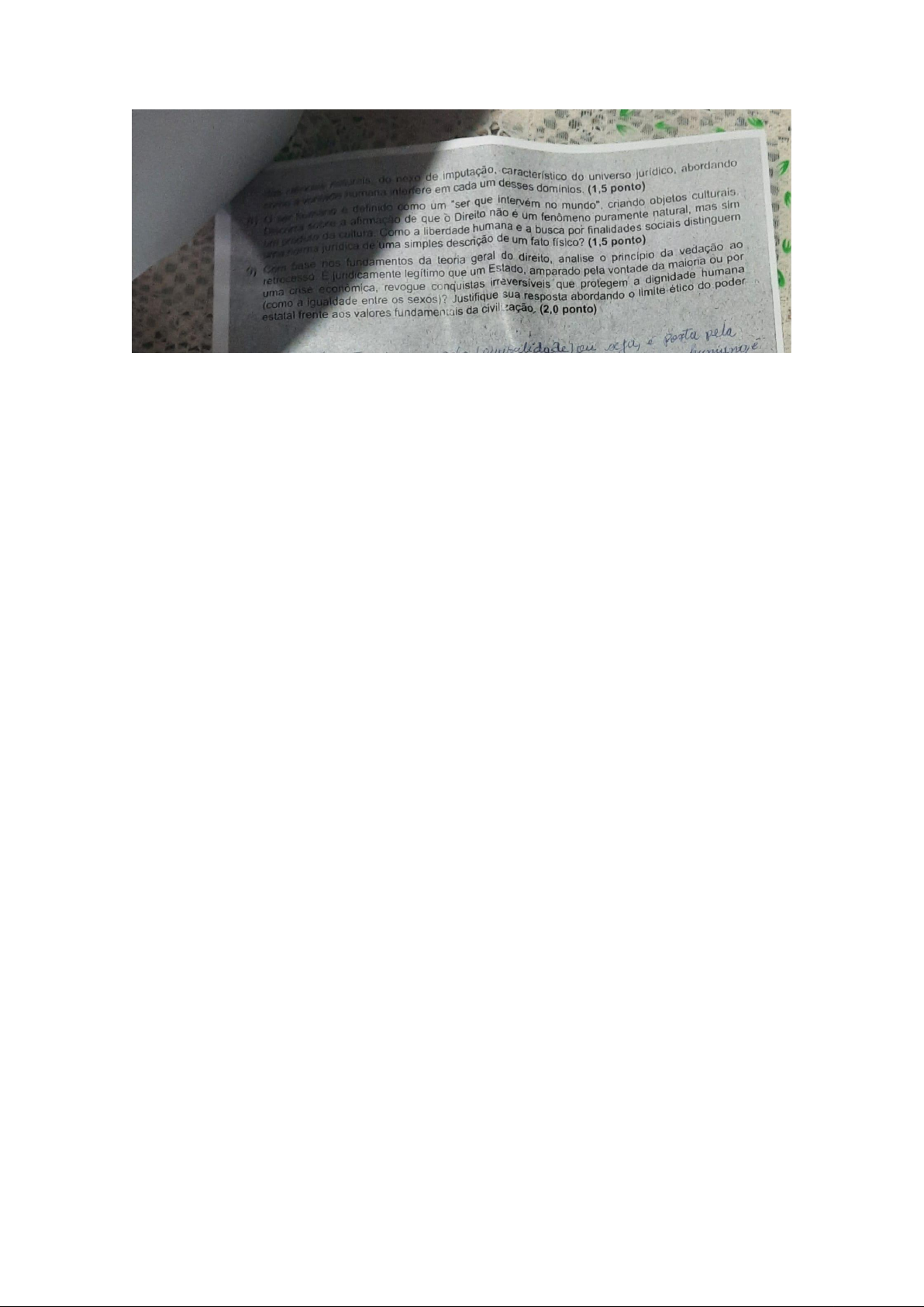 do nexo de imputação, característico do universo jurídico, abordando humana em cada um desses (1,5 ponto) cultura. a Como a que liberdade humana de e a busca por finalidades sociais definido como de um "ser Direito que não intervém é um fenômeno no puramente criando objetos natural, distinguem mas sim culturais base nos fundamentos da geral do direito, analise o princípio da maioria vedação ou por ao de uma simples descrição um fato físico? (1,5 ponto) E jundicamente legítimo que um Estado, amparado pela vontade da humana (como uma retrocesso a igualdade econômica, entre revogue sexos)? conquistas Justifique irreversiveis sua resposta que abordando protegem a limite dignidade ético do poder estatal frente aos valores fundamentais da (2,0 ponto) posta pela^ total de maior rigor formal na aplicação das leis garantir a segurança A de que modelo positivista formal foi direitos regimes como cometidos sob de prevenir abusos e violações de reconhecimento de que os de obstáculos à efetividade do proporcionalidade e razoabilidade eram d) de da que juiz deve B deixar de ser um agente ativo para se tornar um mero aplicador e) A promulgação do Código Napoleônico, que limitou a interpretação constitucional aos valores éticos da 4) A doutrina jurídica clássica disting as do direito em materiais e formais para explicar como alternati se e se Sobre essa classificação, assinale a a) pr mente processos legislativos disciplinados pelo b) pc S contém conteúdo normativo do sistema, são S, hi tóricos e culturais como a pandemia da ento no mas. são SOC is que precedem criação da norma jurídica prátic mate sendo termos no e easa 5) Diferentes tradições em pesos distintos suas fontes Con comparação entre mod axão e Continental uropeu apresent a) modelo Anglo-Saxão caracteriza-se proeminência absoluta da lei escrita sobre os No modelo Continental Europeu, as decisões judiciais possuem tradicionalmente mesmo efeito vinculante que no sistema de Common Law. Bola c) sistema de precedentes, onde casos posteriores devem seguir decisões passadas, é uma característica central do modelo d) A codificação e a proeminência legislativa são marcas registradas da tradição da e) Atualmente, existe um modelo uniforme de fontes do direito aplicado de forma idêntica por todas as 6) como Historicamente relevanté, costume jurídico passou por transformações em sua aceitação correta: ponto): fonte formal. Segundo material didático, sobre costume, assinale a alternativa a) costume permanece como a fonte formal mais relevante no direito brasileiro atual, superando a b) o princípio da legalidade e a dinâmica civilizatória contribuiram para declínio do costume como fonte formal de relevância. Para ser considerado fonte, o costume dispensa a convicção de sua obrigatoriedade, bastando a repetição do d) o costume é a única fonte do direito que não sofre variações ao longo do tempo ou entre diferentes nações. e) A crise do Estado contemporâneo provocou um ressurgimento do costume em detrimento das normas regulamentares. 7) Explique a diferença fundamental entre as leis que regem a natureza e as leis que regem a conduta humana (leis juridicas). Em sua resposta, diferencie nexo de causalidade, próprioCEUMA Data: 15/04/26 Curso: Direito TEORIA FUNDAMENTOS DO DIREITO A Professor Bimestre: Turma: 102 Ana Silva do P. CPD: Nota Rubrica do Professor: AVALIAÇÃO REGIMENTAL OBSERVAÇOES a) Esta contém 9 (nove) questões, sendo cada questão valendo de 0,5 a b) A prova individual não será permitida consulta a apostilas, textos, a celular deve ser desligado. Somente ser (ligado) utilizado após a verificação d) entendimento das questões é parte integrante da prova. e) Utilizar caneta azul ou preta. Responder todas as questões obrigatoriamente na folha de resposta, Bola. g) Aluno que utilizar meios para responder a prova, terá a mesma res Nota 0,0 (Zero) 1) o Positivismo Jurídico consolidou-se no século XIX como uma resposta Jusnaturalismo, trazendo uma nova perspectiva sobre a ciência do Com base no pensamento de Hans Kelsen e Norberto Bobbio, assinale a alternativa correta: (0,5 ponto) a) Hans ciência deveria integrar valores morais e ideologias politicas para ser considerada "pura". b) Norberto Bobbio reformulou a visão de Kelsen, sustentando que jurista deve se do elemento declarativo do Direito em sua atuação c) Para juspositivismo, Direito um conjunto de normas emanadas da natureza humana e não necessariamente do Bobbio critica juspositivismo por considerar jurista uma espécie de ou "calculadora e) o Positivismo Jurídico defende que Direito possui múltiplos valores, não se limitando as normas postas pelo Estado. 2) o do Positivismo para a aplicação do Direito é a subsunção, fundamentada é correto na Sobre esse método e a atuação do magistrado nesse modelo, a) fato (caso è considerado a premissa maior do silogismo jurídico. ponto de partida que determina qual norma será aplicada ao caso. a célebre frase de deve atuar como a "boca da lei", sendo um ser que apenas pronuncia as palavras da norma. d) A subsunção que juiz deve adapta as normas às condições históricas e sociais de cada e-easa e) No a consequência legal não surge de forma automática, de interpretação subjetiva do 3) A do século XX, modelo positivista estrito passou a sofrer duras do Pós-Positivismo. Qual foi principal fator histórico e teórico que (1 ponto):D Dado - easa 4: e - B- Bola 1,0 leis naturais eausalidade, ou seja, pasta pela natureza, nasee e leis juridieas pelo humano a Deve ser) I Der humano e ser de eriar evi- sas, mas em decorrente fatos e culturais envolvendo todos esses de ser puramente natural e passa ser soberana, Roje e no legislativo, e não, eomo diz: a do a de Dews, sempre a voz do no não mais eomo nos primordios gue 0 poder as minorias. lm uma so pessoa, em um so Hoje leis amparam