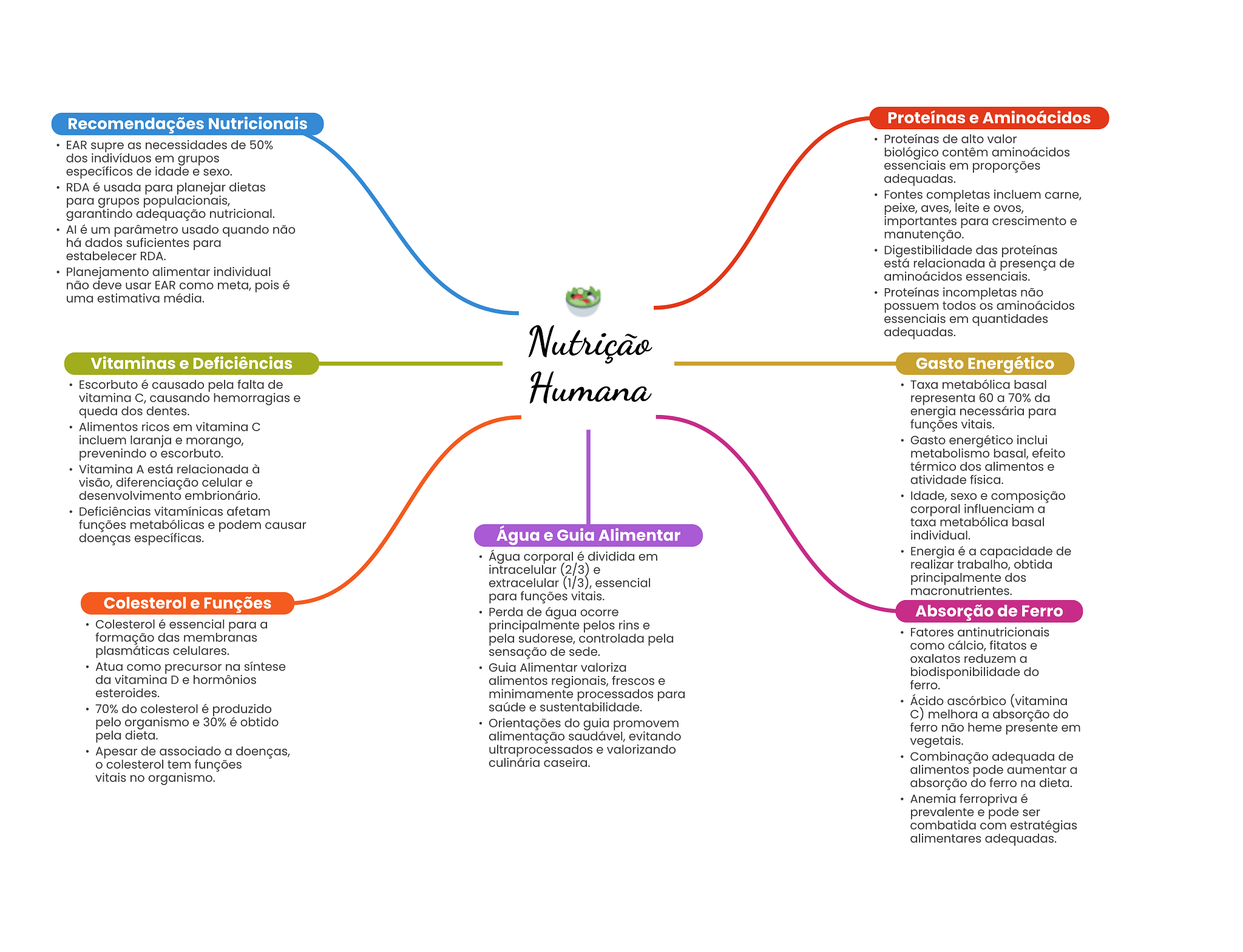 Recomendações Nutricionais Proteínas e Aminoácidos Proteínas de alto valor EAR supre as necessidades de 50% dos indivíduos em grupos biológico contêm aminoácidos específicos de idade e sexo. essenciais em proporções adequadas. RDA é usada para planejar dietas para grupos populacionais, Fontes completas incluem carne, garantindo adequação nutricional. peixe, aves, leite e ovos, importantes para crescimento e é um parâmetro usado quando não manutenção. há dados suficientes para estabelecer RDA. Digestibilidade das proteínas está relacionada à presença de Planejamento alimentar individual aminoácidos essenciais. não deve usar EAR como meta, pois é uma estimativa média. Proteínas incompletas não possuem todos OS aminoácidos essenciais em quantidades Nutrição adequadas. Vitaminas e Deficiências Gasto Energético Escorbuto é causado pela falta de vitamina C, causando hemorragias e Humana Taxa metabólica basal representa 60 a 70% da queda dos dentes. energia necessária para Alimentos ricos em vitamina funções vitais. incluem laranja e morango, Gasto energético inclui prevenindo escorbuto. metabolismo basal, efeito Vitamina A está relacionada à térmico dos alimentos e visão, diferenciação celular e atividade física. desenvolvimento embrionário. Idade, sexo e composição Deficiências vitamínicas afetam corporal influenciam a funções metabólicas e podem causar taxa metabólica basal doenças específicas. Água e Guia Alimentar individual. Água corporal é dividida em Energia é a capacidade de intracelular (2/3) e realizar trabalho, obtida extracelular (1/3), essencial principalmente dos para funções vitais. macronutrientes. Colesterol e Funções Perda de água ocorre Absorção de Ferro Colesterol é essencial para a principalmente pelos rins e formação das membranas Fatores antinutricionais pela sudorese, controlada pela plasmáticas celulares. como cálcio, fitatos e sensação de sede. oxalatos reduzem a Atua como precursor na síntese Guia Alimentar valoriza biodisponibilidade do da vitamina D e hormônios alimentos regionais, frescos e ferro. esteroides. minimamente processados para 70% do colesterol é produzido saúde e sustentabilidade. Ácido ascórbico (vitamina c) melhora a absorção do pelo organismo e 30% é obtido Orientações do guia promovem ferro não heme presente em pela dieta. alimentação saudável, evitando vegetais. Apesar de associado a doenças, ultraprocessados e valorizando colesterol tem funções culinária caseira. Combinação adequada de alimentos pode aumentar a vitais no organismo. absorção do ferro na dieta. Anemia ferropriva é prevalente e pode ser combatida com estratégias alimentares adequadas.
