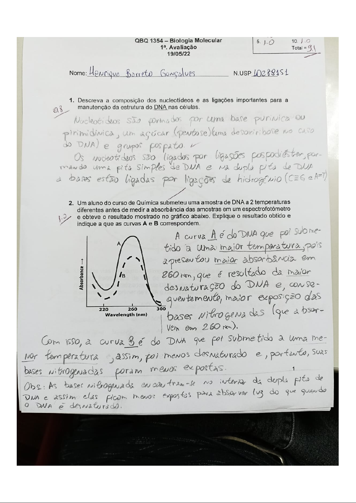 QBQ 1354 - Biologia Molecular 5. 1.0 10. 1.0 Avaliação Total = 9.1 19/05/22 Nome: Barreto N.USP 10288151 1. Descreva a composição dos nucleotídeos e as ligações importantes para a manutenção da estrutura do DNA nas células. sas por uma base purinica pirimidinica, um desoxiribose no caso do DNA) e grupos Os ligados por ligasões simples de DNA e Na dupla pita de DUA a bases estão ligadas de 2. Um aluno do curso de Química submeteu uma amostra de DNA a 2 temperaturas diferentes antes de medir a absorbância das amostras em um espectrofotômetro 1.0 e obteve o resultado mostrado no gráfico abaixo. Explique o resultado obtido e indique a que as curvas A e B correspondem. A curva Aé do DNA que subme- A tido a maior maior em Absorbance que é resultado da do DNA e, maior exposição das 220 260 300 Wavelength (nm) bases das (que a bser- em 260 Com isso, a B do DNA que for a uma me- Nor temperatura desNaturado e, bases Nitrogenadas foram expostas. 1 Obs.: As bases -se NO dupla de DNA e assim clas para ver do que DNAEsse DNA + histonas é 3. DNA das células eucarióticas interage com um grupo de proteínas, 1.0 denominadas histonas. Explique o tipo de ligação responsável pela interação entre essas proteínas e o DNA e qual é a função dessas interações. A entre as e DNA e uma oNde 25 0 DNA As pelo 1° de do DNA em 10 DNA em de 4. Considerando-se que o esquema abaixo represente uma bolha de replicação do DNA, complete esquema, mostrando: 0.2 Posição da origem de replicação; 0,2 As fitas de DNA sendo sintetizadas; 0.2 As extremidades 5'e 3' de todas as fitas (novas e velhas); 0,2 Direção da replicação; 0.0 Posições dos "primers". Origan de 5' 3' Primers 5' 3' da replicasão 3' replicação 3' 3' Primers Origan de 5. Uma das vias de reparo de dímeros de pirimidina é a de excisão de nucleotídeos, na qual fragmentos da fita de DNA contendo o dano são retirados por uma nuclease e re-sintetizados pela DNA polímerase I em E. coli. Nesta via de reparo, a síntese de um primer de RNA é necessária para que a DNA pol I faça o reparo? Explique. Pais a AP Nuclease deixa uma extremidade quando certa 0 com a DNA - peliverase inserir 0 2As 6. As reações de amplificação de DNA in vitro com a enzima Taq DNA polimerase, de Thermus são normalmente mutagênicas. Com base nas listadas na tabela abaixo, explique por que isso acontece. ) DNA polimerases Eschenchia coli Thermus aquaticus Atividades I II III I Polimerase 5' 3' Sim Sim Sim Sim Exonuclease Sim Sim Sim Não Exonuclease Sim Não Não Sim ISSO devido de 5' DNA I. pela de um mal durante de DNA e F da base Na fita 7. Depois de testar o efeito mutagênico de um agente alquilante através do teste de Ames, um aluno do curso de Química obteve o resultado abaixo. Explique as resultado obtido e as conclusões sobre o efeito mutagênico. N2 de observa-fe um crescimento at "Normal" da cultura, de forma pelo No Na presence de + 32 que ha padrão de cres- 33 Agente alquilante da cultura do redor do Pode-se observar que Nas proximidades do houve crescimento da de em regiões mais Com isso, 2 do é alta as sofreram que foram a 2 do bacterias sofreram que 3 letais e permitiram 0 crescimento dad Se a deixar "mais da da Na taxa de e, caso 2 torne mais parecida com a da T20 da taxa de 1.0 8. Considerando que a sequência de DNA abaixo corresponda a um gene com seu promotor: 0,25 a. Indique qual é a fita codificadora; 0,25 b. Indique na figura a sequência de RNA transcrito a partir desse gene hipotético, com suas extremidades 5' e 3'; 0.25 C. Informe quais sequências são importantes para a transcrição e quem as reconhece. d Mutações que alterassem a sequência -10 de TATAAT para TATGGC teriam codificadora consequências na transcrição deste gene hipotético? Quais? -35 3' C As importantes, pois as re @ direciona a RNA- para 0 local de & A sequência de Ce de 520 para a do de mRNA do essa e pela que Se- Fre perda de pelo DNA e pelo RNA, detes. 9. No processo de tradução em procariotos, explique como o ribossomo reconhece 1.0 o códon iniciador. A 30s do 0 AUG, per meio de See to com a Sequencia de upstream 20 codon mRNA SD 3' 305 10. Imagine que uma mutação no gene na aminoacil-tRNA sintetase de glicina faça com que esta enzima não mais reconheça tRNA com o anticódon complementar a GGG, mas sim complementar ao códon AAA (de lisina). Quais seriam as consequências para a tradução na célula? Com 0 do com GGG 2 ira "colocar" glicina NO complementar codon AAA de lisina. Com isso, ser colocada NO lugar da lisina Na 4