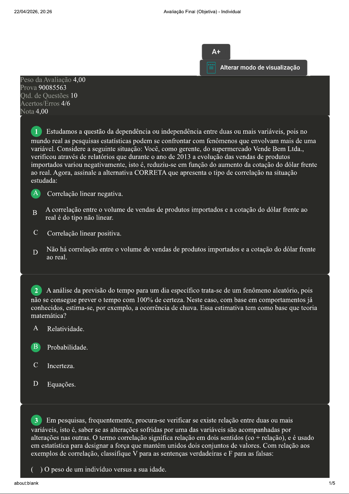 22/04/2026, 20:26 Avaliação Final (Objetiva) Individual A+ Alterar modo de visualização Peso da Avaliação 4,00 Prova 90085563 Qtd. de Questões 10 Acertos/Erros 4/6 Nota 4,00 1 Estudamos a questão da dependência ou independência entre duas ou mais variáveis, pois no mundo real as pesquisas estatísticas podem se confrontar com fenômenos que envolvam mais de uma variável. Considere a seguinte situação: Você, como gerente, do supermercado Vende Bem Ltda., verificou através de relatórios que durante o ano de 2013 a evolução das vendas de produtos importados variou negativamente, isto é, reduziu-se em função do aumento da cotação do dólar frente ao real. Agora, assinale a alternativa CORRETA que apresenta o tipo de correlação na situação estudada: A Correlação linear negativa. B A correlação entre o volume de vendas de produtos importados e a cotação do dólar frente ao real é do tipo não linear. Correlação linear positiva. D Não há correlação entre o volume de vendas de produtos importados e a cotação do dólar frente ao real. 2 A análise da previsão do tempo para um dia específico trata-se de um fenômeno aleatório, pois não se consegue prever o tempo com 100% de certeza. Neste caso, com base em comportamentos já conhecidos, estima-se, por exemplo, a ocorrência de chuva. Essa estimativa tem como base que teoria matemática? A Relatividade. B Probabilidade. Incerteza. D Equações. 3 Em pesquisas, frequentemente, procura-se verificar se existe relação entre duas ou mais variáveis, isto é, saber se as alterações sofridas por uma das variáveis são acompanhadas por alterações nas outras. termo correlação significa relação em dois sentidos (co + relação), e é usado em estatística para designar a força que mantém unidos dois conjuntos de valores. Com relação aos exemplos de correlação, classifique V para as sentenças verdadeiras e F para as falsas: ( ) peso de um indivíduo versus a sua idade. about:blank 1/522/04/2026, 20:26 Avaliação Final (Objetiva) Individual ( ) consumo de um determinado país versus a renda da sua população. ( ) volume de água de um determinado rio versus a quantidade de alunos. ( ) volume de extração do petróleo versus a quantidade de sangue no corpo humano. Assinale a alternativa que apresenta a sequência CORRETA: A V-V-F-V. V-V-F-F. F-F-V-V. D F-V-F-V. 4 A correlação de Pearson avalia a relação linear entre duas variáveis contínuas. Uma relação é linear quando a mudança em uma variável é associada a uma mudança proporcional na outra variável. Por exemplo, você poderia usar uma correlação de Pearson para avaliar se aumentos na temperatura da instalação de produção estão associados a uma redução da espessura da cobertura de chocolate. Podemos considerar uma escala de correlação. Classifique V para as sentenças verdadeiras e F para as falsas: ( ) Quando a correlação for positiva perfeita ele será muito próximo de 1,0. ( ) Quando a correlação for negativa perfeita ele será muito próximo de 1,0. ( ) Quando a correlação for negativa perfeita ele será muito próximo de -1,0. ( ) Quando a correlação for positiva perfeita ele será muito próximo de -1,0. Assinale a alternativa que apresenta a sequência CORRETA: A V-F-V-F. V-V-F-F. F-V-F-V. D F-F-V-V. 5 [Laboratório Virtual Variáveis Quantitativas e Qualitativas] As variáveis quantitativas são expressas por números e podem ser classificadas em discretas e contínuas. As variáveis discretas contemplam apenas valores inteiros em um determinado intervalo. As variáveis contínuas contemplam qualquer valor em dado intervalo (VIEIRA, 2018). Nesse sentido, considere que você esteja analisando o perfil dos consumidores de uma loja de doces. Então, você aplica um questionário aos visitantes contendo várias informações (variáveis). Sobre uma variável quantitativa discreta, assinale a alternativa CORRETA: Fonte: VIEIRA, S. Estatística básica. 2. ed. São Paulo: Cengage, 2018. about:blank 2/522/04/2026, 20:26 Avaliação Final (Objetiva) Individual A Faixa salarial. B Sexo da pessoa. Faixa etária. D Número de filhos. Revisar Conteúdo do Livro 6 Em determinadas pesquisas estatísticas, o pesquisador pode estar interessado em fenômenos que envolvem o comportamento de mais de uma variável. Essa possível influência de uma variável e outra é abordada no estudo da correlação entre variáveis. Uma das ferramentas utilizadas nesse estudo é o gráfico de dispersão. Observe a figura a seguir, e depois assinale a alternativa CORRETA que representa o tipo de correlação: A Correlação linear negativa. Correlação linear positiva. Correlação não linear. D Não há correlação. Revisar Conteúdo do Livro 7 [Laboratório Virtual Variáveis Quantitativas e Qualitativas] A primeira etapa do processo estatístico consiste na análise da problemática. Na sequência, é realizado o planejamento do estudo, a coleta dos dados, a apuração e a apresentação dos dados e, por fim, a análise e interpretação dos resultados (VIRGILLITO, 2017). Sendo assim, considere que você seja proprietário de uma fábrica de roupa e esteja realizando uma pesquisa de campo para conhecer o perfil dos consumidores. Nessa pesquisa, você questiona a idade dos possíveis consumidores. Sobre a classificação da variável "idade dos consumidores", assinale a alternativa CORRETA: about:blank 3/522/04/2026, 20:26 Avaliação Final (Objetiva) Individual Fonte: VIRGILLITO, Salvatore Benito. Pesquisa de Marketing. Saraiva Educação SA, 2017. A Variável qualitativa contínua. B Variável qualitativa nominal. Variável quantitativa discreta. D Variável quantitativa contínua. Revisar Conteúdo do Livro 8 Os gráficos estatísticos são elementos empregados dentro do método estatístico, que têm por objetivo apresentar os dados obtidos através da pesquisa estatística. Esse elemento tem como vantagem uma melhor visualiz