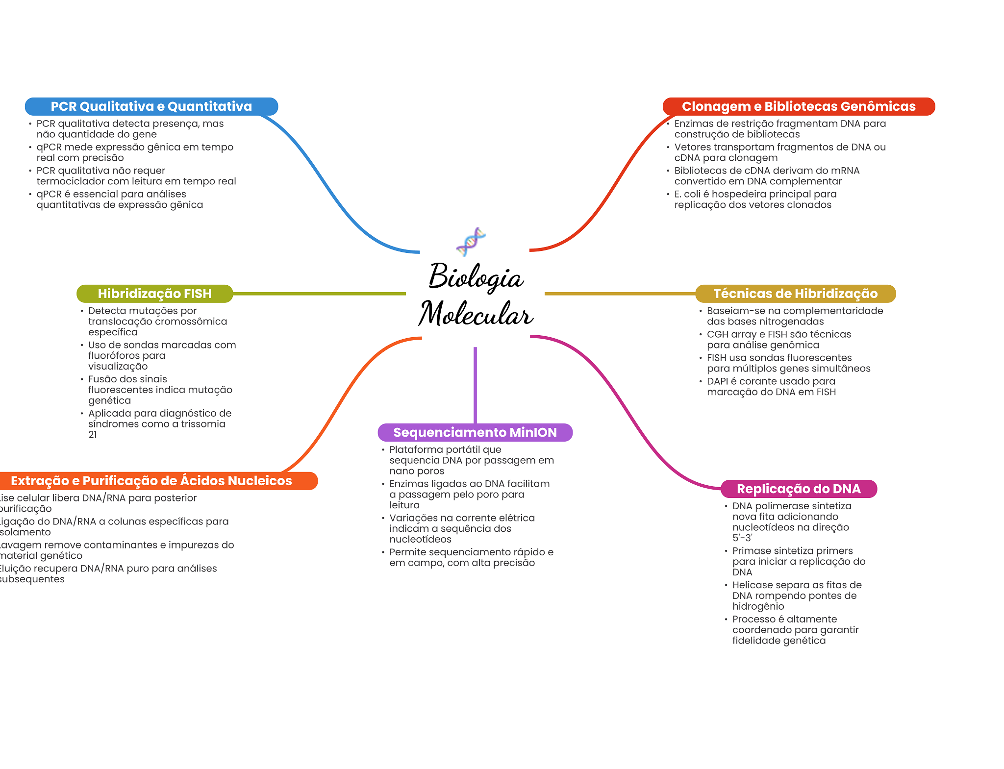 PCR Qualitativa e Quantitativa Clonagem e Bibliotecas Genômicas PCR qualitativa detecta presença, mas Enzimas de restrição fragmentam DNA para não quantidade do gene construção de bibliotecas qPCR mede expressão gênica em tempo Vetores transportam fragmentos de DNA ou real com precisão cDNA para clonagem PCR qualitativa não requer Bibliotecas de cDNA derivam do mRNA termociclador com leitura em tempo real convertido em DNA complementar qPCR é essencial para análises E. coli é hospedeira principal para quantitativas de expressão gênica replicação dos vetores clonados Biologia Hibridização FISH Técnicas de Hibridização Detecta mutações por Molecular Baseiam-se na complementaridade translocação cromossômica das bases nitrogenadas específica CGH array e FISH são técnicas Uso de sondas marcadas com para análise genômica fluoróforos para FISH usa sondas fluorescentes visualização para múltiplos genes simultâneos Fusão dos sinais DAPI é corante usado para fluorescentes indica mutação marcação do DNA em FISH genética Aplicada para diagnóstico de síndromes como a trissomia 21 Sequenciamento MinION Plataforma portátil que sequencia DNA por passagem em nano poros Extração e Purificação de Ácidos Nucleicos Enzimas ligadas ao DNA facilitam a passagem pelo poro para Replicação do DNA celular libera DNA/RNA para posterior purificação leitura DNA polimerase sintetiza igação do DNA/RNA a colunas específicas para Variações na corrente elétrica nova fita adicionando solamento indicam a sequência dos nucleotídeos na direção nucleotídeos 5'-3' avagem remove contaminantes e impurezas do material genético Permite sequenciamento rápido e Primase sintetiza primers luição recupera DNA/RNA puro para análises em campo, com alta precisão para iniciar a replicação do DNA ubsequentes Helicase separa as fitas de DNA rompendo pontes de hidrogênio Processo é altamente coordenado para garantir fidelidade genética