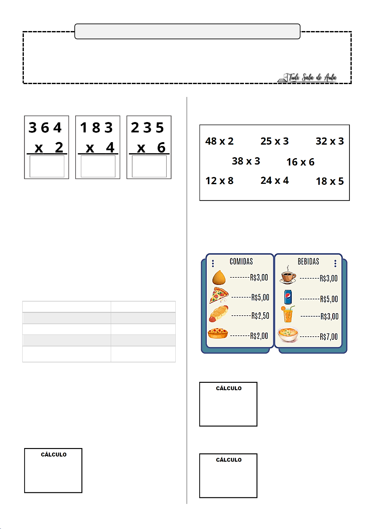 Estudante: __________________________________________________________________ Professor (a): _____________________________________________ Data: ___/___/______ Escola: _________________________________________________ Turma: _____________ 1. Resolva as operações abaixo. 2. Wilson tem um caminhão pesado com capacidade máxima de 14 toneladas de carga. Sabendo que ele fez 6 viagens utilizando a carga máxima que o caminhão suporta em todas elas, quantas toneladas Wilson transportou? a) 20 b) 84 c) 86 d) 94 3. Observe os preços que Luana cobra pelos seus serviços de design de sobrancelhas. Serviços Preço Design simples R$10,00 Henna R$12,00 Design + Henna R$20,00 Serviço completo (Design + Henna + Buço) R$26,00 a) Ao realizar 6 trabalhos com Henna, quanto ela vai receber? ( ) R$60,00 ( ) R$70,00 ( ) R$72,00 b) Ao realizar 4 serviços completos, quanto ela vai receber? Resposta:______________ 4. Circule as operações que possuem resultado diferente de 96. 5. Um grupo de amigos foi a uma lanchonete e pediu 3 fatias de pizza, 4 empadas, 5 coxinhas, 2 tigelas de caldo e 4 sucos. Veja o cardápio com os valores abaixo. a) Quanto os amigos gastaram com comida? Resposta:______________ b) Quanto gastaram com bebida? Resposta:______________ ATIVIDADE DE MATEMÁTICA 6. Veja abaixo o que Fernanda está pensando. A resposta que Fernanda está procurando é a) 46 b) 45 c) 36 d) 18 7. Joana comprou 5 caixas de coloreti com 36 unidades cada uma. Quantas unidades de coloreti Joana comprou? Resposta:______________ 8. Lívia presenteou seu pai com o relógio indicado na imagem abaixo. Quanto ela pagou pelo relógio? a) R$98,00. b) R$280,00. c) R$285,00. d) R$290,00. 9. Roberta é professora de Matemática e ministra 7 aulas por dia. Quantas aulas ela terá ministrado após cumprir 15 dias de trabalho? a) 22 aulas. b) 75 aulas. c) 100 aulas. d) 105 aulas. 10. Complete as operações abaixo com os algarismos que estão faltando. a) 8 x 9 = ______ b) 18 x ____ = 54 c) ____ x 12 = 84 d) 15 x 6 = _____ e) 13 x ____ = 52 f) _____ x 17 = 85 11. Pedro é barbeiro e em um dia de trabalho recebe R$235,00. Quanto ele terá recebido após trabalhar 6 dias? Resposta:______________ 12. Observe algumas opções de colares na joalheria de Valéria. Sobre a imagem acima, assinale a alternativa correta. a) O colar B custa R$52,00. b) O colar C é o mais caro e custa R$260,00. c) O colar A é o mais barato e custa R$192,00. d) O colar A custa R$220,00.