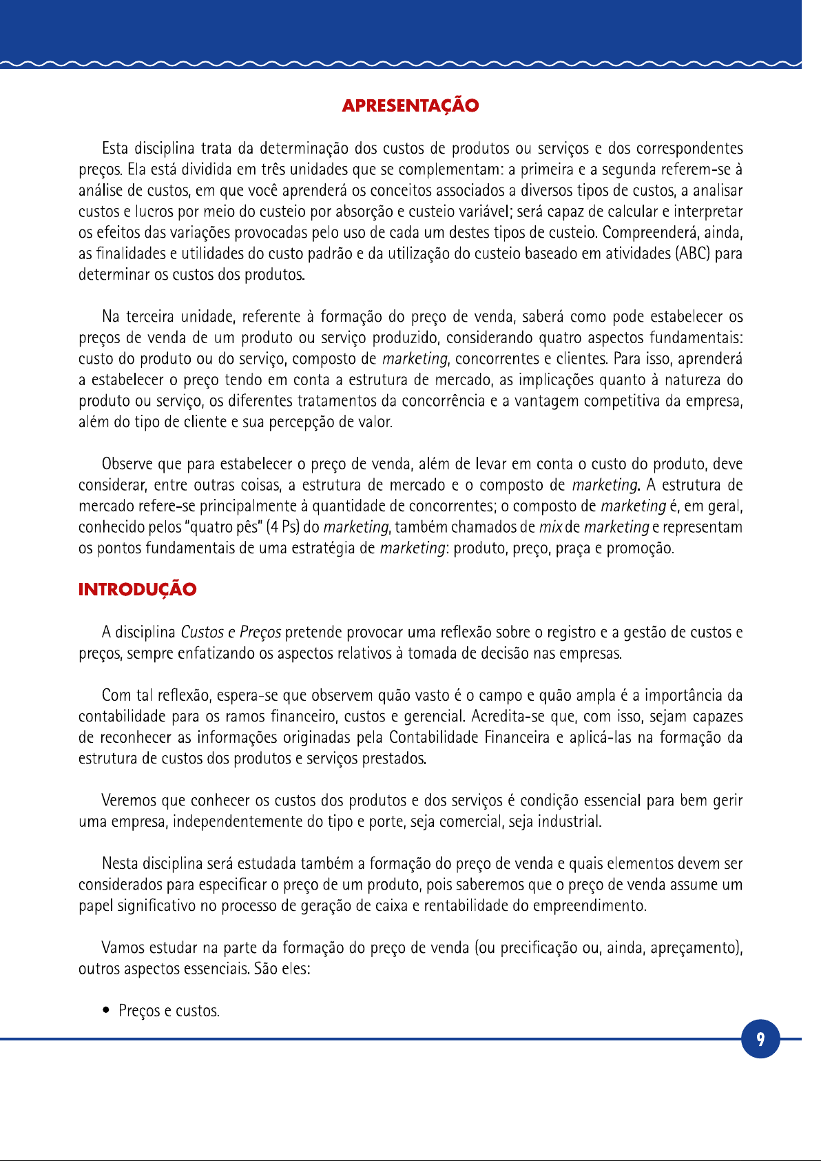 APRESENTAÇÃO Esta disciplina trata da determinação dos custos de produtos ou serviços e dos correspondentes preços. Ela está dividida em três unidades que se complementam: a primeira e a segunda referem-se à análise de custos, em que você aprenderá os conceitos associados a diversos tipos de custos, a analisar custos e lucros por meio do custeio por absorção e custeio variável; será capaz de calcular e interpretar os efeitos das variações provocadas pelo uso de cada um destes tipos de custeio. Compreenderá, ainda, as finalidades e utilidades do custo padrão e da utilização do custeio baseado em atividades (ABC) para determinar os custos dos produtos. Na terceira unidade, referente à formação do preço de venda, saberá como pode estabelecer os preços de venda de um produto ou serviço produzido, considerando quatro aspectos fundamentais: custo do produto ou do serviço, composto de marketing, concorrentes e clientes. Para isso, aprenderá a estabelecer preço tendo em conta a estrutura de mercado, as implicações quanto à natureza do produto ou serviço, os diferentes tratamentos da concorrência e a vantagem competitiva da empresa, além do tipo de cliente e sua percepção de valor. Observe que para estabelecer 0 preço de venda, além de levar em conta 0 custo do produto, deve considerar, entre outras coisas, a estrutura de mercado e 0 composto de marketing. A estrutura de mercado refere-se principalmente à quantidade de concorrentes; 0 composto de marketing é, em geral, conhecido pelos "quatro pês" (4 Ps) do marketing, também chamados de mix de marketing e representam os pontos fundamentais de uma estratégia de marketing: produto, preço, praça e promoção. INTRODUÇÃO A disciplina Custos e Preços pretende provocar uma reflexão sobre 0 registro e a gestão de custos e preços, sempre enfatizando aspectos relativos à tomada de decisão nas empresas. Com tal reflexão, espera-se que observem quão vasto é 0 campo e quão ampla é a importância da contabilidade para os ramos financeiro, custos e gerencial. Acredita-se que, com isso, sejam capazes de reconhecer as informações originadas pela Contabilidade Financeira e aplicá-las na formação da estrutura de custos dos produtos e serviços prestados. Veremos que conhecer os custos dos produtos e dos serviços é condição essencial para bem gerir uma empresa, independentemente do tipo e porte, seja comercial, seja industrial. Nesta disciplina será estudada também a formação do preço de venda e quais elementos devem ser considerados para especificar 0 preço de um produto, pois saberemos que 0 preço de venda assume um papel significativo no processo de geração de caixa e rentabilidade do empreendimento. Vamos estudar na parte da formação do preço de venda (ou precificação ou, ainda, apreçamento), outros aspectos essenciais. São eles: Preços e custos. 9Preços e composto de marketing. Preços e concorrência. Preços e clientes. Com esse conteúdo, será possível gerir um negócio, precificar um serviço, analisar os custos envolvidos em cada produto ou serviço, além de identificar outros aspectos que certamente influenciam no preço. 10CUSTOS E PREÇOS Unidade I 1 TERMINOLOGIA, CLASSIFICAÇÃO E ELEMENTOS FORMADORES DE CUSTOS Nesta primeira unidade vamos conhecer os principais conceitos relacionados a custos e, desta forma, seremos capazes de identificar métodos de custeio empregados na apuração dos custos, bem como compreender melhor os objetivos da contabilidade de custos e 0 significado de custos e despesas. Tomaremos contato com a terminologia aplicada e a classificação dos custos, os elementos formadores do custo, assim como sua classificação em relação ao produto, e ao momento de ocorrência. Serão apresentados tipos de custeios, suas variações e características, vantagens e desvantagens da utilização de cada método: Custeio por absorção com rateio simples e por meio de departamentalização. Custeio baseado em atividades, conhecido também como ABC. Custeio variável, conhecido também como custeio direto. Custos para controle, conceito e diferenças de custo padrão. No fim desta unidade, teremos 0 entendimento do que trata a contabilidade de custos, sua utilização e aplicação nos diferentes ramos de atividades, sejam eles industriais, comerciais e de serviços, bem como a nomenclatura usada para a definição dos termos que compõem 0 custo de produção de um produto industrial. Conheceremos os principais aspectos de apuração de custos, distinguindo custos diretos e custos indiretos, custos variáveis e custos fixos, além de compreender os passos para aplicação dos custos e as implicações do uso de critérios de rateio distintos e utilização de centro de custos. Entendendo a sistemática do método de custeio baseado em atividades (ABC), aprenderemos como podem ser apropriados os custos das atividades aos produtos, e como 0 ABC pode ser utilizado para avaliar desempenho. Reconheceremos a problemática da alocação arbitrária dos custos indiretos fixos, e 0 conceito de margem de contribuição e sua utilidade como ferramenta gerencial. Com 0 conceito de custos para controle, seremos capazes de calcular e analisar as variações de quantidade, variações de preço e variações mistas, que é um tópico bastante importante para análise, controle e acompanhamento da empresa, possibilitando-nos distinguir 0 que é custo padrão, corrente e estimado. Para isso, é preciso conhecer a origem da contabilidade de custos. 11Unidade I Objetivos da aprendizagem Conhecer como surgiu a contabilidade de custos. Assimilar 0 que são custos empresariais. Entender a contabilidade de custos como ferramenta de gestão. Identificar a classificação dos custos e despesas. Conhecer os critérios de rateio e mecanismos de custeio. Qual a origem e os conceitos da contabilidade de custos? A contabilidade de custos teve seu princípio na Revolução Industr