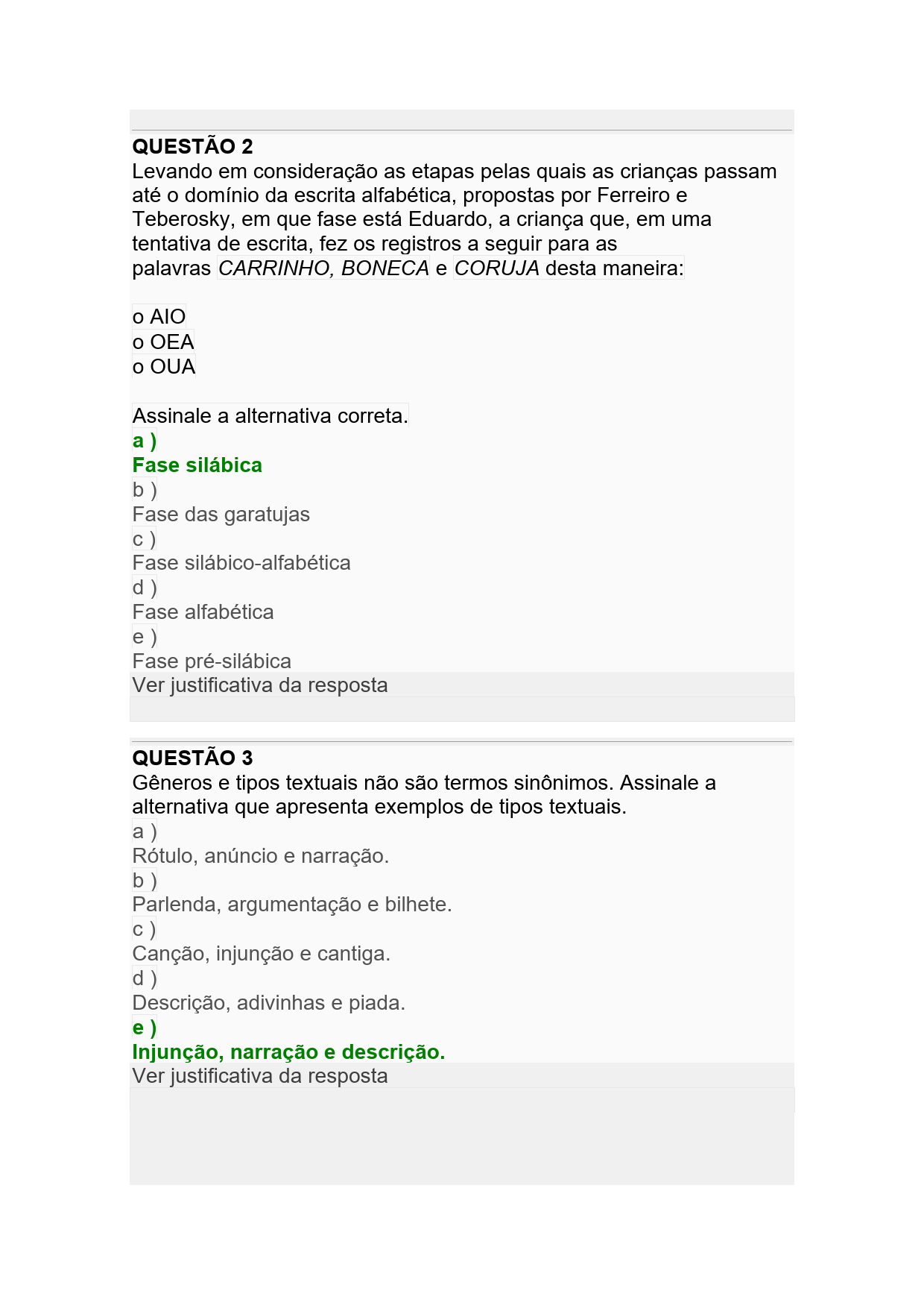 QUESTÃO 2 Levando em consideração as etapas pelas quais as crianças passam até o domínio da escrita alfabética, propostas por Ferreiro e Teberosky, em que fase está Eduardo, a criança que, em uma tentativa de escrita, fez os registros a seguir para as palavras CARRINHO, BONECA e CORUJA desta maneira: o AIO o OEA o OUA Assinale a alternativa correta. a) Fase silábica Fase das garatujas Fase silábico-alfabética d) Fase alfabética Fase pré-silábica Ver justificativa da resposta QUESTÃO 3 Gêneros e tipos textuais não são termos sinônimos. Assinale a alternativa que apresenta exemplos de tipos textuais. a) Rótulo, anúncio e narração. b) Parlenda, argumentação e bilhete. Canção, injunção e cantiga. d) Descrição, adivinhas e piada. e) Injunção, narração e descrição. Ver justificativa da resposta