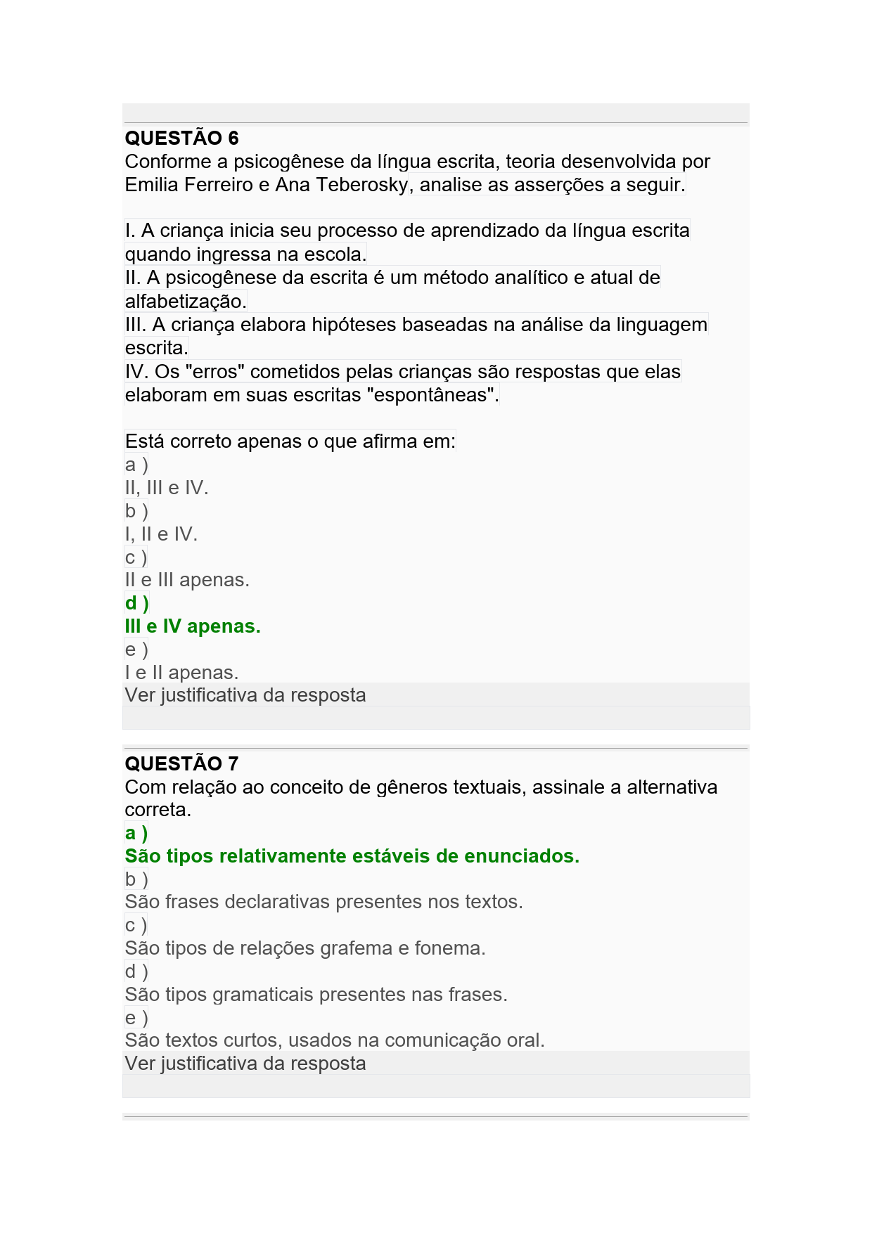 QUESTÃO 6 Conforme a psicogênese da língua escrita, teoria desenvolvida por Emilia Ferreiro e Ana Teberosky, analise as asserções a seguir. I. A criança inicia seu processo de aprendizado da língua escrita quando ingressa na escola. II. A psicogênese da escrita é um método analítico e atual de alfabetização. III. A criança elabora hipóteses baseadas na análise da linguagem escrita. IV. Os "erros" cometidos pelas crianças são respostas que elas elaboram em suas escritas "espontâneas". Está correto apenas o que afirma em: a) II, III e IV. b) I, e IV. c) e III apenas. d) III e IV apenas. le apenas. Ver justificativa da resposta QUESTÃO 7 Com relação ao conceito de gêneros textuais, assinale a alternativa correta. a) São tipos relativamente estáveis de enunciados. b) São frases declarativas presentes nos textos. São tipos de relações grafema e fonema. d) São tipos gramaticais presentes nas frases. São textos curtos, usados na comunicação oral. Ver justificativa da resposta