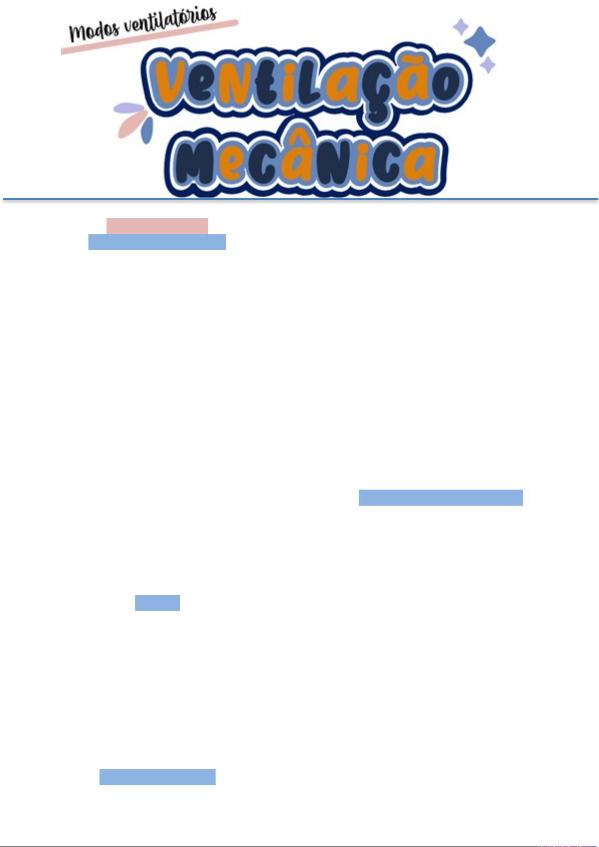 Isis Miranda – T4 Isis Miranda - T4 Conceitos iniciais: Pressão nas vias aéreas: · PEEP: parte restante do ar ao final da expiração fisiológica (volume residual). Em pacientes que estão em ventilação mecânica e intubação endotraqueal a glote é incapaz de manter essa pressão expiratória, de forma que o ventilador se torna responsável por gerar a pressão expiratória final positiva (PEEP). · Ppico: A pressão de pico é a pressão máxima que o ventilador mede, que pode ou não corresponder à pressão alveolar. Isso irá depender da resistência do · sistema. Uma Ppico muito elevada aumenta o risco de barotrauma. · Pplatô: pressão de platô é a pressão alveolar estabilizada. Geralmente, valores de pressão de pico de 40 cmH2O e de pressão de platô de 30 cmH2O são considerados valores de risco para barotrauma. · Auto-PEEP: ocorre quando há um represamento de ar, com aumento das pressões pulmonares, gerando assim a pressão maior que a PEEP desejada. Ocorre na falta de tempo para esvaziar o ar inspirado, o que pode levar a uma instabilidade hemodinâmica e redução no volume corrente com aumento progressivo das pressões. Curvas: · Pressão-tempo: pode aparecer em formato mais apiculado, o que indica uma ventilação volume-controlada, ou em formato quadrado, indicando ventilação pressão-controlada. · Fluxo-tempo: a curva reversa é a mais fisiológica, pois permite a melhor distribuição do gás no alvéolo e menos necessidade de ar. Na fase expiratoria, o pico expiratório baixo indica sinais de obstrução, assim como a demora para retornar à linha basal, o que pode denotar a formação de auto-PEEP. Modos ventilatórios: · Controladas: Todos os ciclos ventilatórios são disparados e/ou ciclados pelo ventilador, o disparo é controlado pelo tempo. · Assistida: O paciente dá início aos ciclos respiratórios através de ajuste da sensibilidade, mas o ventilador controla e finaliza a inspiração. O ciclo assistido é iniciado quando o paciente, com seu próprio esforço, gera uma pressão negativa no sistema ou cria um fluxo no sentido contrário ao do sistema. · Espontâneas: O paciente inicia e finaliza o ciclo ventilatório. · Assistido-controlado: Os modos ainda podem ser associados, como o modo assistido-controlado (que combina um mecanismo misto de disparo, programado por sensibilidade à pressão ou a fluxo, que depende do paciente para dar início a inspiração, e por tempo, que depende da frequência respiratória configurada, agindo como um sistema de segurança e gerando um novo ciclo somente quando não ocorre disparo pela sensibilidade). Modos vemtilatorios básicos: · Ventilação controlada a volume (VCV): É um modo assisto-controlado limitado a volume, pode ser disparado a tempo (controlado), pressão e fluxo (assistido) e é ciclado ao se atingir o VCinspirado pré-determinado. Considerado o modo de admissão na unidade de terapia intensiva. No modo VCV é possível garantir o VC desejado e ter um maior controle sobre a PaCO2. Sendo utilizado na avaliação da mecânica respiratória. Neste modo ocorre variação da pressão nas vias aéreas, por esse fato é necessário atenção na monitorização da pressão de pico e de platô ao utilizá-lo, devendo haver adequada regulagem de alarme de pressão máxima em vias aéreas, quando é aplicada uma pausa inspiratória, para mensuração da mecânica respiratória, a ciclagem passa a ser a tempo. · Ventilação controlada a pressão (PCV): um modo assisto-controlado limitado a pressão e ciclado a tempo, é mais utilizado nas situações em que se observa comprometimento da mecânica do sistema respiratório, pois garante um melhor controle das pressões em vias aéreas e alveolares. O modo PCV mantém a pressão limitada durante toda fase inspiratória, com ciclagem a tempo. O tempo inspiratório é fixo em segundos pelo terapeuta. · O fluxo é livre e desacelerado. Nesta modalidade o VC é variável e consequente do delta de pressão administrado e da mecânica ventilatória do paciente. É necessário atenção à monitorização do VCexpirado e regulagem de alarme de volume minuto máximo e mínimo. · Ventilação com pressão de suporte (PSV): É um modo espontâneo, a inspiração é iniciada pelo paciente ao negativar a pressão no sistema e também a fluxo é finalizada no momento que o fluxo reduz abaixo de um nível específico (geralmente, a 25% do Pico de Fluxo Inspiratório). Início pode ser a fluxo, nessa modalidade é o paciente quem determina a frequência respiratória, o tempo inspiratório e o volume corrente. É modo disparado exclusivamente pelo paciente, a pressão ou a fluxo. Na PSV, a entrega de um volume corrente específico não é garantida. A PSV comumente é usada durante o processo de desmame de ventiladores, geralmente em níveis inferiores a 15 cm H2O. Quando bem utilizada, consegue abreviar o tempo de desmame ou mesmo aumentar suas chances de êxito. · Ventilação mandatória intermitente sincronizada (SIMV): Essa modalidade permite, dentro da janela de tempo dos ciclos mandatórios controlados, a ocorrência de ciclos espontâneos assistidos. Os ciclos controlados podem ser ciclados a volume (SIMV-V, os ciclos mandatórios têm como variável de controle o volume, são limitados a fluxo e ciclados a volume) ou limitados a pressão (SIMV-P, os ciclos mandatórios têm como variável de controle a pressão, são limitados a pressão e ciclados a tempo). Atualmente o uso desta modalidade tem sido restrito a pacientes que necessitam garantir volume-minuto mínimo no início da PSV como por exemplo neuropatas ou pacientes no despertar inicial de anestesia geral. Esse modo tem sido pouco utilizado, devido ao fato de ter se mostrado associado ao aumento do tempo retirada da ventilação. · Pressão positiva contínua nas vias aéreas (CPAP): Nessa modalidade ventilatória, o paciente respira espontaneamente por meio do circuito pressurizado d
