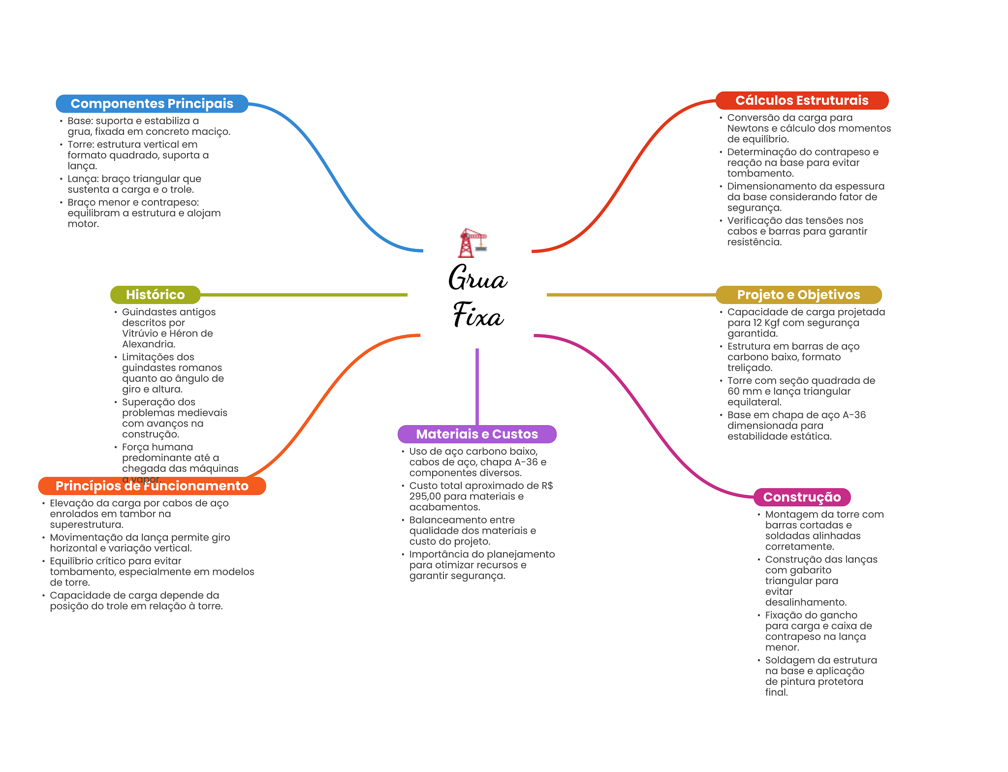 Componentes Principais Cálculos Estruturais Base: suporta e estabiliza a Conversão da carga para grua, fixada em concreto maciço. Newtons e cálculo dos momentos Torre: estrutura vertical em de equilíbrio. formato quadrado, suporta a Determinação do contrapeso e lança. reação na base para evitar tombamento. Lança: braço triangular que sustenta a carga e trole. Dimensionamento da espessura da base considerando fator de Braço menor e contrapeso: equilibram a estrutura e alojam segurança. motor. Verificação das tensões nos cabos e barras para garantir resistência. Grua Histórico Projeto e Objetivos Guindastes antigos Fixa Capacidade de carga projetada descritos por para 12 com segurança Vitrúvio e Héron de garantida. Alexandria. Estrutura em barras de aço Limitações dos carbono baixo, formato guindastes romanos treliçado. quanto ao ângulo de Torre com seção quadrada de giro e altura. 60 mm e lança triangular Superação dos equilateral. problemas medievais Base em chapa de aço A-36 com avanços na dimensionada para construção. Materiais e Custos estabilidade estática. Força humana Uso de aço carbono baixo, predominante até a cabos de aço, chapa A-36 e chegada das máquinas componentes diversos. Princípios de Funcionamento Custo total aproximado de R$ 295,00 para materiais e Elevação da carga por cabos de aço Construção acabamentos. enrolados em tambor na Balanceamento entre Montagem da torre com superestrutura. barras cortadas e qualidade dos materiais e Movimentação da lança permite giro soldadas alinhadas custo do projeto. horizontal e variação vertical. corretamente. Importância do planejamento Equilíbrio crítico para evitar Construção das lanças para otimizar recursos e tombamento, especialmente em modelos garantir segurança. com gabarito de torre. triangular para Capacidade de carga depende da evitar posição do trole em relação à torre. desalinhamento. Fixação do gancho para carga e caixa de contrapeso na lança menor. Soldagem da estrutura na base e aplicação de pintura protetora final.