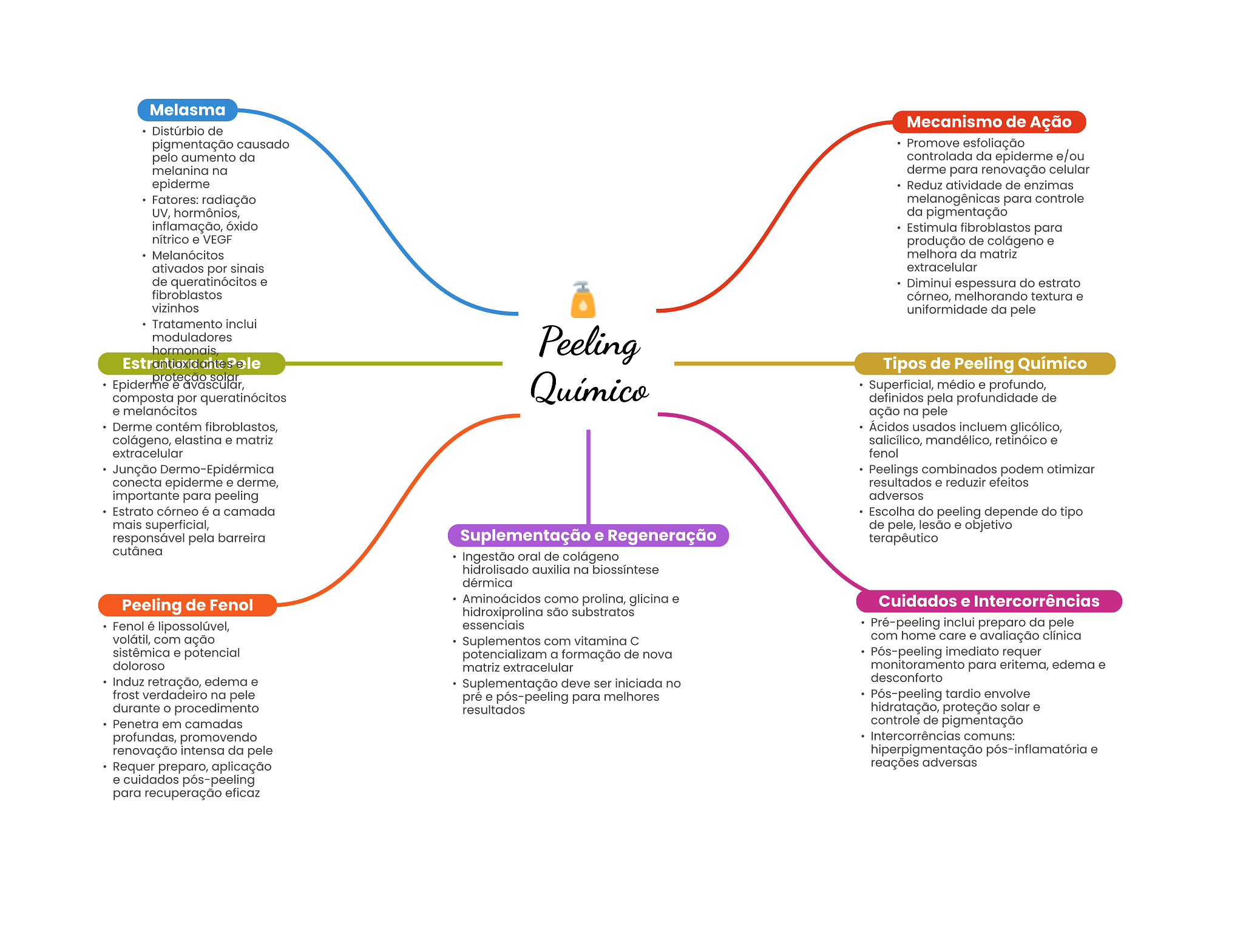 Melasma Distúrbio de Mecanismo de Ação pigmentação causado Promove esfoliação pelo aumento da controlada da epiderme e/ou melanina na derme para renovação celular epiderme Reduz atividade de enzimas Fatores: radiação melanogênicas para controle UV, hormônios, da pigmentação inflamação, óxido Estimula fibroblastos para nítrico e VEGF produção de colágeno e Melanócitos melhora da matriz ativados por sinais extracelular de queratinócitos e Diminui espessura do estrato fibroblastos córneo, melhorando textura e vizinhos uniformidade da pele Tratamento inclui moduladores hormonais Peeling Tipos de Peeling Químico proteção solar Epiderme e avascular, composta por queratinócitos Químico Superficial, médio e profundo, definidos pela profundidade de e melanócitos ação na pele Derme contém fibroblastos, Ácidos usados incluem glicólico, colágeno, elastina e matriz salicílico, mandélico, retinóico e extracelular fenol Junção Dermo-Epidérmica Peelings combinados podem otimizar conecta epiderme e derme, resultados e reduzir efeitos importante para peeling adversos Estrato córneo é a camada Escolha do peeling depende do tipo mais superficial, de pele, lesão e objetivo responsável pela barreira Suplementação e Regeneração terapêutico cutânea Ingestão oral de colágeno hidrolisado auxilia na biossíntese dérmica Peeling de Fenol Aminoácidos como prolina, glicina e Cuidados e Intercorrências hidroxiprolina são substratos Fenol é lipossolúvel, essenciais Pré-peeling inclui preparo da pele volátil, com ação Suplementos com vitamina C com home care e avaliação clínica sistêmica e potencial potencializam a formação de nova Pós-peeling imediato requer doloroso matriz extracelular monitoramento para eritema, edema e Induz retração, edema e Suplementação deve ser iniciada no desconforto frost verdadeiro na pele pré e pós-peeling para melhores Pós-peeling tardio envolve durante procedimento resultados hidratação, proteção solar e Penetra em camadas controle de pigmentação profundas, promovendo Intercorrências comuns: renovação intensa da pele hiperpigmentação pós-inflamatória e Requer preparo, aplicação reações adversas e cuidados pós-peeling para recuperação eficaz