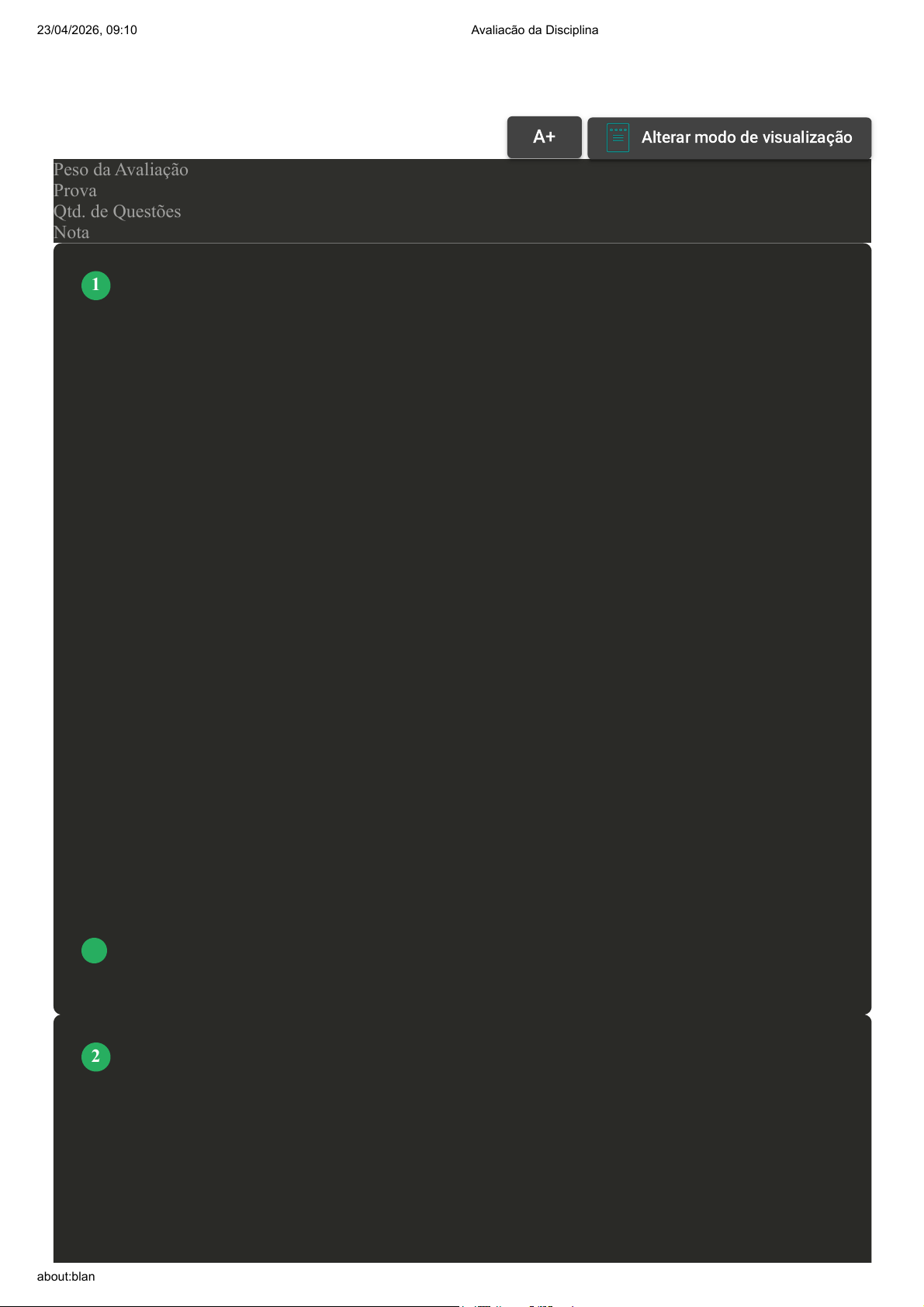 Prova Impressa GABARITO | Avaliacão da Disciplina (Cod.:644785) Peso da Avaliação 10,00 Prova 119709650 Qtd. de Questões 20 Nota 10,00 O trabalho cumpre diversas funções na vida das pessoas, isso é verdade, e nem sempre o lado positivo prevalece o tempo todo. Deste modo, a psicologia tem um papel importante junto à organização. Assinale V para verdadeiro e F para falso no que diz respeito às funções do psicólogo nas organizações de trabalho: ( ) O papel do psicólogo é cada vez mais fundamental nas organizações, pois cresce a necessidade de as pessoas conciliarem trabalho e família. ( ) O psicólogo é aquele que apesar de não ter poder decisório nas estratégias organizacionais, vai auxiliar com técnicas, as pessoas se adaptarem melhor ao trabalho a fim de trazerem mais lucratividade para os negócios da empresa. ( ) A atuação do psicólogo nas organizações não fica restrita à organização e seus processos, nem mesmo aos indivíduos em sua particularidade, mas se ocupa da reflexão sobre os impactos do trabalho na vida social. ( ) Para que um psicólogo consiga auxiliar de forma efetiva as organizações, ele necessita compreender a cultura dos gestores, os fenômenos sociais da sua época e se preocupar com questões de saúde, bem-estar, qualidade de vida de todos os membros da organização. Assinale a alternativa que apresenta a sequência correta: A F–V–F–V. B V–V–F–F. C F–F–V–V. D V–F–V–V. Sobre o mobbing, marque a opção abaixo que converge com seu conceito: A Seu conceito tem a ver com a dificuldade de mobilidade dentro das organizações, pois hoje os ambientes de trabalho não preveem a ergonomia. B É assédio moral no trabalho e tem a ver com as relações afetivas dentro da organização, principalmente as relações amorosas que se desenvolvem no ambiente de trabalho e trazem VOLTAR A+Aumentar, FonteAlterar modo de visualização 1 2 23/04/2026, 09:10 Avaliacão da Disciplina about:blank 1/11 frustrações. C O líder não tem relação com o aparecimento do assédio moral no trabalho. D Mobbing é uma das principais fontes de estresse, e foi através dos estudos sobre os fatores estressores no ambiente de trabalho que se chegou ao seu conceito. A subjetividade é o objeto de estudo da psicologia, seja no contexto de saúde, ou no contexto organizacional. Muitos gestores não têm o conhecimento da dimensão que o psicólogo pode auxiliar à organização, e ficam restritos a contratá-lo para fins de seleção de pessoal e treinamento. Ao ter foco na subjetividade, o psicólogo pode... Assinale a alternativa que completa a frase corretamente: A Legitimar sua função na empresa que não é a de recrutamento e seleção. B Autorizar-se a trabalhar com intervenções frente aos transtornos mentais, oferecer mudanças, traduzindo os interesses do trabalhador e os interesses da produção numa interface possível e não adoecedora. C Ter mais liberdade de trabalho, fazendo o seu horário dentro da organização e flexibilizando alternadamente os horários de alguns colaboradores que estiverem sob efeito de estresse. D Propor grupos terapêuticos com aqueles colaboradores que demonstrarem alguma psicopatologia diagnosticada junto ao médico do trabalho. Sobre as características da liderança, relacione as colunas abaixo: 1. Este tipo de liderança é exercido com a intenção de proteger e de cuidar do conforto e bem-estar dos seguidores. 2. Neste tipo de liderança os procedimentos são apresentados ao grupo antes de serem introduzidos. 3. O líder decide o que será feito e não informa previamente aos seus liderados. ( ) Liderança Democrática. ( ) Liderança Autoritária. ( ) Liderança Servidora. Assinale a alternativa com a sequência correta: 3 4 23/04/2026, 09:10 Avaliacão da Disciplina about:blank 2/11 A 2,3,1. B 2,1,3. C 1,2,3. D 3,1,2. Muitos autores desenvolvem seus achados sobre liderança e citam o narcisismo como um componente presente na vida de muitos líderes. Sobre isso, analise as asserções abaixo: O lado negativo da liderança é quando o narcisismo do líder, importante para a manutenção da equipe, é supervalorizado por aquele que lidera, partindo para uma liderança disfuncional. PORQUE O narcisismo significa o amor a si próprio, que todos devemos ter para nos manter na relação com o outro e com o mundo. Porém, muitas pessoas, como diria o Mito do Narciso, afogam-se com a imagem de si mesmas. Assinale a alternativa correta: A As duas afirmativas são verdadeiras, e não estabelecem uma relação entre si. B A primeira afirmativa é falsa e a segunda, verdadeira. C A primeira afirmativa é verdadeira e a segunda, falsa. D As duas afirmativas são verdadeiras, e a segunda é uma justificativa correta da primeira. Jacques Christophe Dejours estudou sobre as psicopatologias do trabalho e promoveu contribuições à saúde mental, principalmente ao pesquisar sobre o trabalhador e as relações trabalhistas. Para ele, a organização do trabalho exerce sobre o homem a ação específica, cujo impacto é o aparelho psíquico. PORQUE 5 6 23/04/2026, 09:10 Avaliacão da Disciplina about:blank 3/11 Em certas condições emerge um sofrimento que pode ser atribuído ao choque entre uma história individual, portadora de projetos, de esperanças e de desejos e uma organização do trabalho que os ignora. Sobre essas duas questões é correto afirmar que: A As duas afirmativas são falsas. B A primeira é uma afirmativa verdadeira e a segunda, uma afirmativa falsa. C A primeira é uma afirmativa falsa e a segunda, uma afirmativa verdadeira. D As duas são verdadeiras, e estabelecem uma relação entre si. No complexo cenário laboral moderno, a interação entre as condições de trabalho e a saúde dos trabalhadores requer atenção especial. As dinâmicas organizacionais e as relações interpessoais influenciam diretamente a experiência dos indivíduos no ambiente profissional, afetando seu bem- es