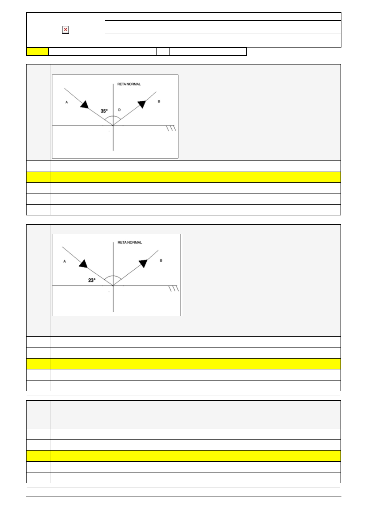 23/04/2026 10:46:02 1/3 REVISÃO DE SIMULADO Nome: LUIZ EDUARDO SOARES DA SILVA Disciplina: Física II Respostas corretas são marcadas em amarelo X Respostas marcardas por você. Questão 001 Qual é o ângulo de incidência no esquema abaixo? A) 45° X B) 35º C) 30° D) 25º E) 55° Questão 002 Qual é o ângulo de incidência no esquema abaixo? X A) 90° B) 65° C) 67° D) 39° E) 23° Questão 003 A Óptica Geométrica é a área da Física que estuda os fenômenos relacionados à radiação e sua interação com a matéria. Dos fenômenos abaixo, aquele que diz respeito à óptica é: X A) Aumento da temperatura. B) Aumento de volume. C) Desvio dos raios luminosos. D) Decaimento quântico. E) Redução da pressão. 23/04/2026 10:46:02 2/3 Questão 004 Sobre o fenômeno da reflexão, podemos afirmar que: A) Este fenômeno pode ocorrer em qualquer material. X B) Os raios de incidência e reflexão estão no mesmo plano. C) Os raios de incidência e reflexão estão em planos diversos D) O raio de incidência varia com a velocidade E) O ângulo de reflexão varia com o índice de refração Questão 005 Leia o trecho abaixo: Durante o dia o céu é azul, embora em determinadas regiões e horários específicos podemos enxergá-lo com outras cores ou um conjunto delas, como amarelo e laranja, ou laranja e vermelho. As cores que enxergamos no céu evidencia-nos um dos comportamentos que a luz solar adquire quando adentra no planeta Terra. Este fenômeno foi estudado por Rayleigh no final do século XIX e nos deu um entendimento físico completo do porquê, por exemplo, enxergamos o céu azul. Adaptado de WALKER, J. O grande circo da física. Trad. Jorge Antonio Valadares. Grandiva publicações: Lisboa, 2001. Diante das informações apresentadas, avalie as afirmativas abaixo: I. A cor que observamos depende do fenômeno óptico chamado de dispersão da luz. II. Dentre os fatores que influenciam a cor que observamos no céu estão a posição na superfície que estamos, a umidade do ar e gases atmosféricos. III. A cor do céu observado será a mesma qualquer que seja o dia e a temperatura do local de onde se observa. É correto o que se afirma em A) II e III, apenas. X B) I e II, apenas. C) III, apenas. D) I, apenas. E) II, apenas. Questão 006 Considerando o índice de refração = 1, qual é o índice de refração do vidro representado no esquema abaixo? A) 2 X B) √2 C) 4 D) 3 E) √3 23/04/2026 10:46:02 3/3 Questão 007 Em um laboratório foi representada a seguinte imagem: Fonte: o autor. Qual é o fenômeno óptico representado pela imagem? A) Refração luminosa. B) Dispersão luminosa. X C) Difração luminosa. D) Reflexão luminosa. E) Absorção luminosa. Questão 008 Em um laboratório foi representada a seguinte imagem: Fonte: o autor. Qual é o fenômeno óptico representado pela imagem acima? A) Refração da luz. B) Absorção da luz. C) Dispersão da luz. X D) Difração da luz. E) Reflexão da luz.