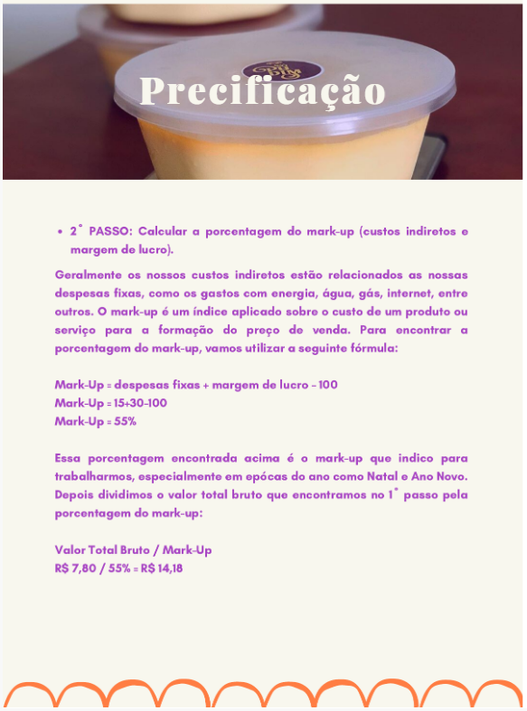 Precificação PASSO: Calcular a porcentagem do mark-up (custos indiretos e margem de lucro). Geralmente os nossos custos indiretos estão relacionados as nossas despesas fixas, como os gastos com energia, água, gás, internet, entre outros. O mark-up é um índice aplicado sobre custo de um produto ou serviço para a formação do preço de venda. Para encontrar a porcentagem do mark-up, vamos utilizar a seguinte fórmula: Mark-Up despesas fixas + margem de lucro 100 Mark-Up = 15+30-100 Mark-Up 55% Essa porcentagem encontrada acima é mark-up que indico para trabalharmos, especialmente em epócas do ano como Natal Ano Novo. Depois dividimos valor total bruto que encontramos no passo pela porcentagem do mark-up: Valor Total Bruto / Mark-Up R$ 7,80 / 55% R$ 14,18